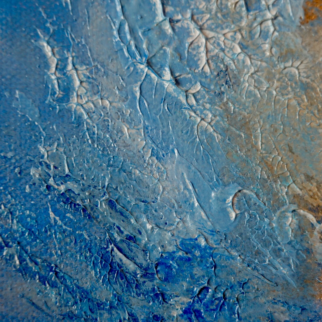 制作は画材を重ね表現することを大切にしています。アクリル、大理石パウダー、モデリングペーストを使い、キャンバスを彫刻するように立体的な質感をつくっています。重なった層は、人の感情のように、時間とともに積み上がり、ときに削られ、内側をそっと見せてくれます。