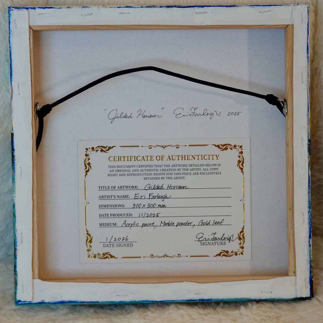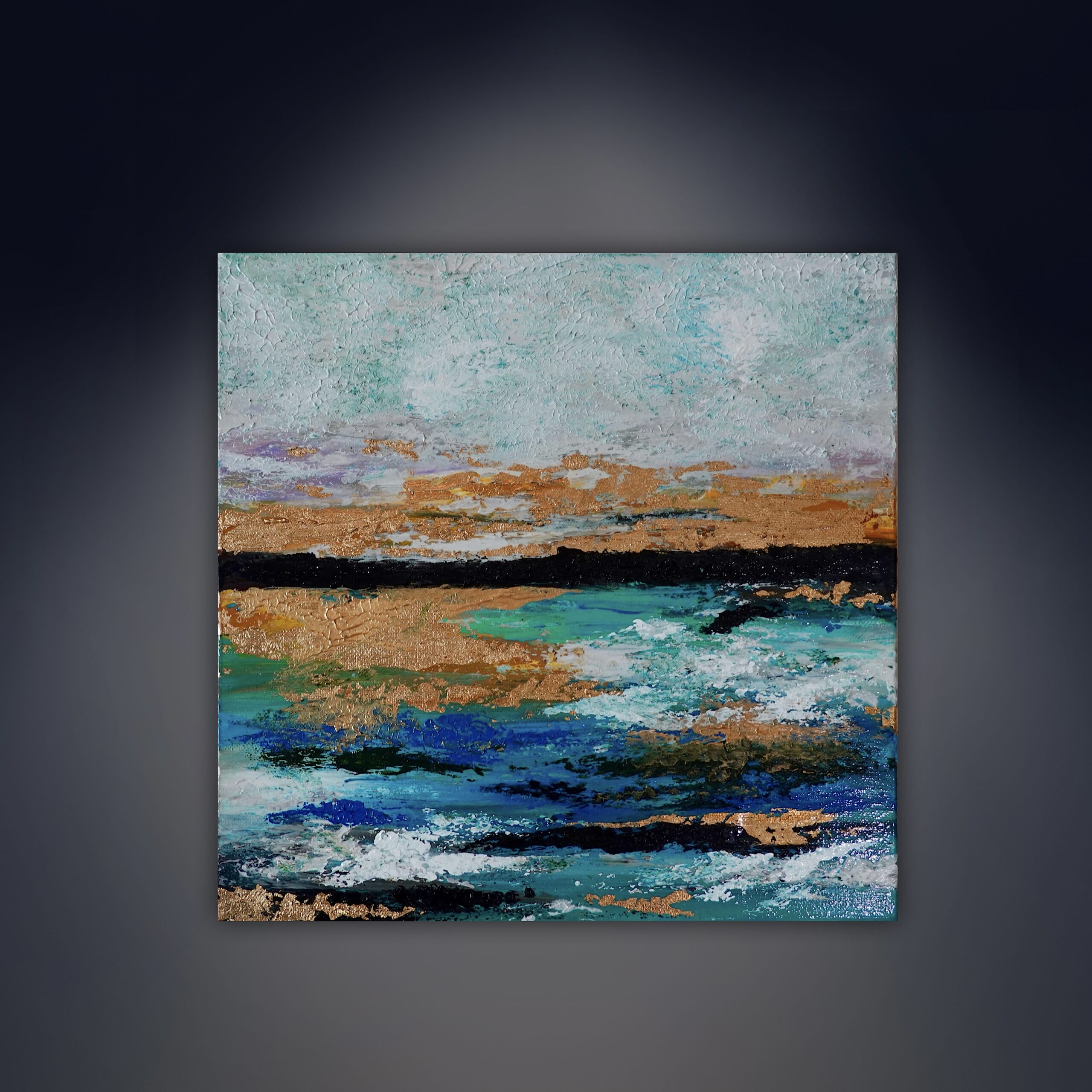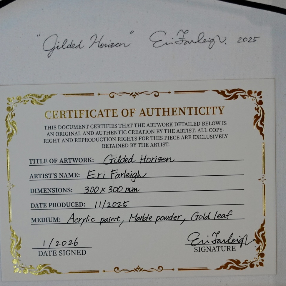 「Gilded Horizo​​ns」は、大地と光の出会いを探求した抽象的な風景画です。大理石のパウダーを混ぜ込んだアクリル絵具でテクスチャーのある表面を生み出し、繊細な金箔が輝きと時代を超えた感覚をもたらします。光沢のある仕上げは奥行きと​​反射を強調し、変化する光に合わせて構図が微妙に変化します。