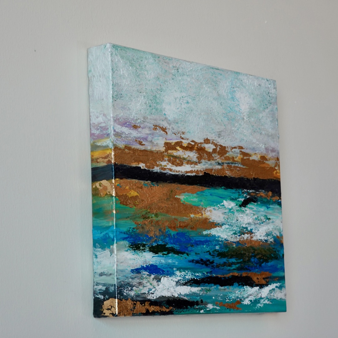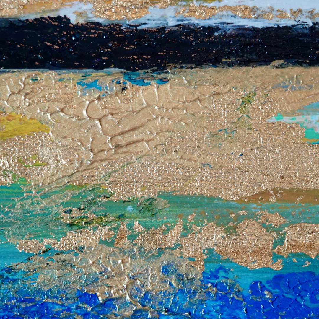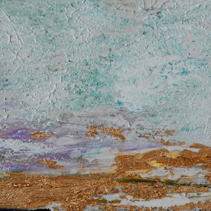 「Gilded Horizo​​ns」は、大地と光の出会いを探求した抽象的な風景画です。大理石のパウダーを混ぜ込んだアクリル絵具でテクスチャーのある表面を生み出し、繊細な金箔が輝きと時代を超えた感覚をもたらします。光沢のある仕上げは奥行きと​​反射を強調し、変化する光に合わせて構図が微妙に変化します。