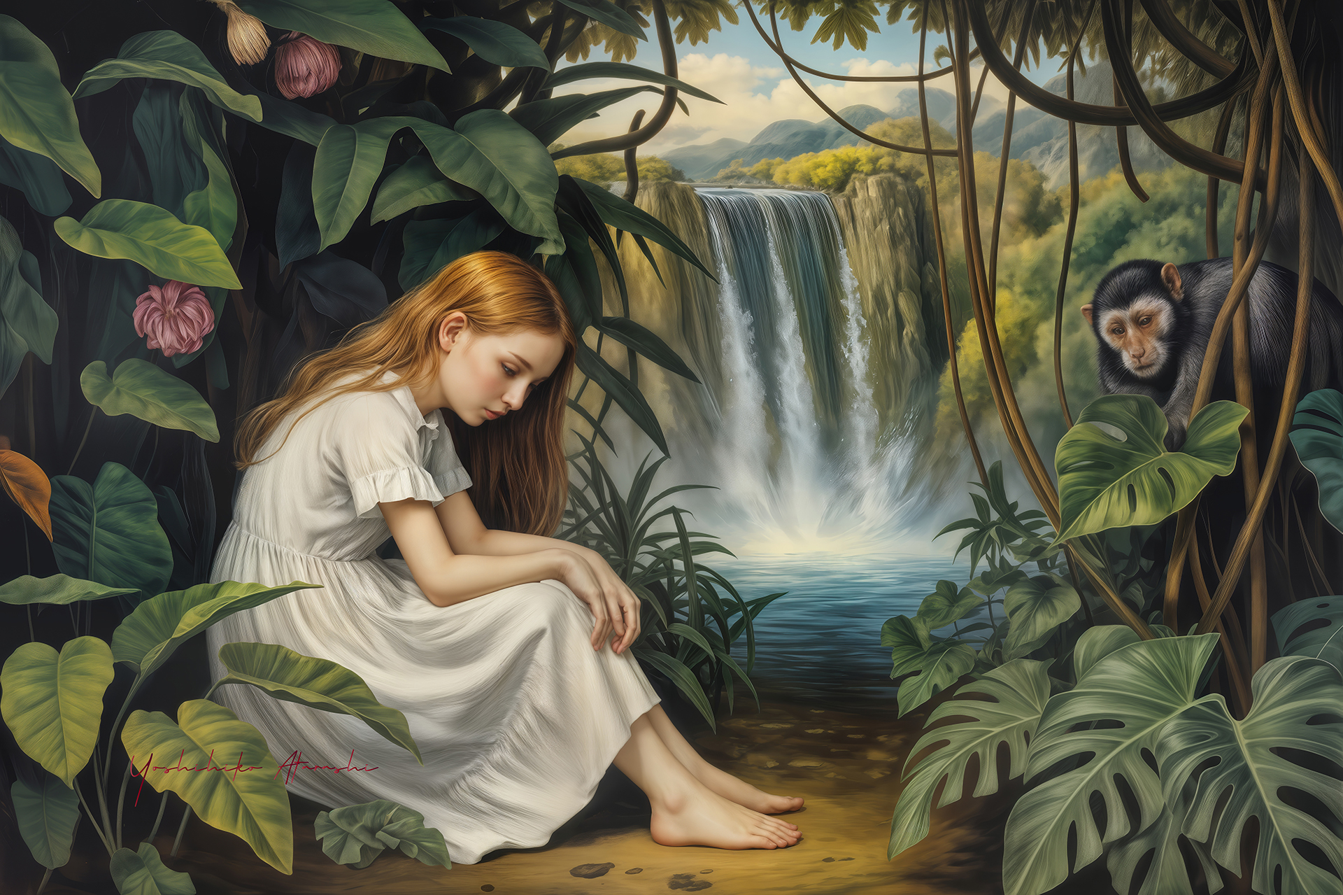 深いジャングルに佇む少女と動物たちを描いた作品群は、静謐でありながら生命の息吹を感じさせます。瑞々しい緑と透明感ある光の表現は、 観る者を幻想的な世界へ誘います。無垢な少女の姿は自然との共生を象徴し、心に安らぎをもたらす逸品です。