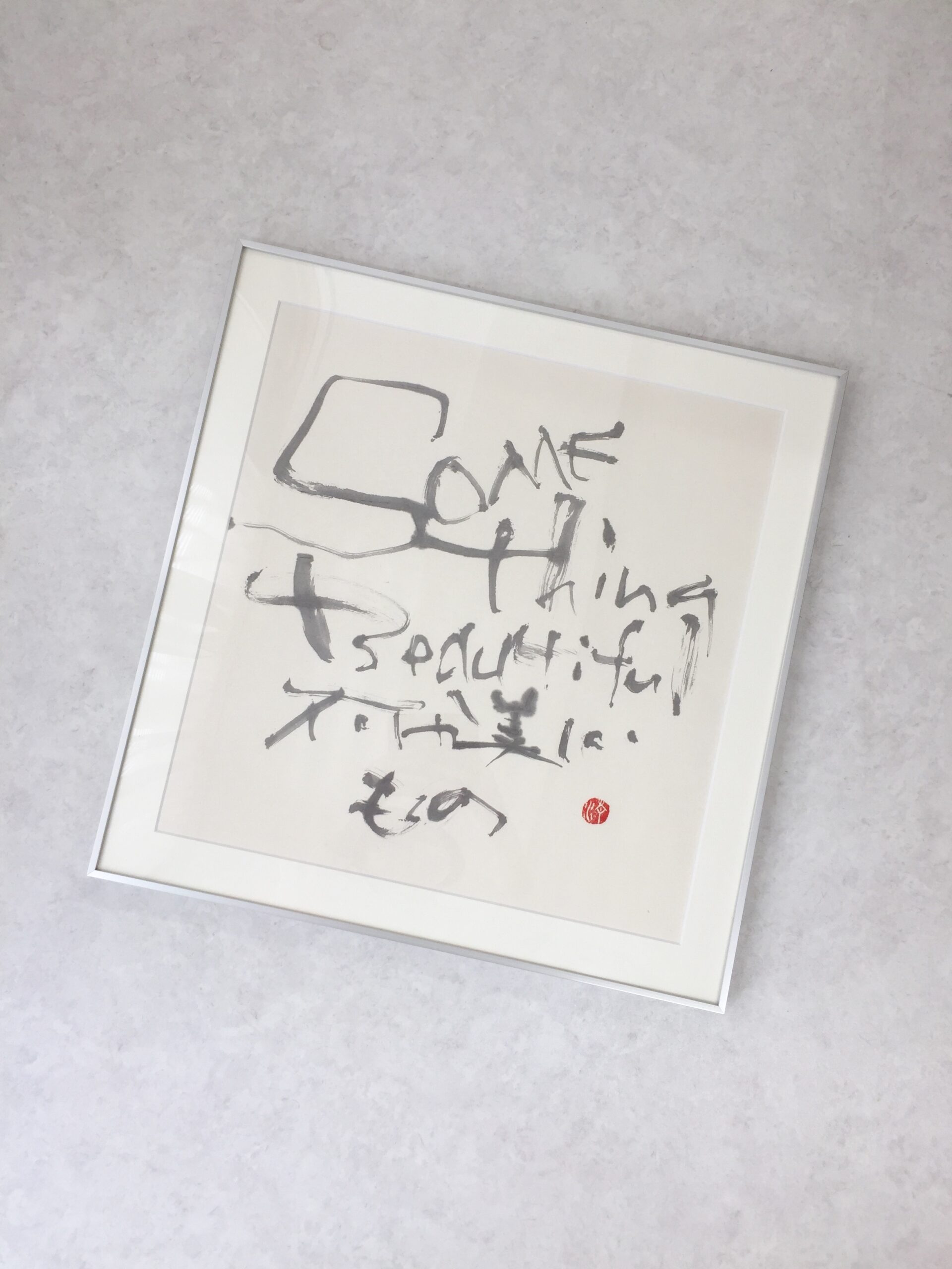 A deliberately distorted typeface that maintains legibility. Lines that seem uncalculated, yet capture the very fluctuations of emotion, quietly touch the viewer’s sensibility. The contrast with the nearly square, formal mounting highlights the calligraphy’s 「imperfection」, bringing tension and negative space to the room.