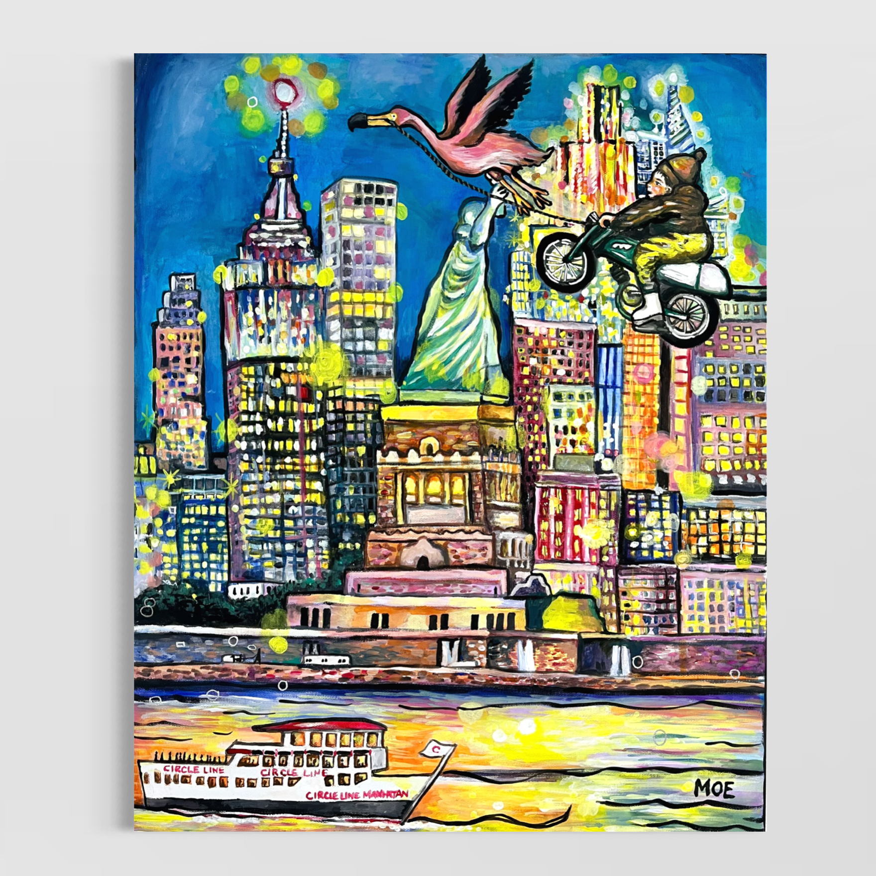 バイクに乗って、空飛ぶ魔法のフラミンゴに引っ張られて飛んでいる少年は