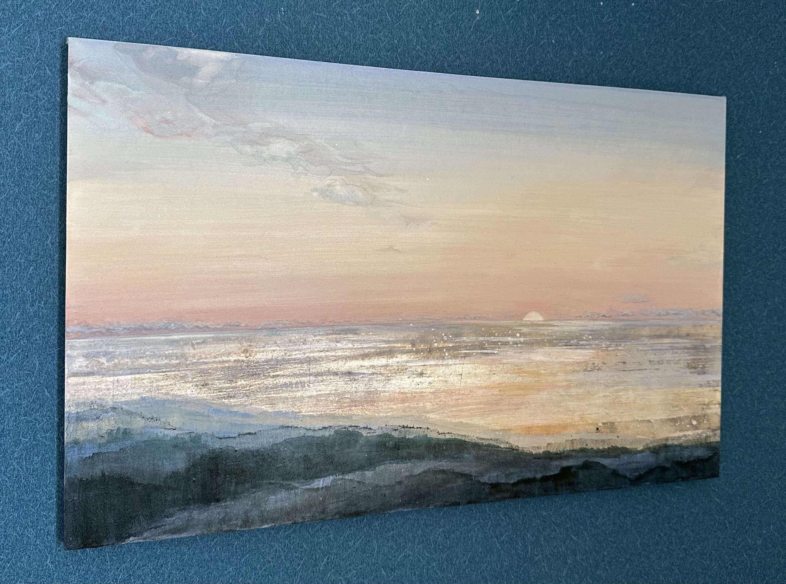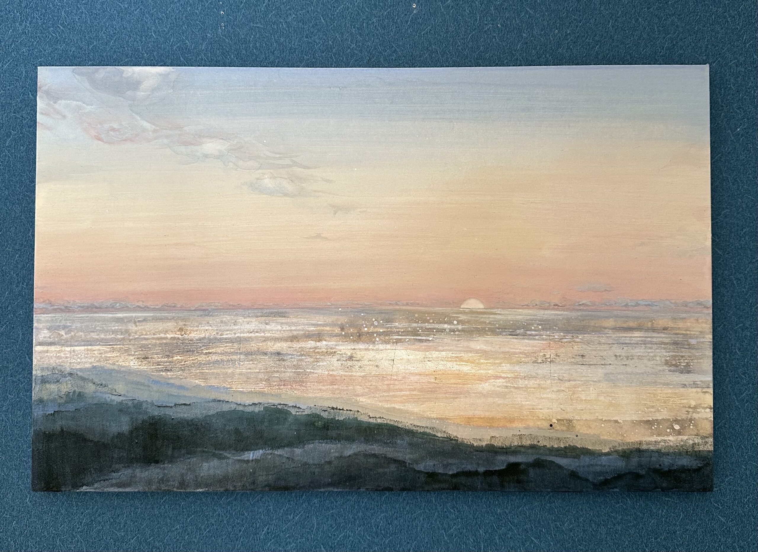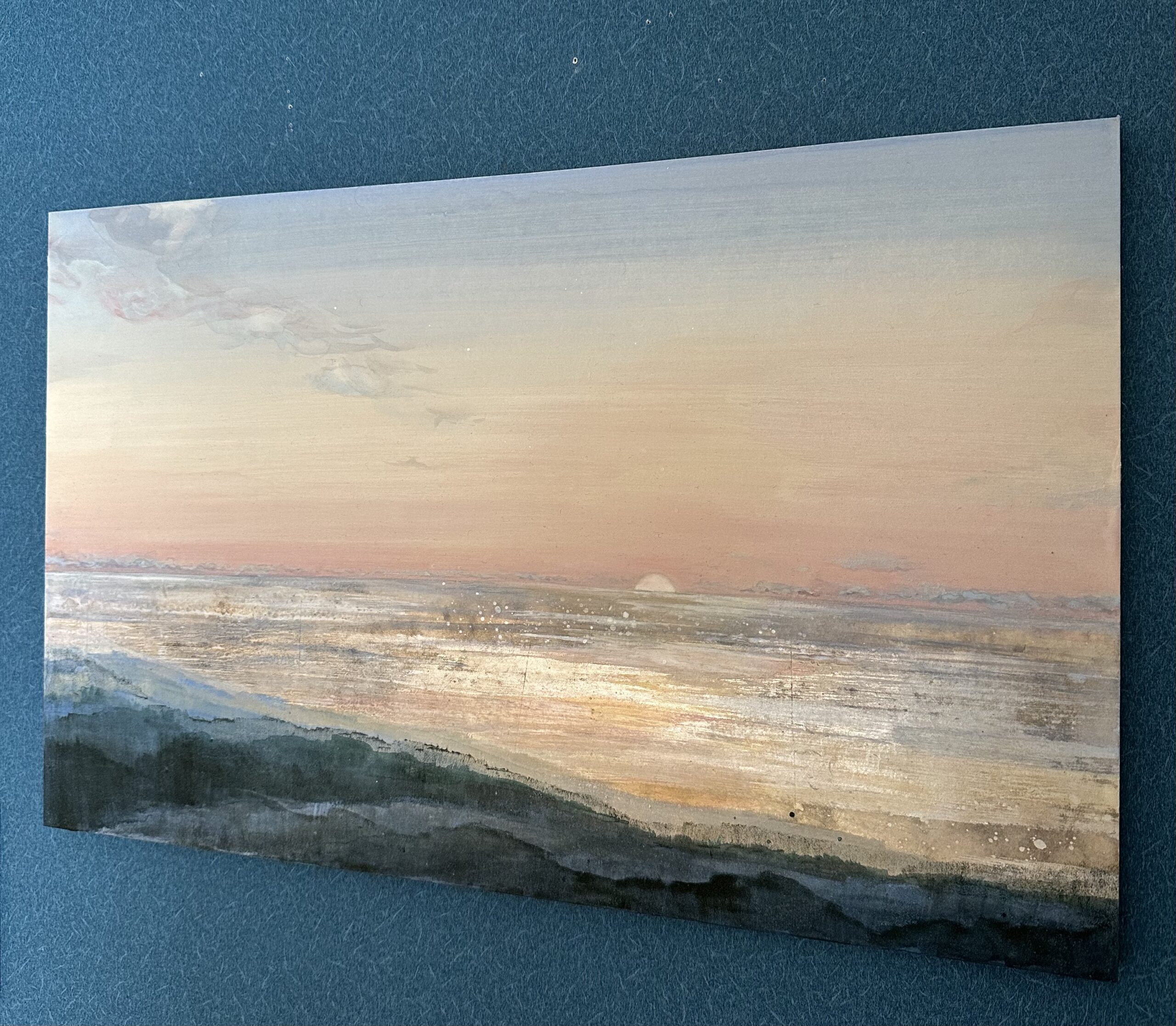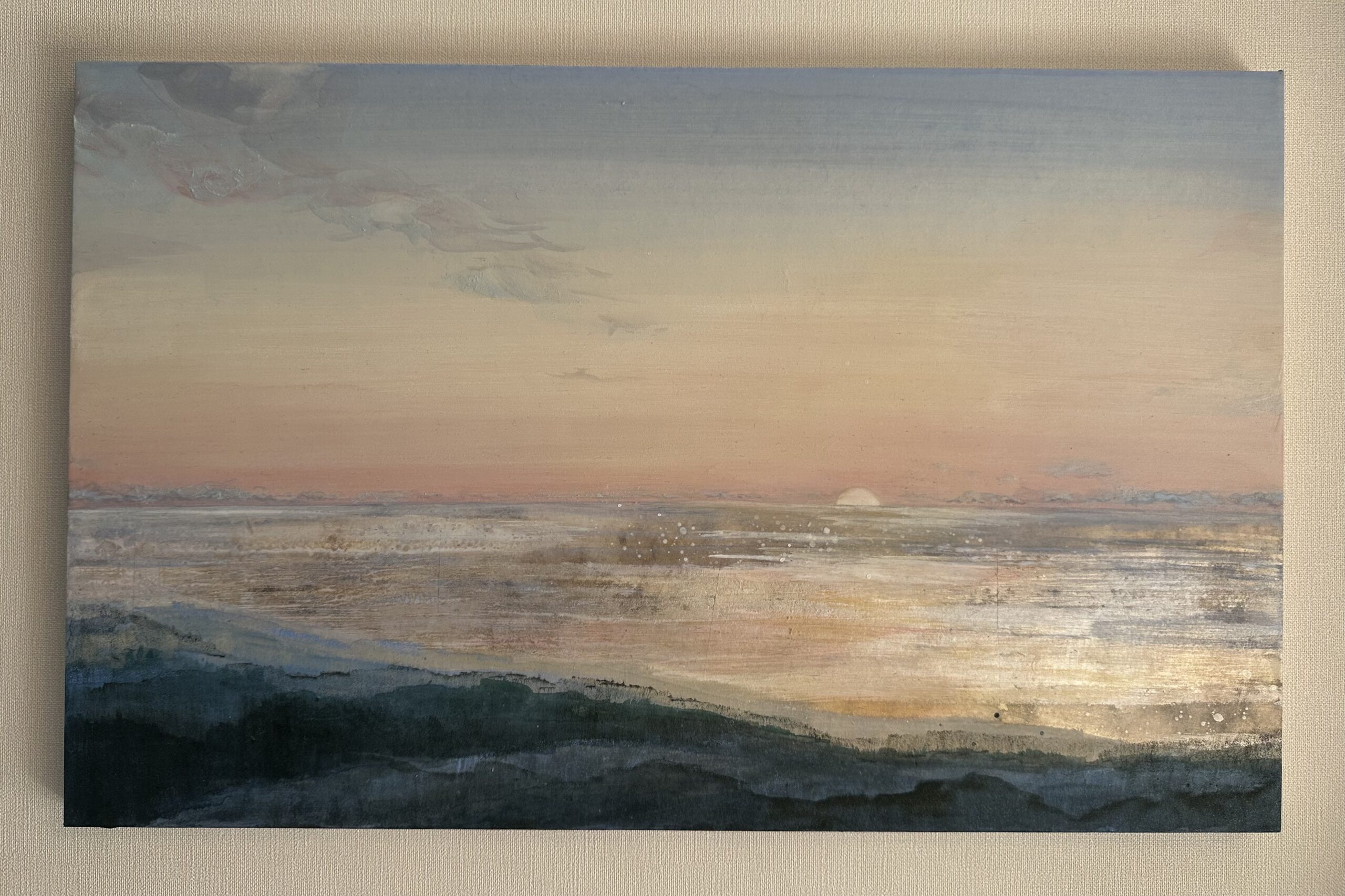 子どもの頃に畦道で摘んだ草花の色、鏡のような静かな海の色、名残惜しい夕日の色…。岩絵具の美しい色の粒子を使うことで、いろいろな色を表現できそうな気がして、日本画制作を始めました。