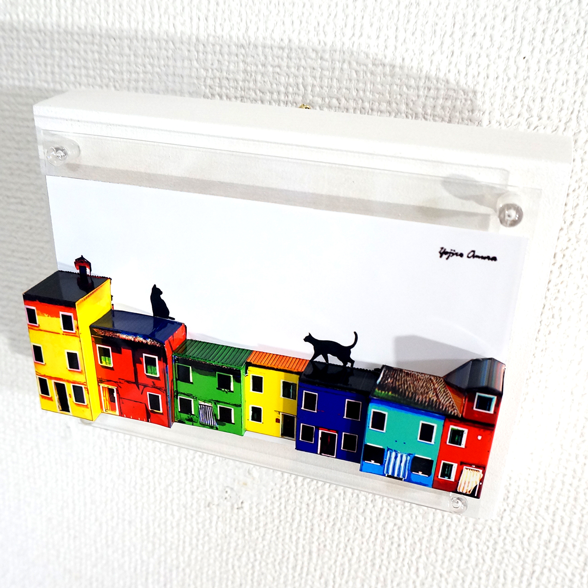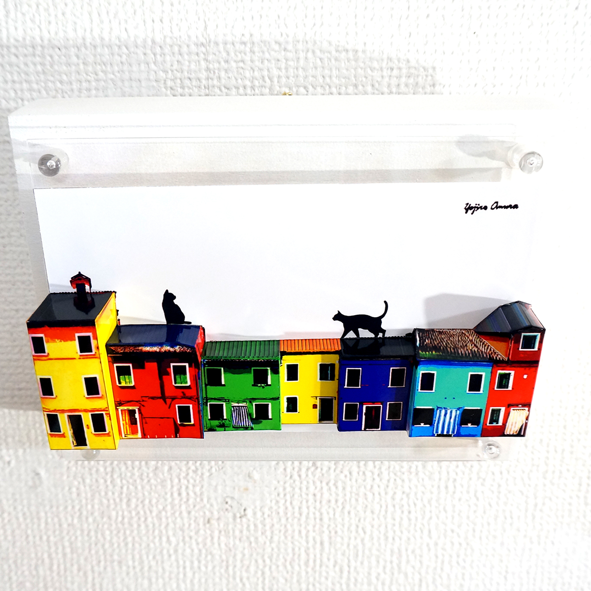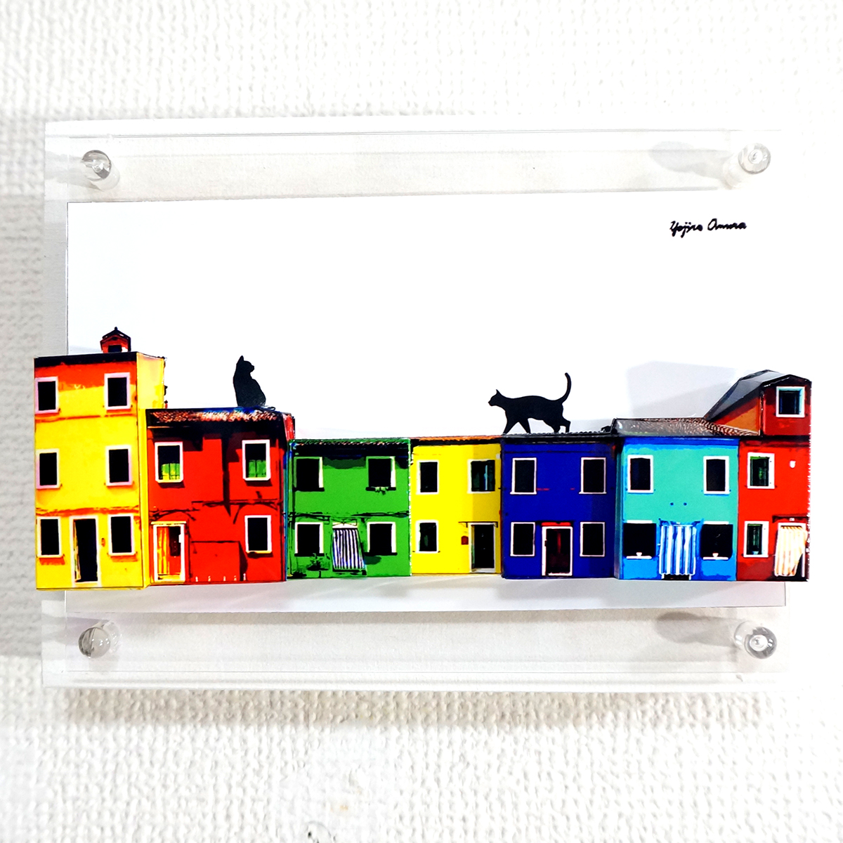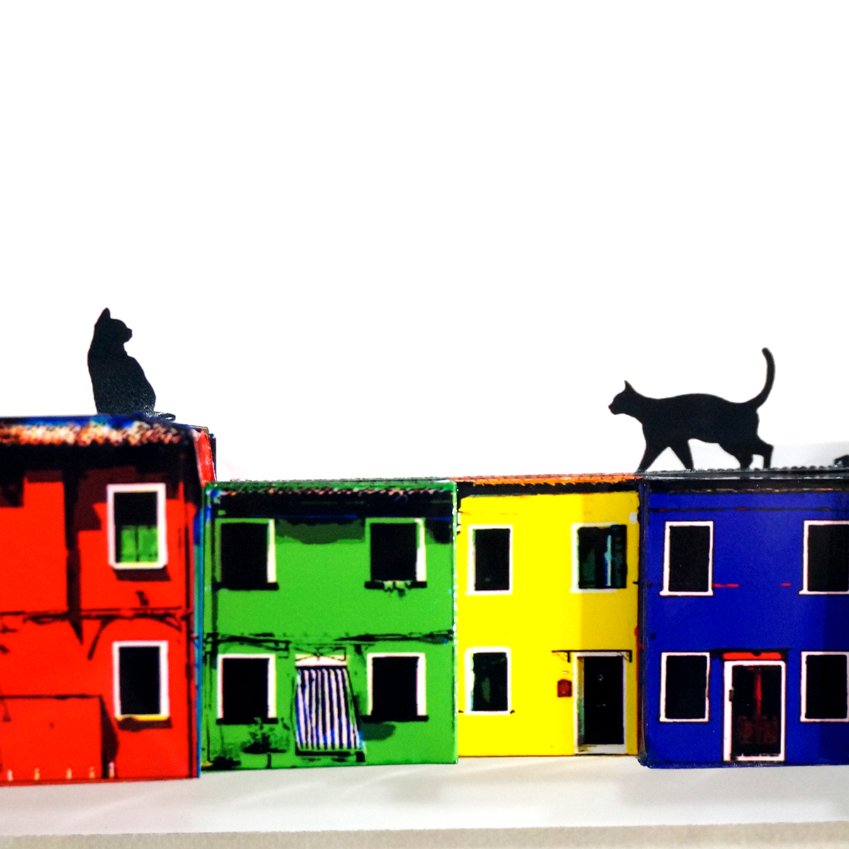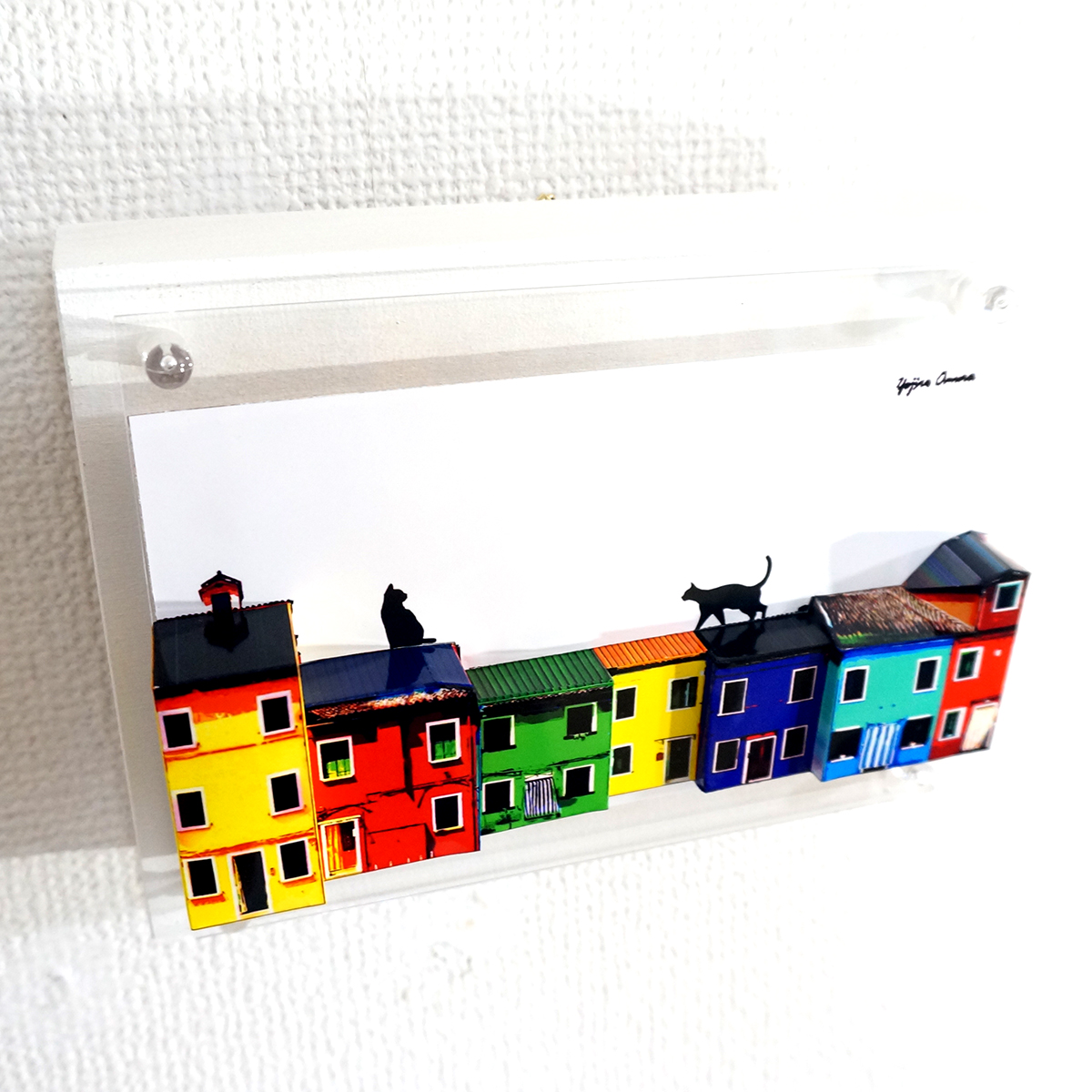 猫の部分を平面に残し、家を手前に立体化しております。