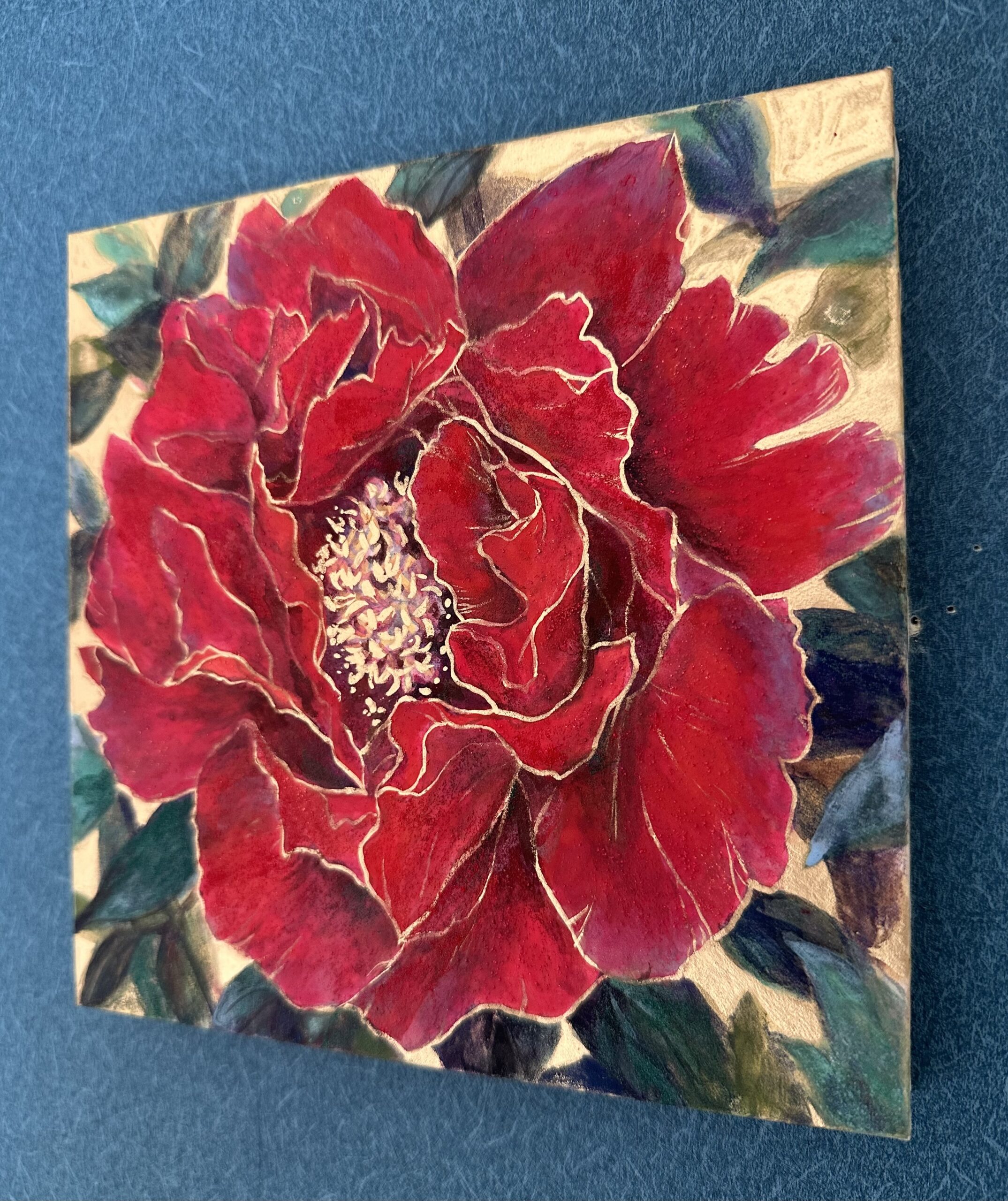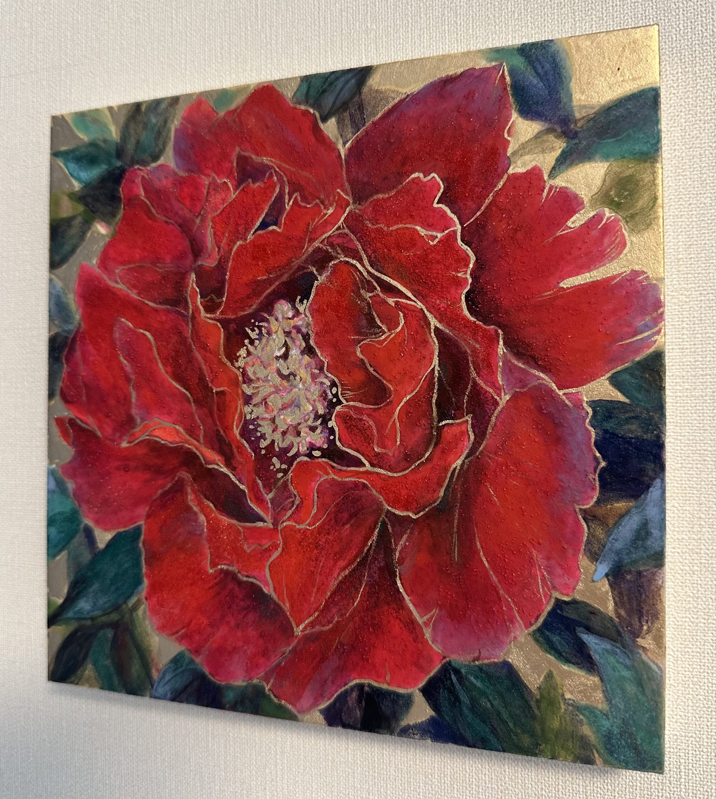 箔を使用した作品は、光のあたり方によって輝き方が変わります。日中の窓から入る自然光、夜の照明の光など、光の違いにより表情がかなり変わります。また、箔の変色を抑えるためのコーティングをしておりますが、時間経過とともに少しずつ色味が変化します。その変化もお楽しみいただけますと幸いです。