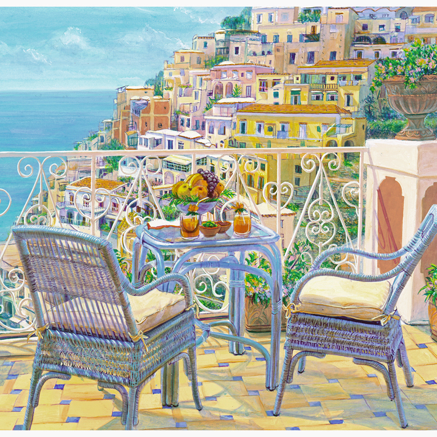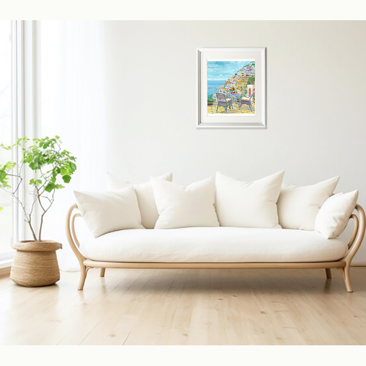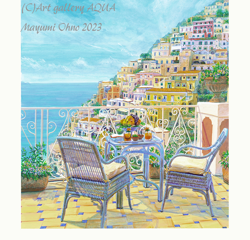 こちらは南イタリア 世界遺産に登録されたアマルフィ海岸のポジターノです。カラフルな建物が海沿いの絶壁に建つオシャレなリゾート。 ラタン椅子はかなり時間をかけて丁寧に描きましたので臨場感があるのか 椅子に座って テラスから眺めている気分になるとご感想頂くこともあります。地中海の光と色をお届けできれば。。