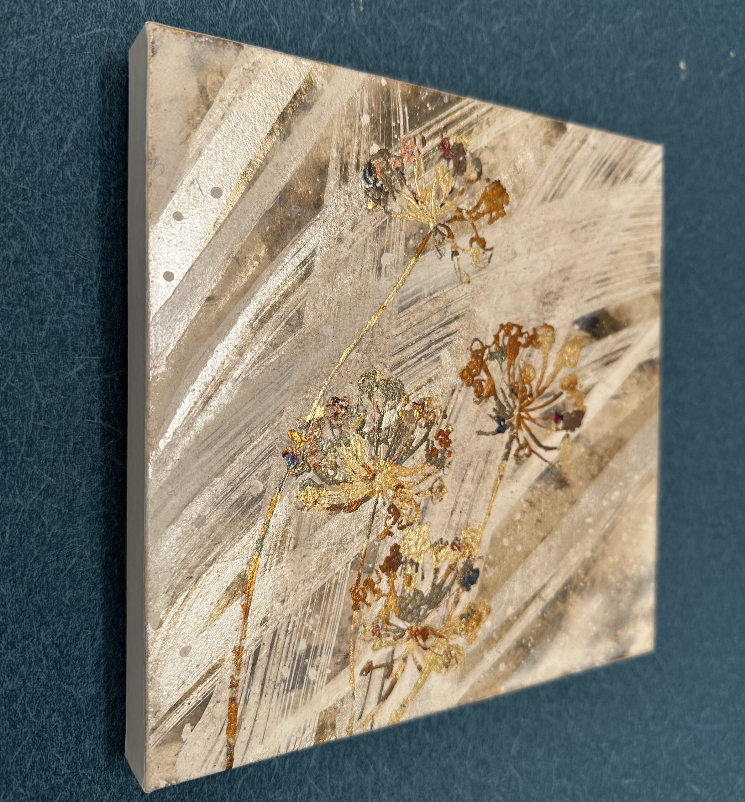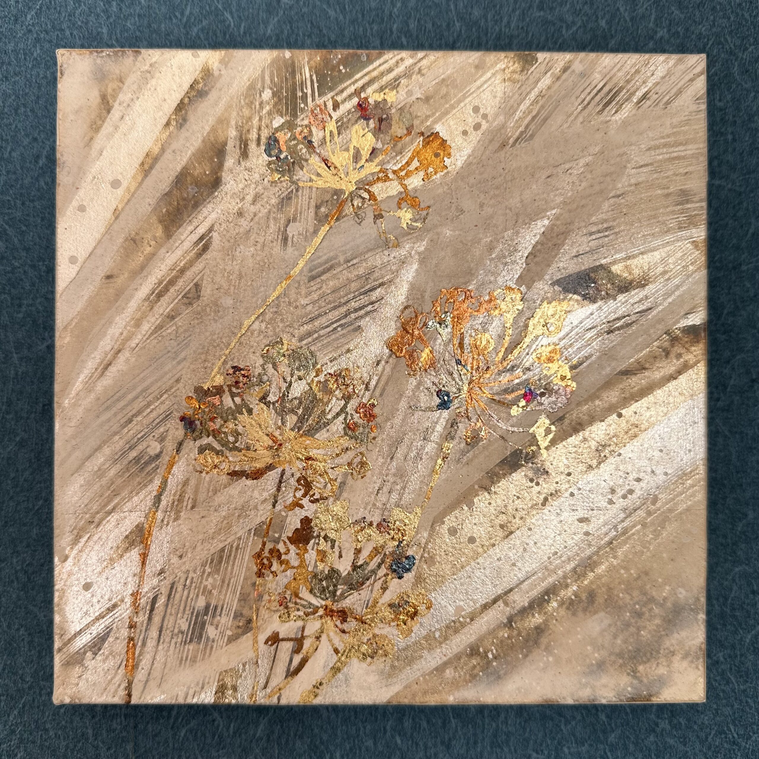 箔を使用した作品は、光のあたり方によって輝き方が変わります。日中の窓から入る自然光、夜の照明の光など、光の違いにより表情がかなり変わります。また、箔の変色を抑えるためのコーティングをしておりますが、時間経過とともに少しずつ色味が変化します。その変化もお楽しみいただけますと幸いです。