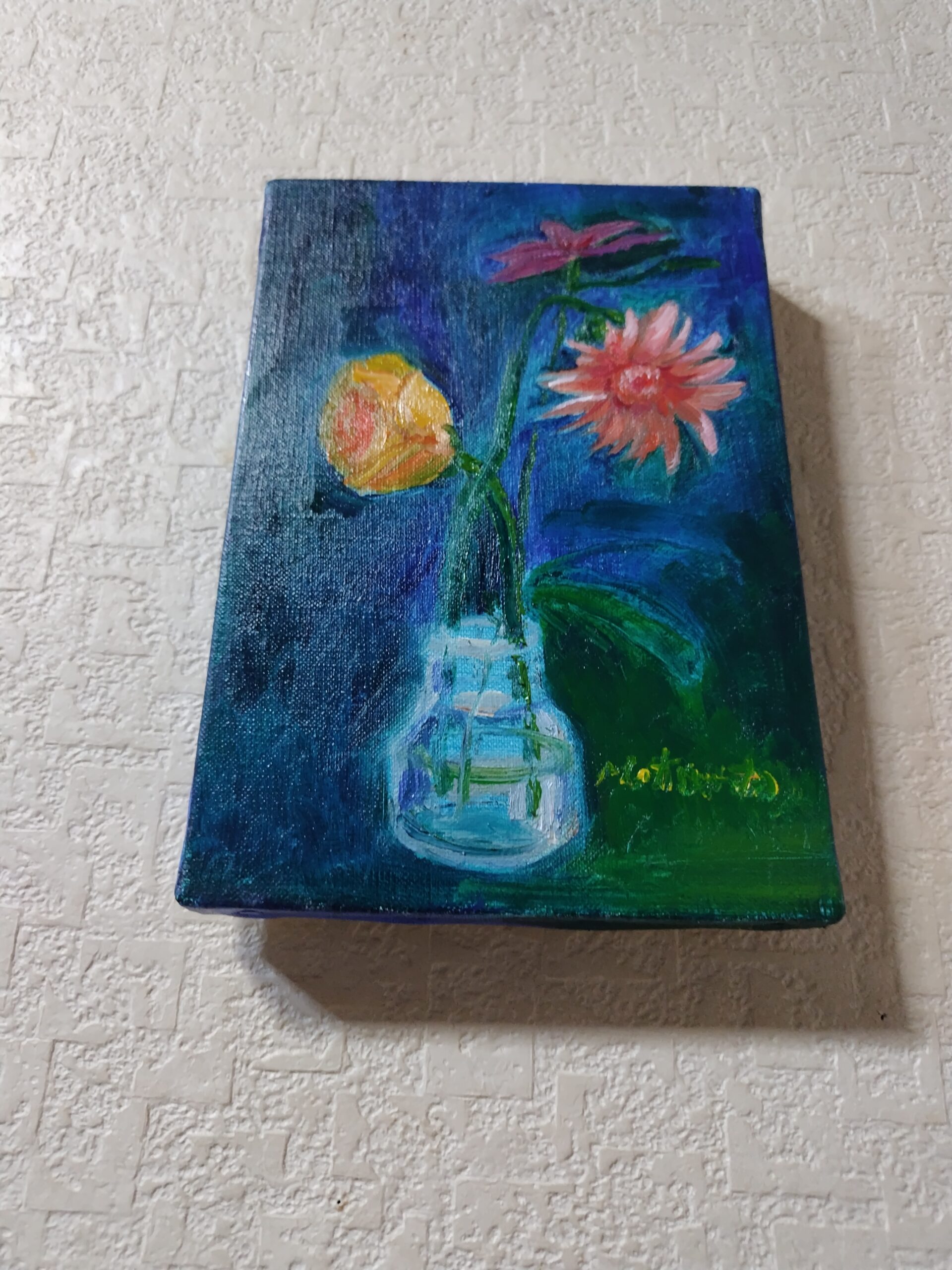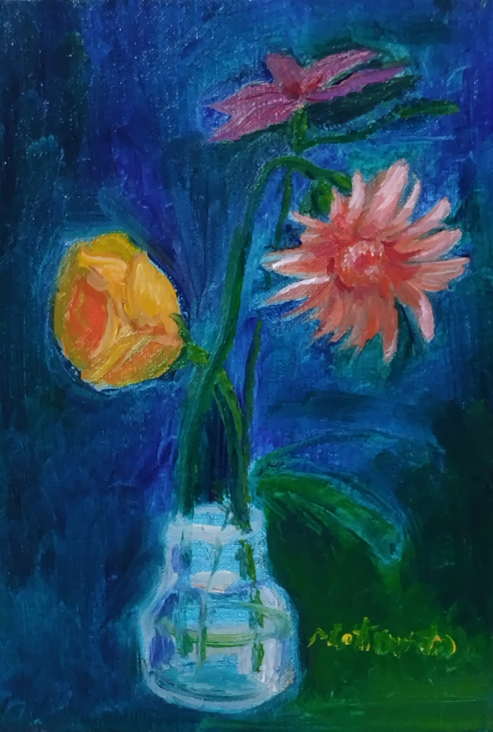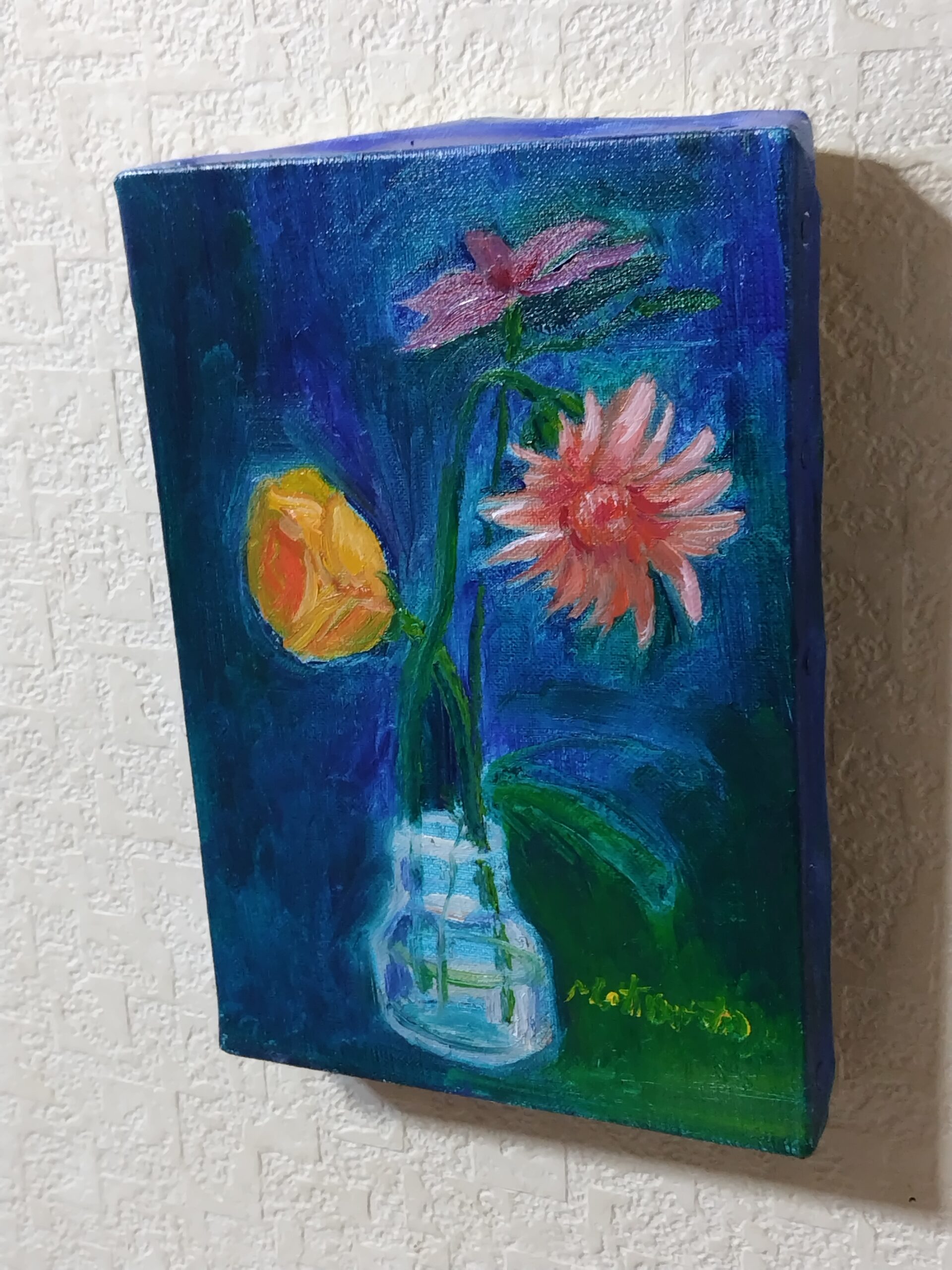 この冬、ガーベラとラナンキュラス、リューココリーネを花屋さんで買って、油絵具で描きました。花の色合いに気を使い、お部屋が明るくなるようにカラフルな色調で仕上げました。寒い冬でも凛と咲く花を見れば人の気分も引き締まります。毎日の生活に張りを感じていただければ嬉しいです。