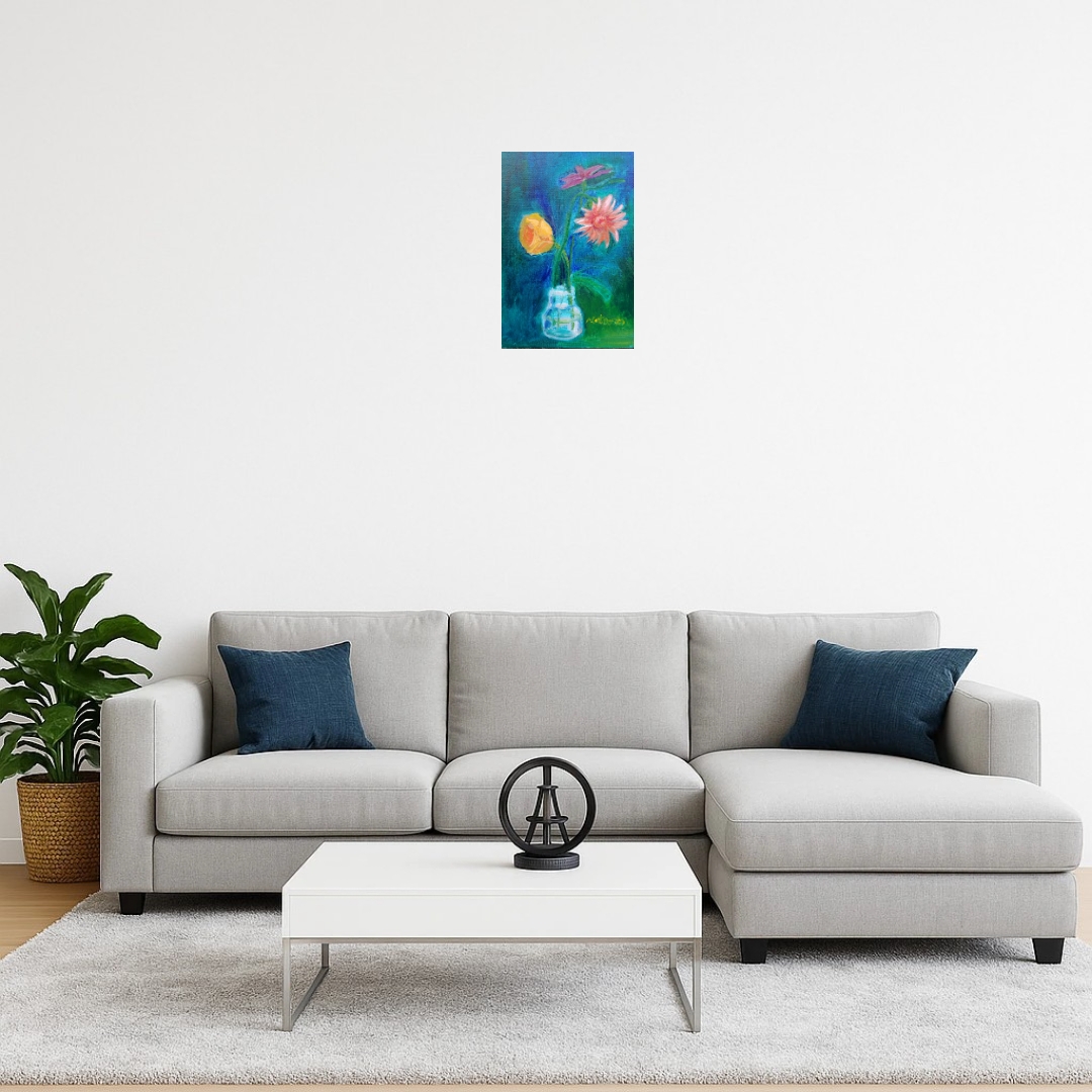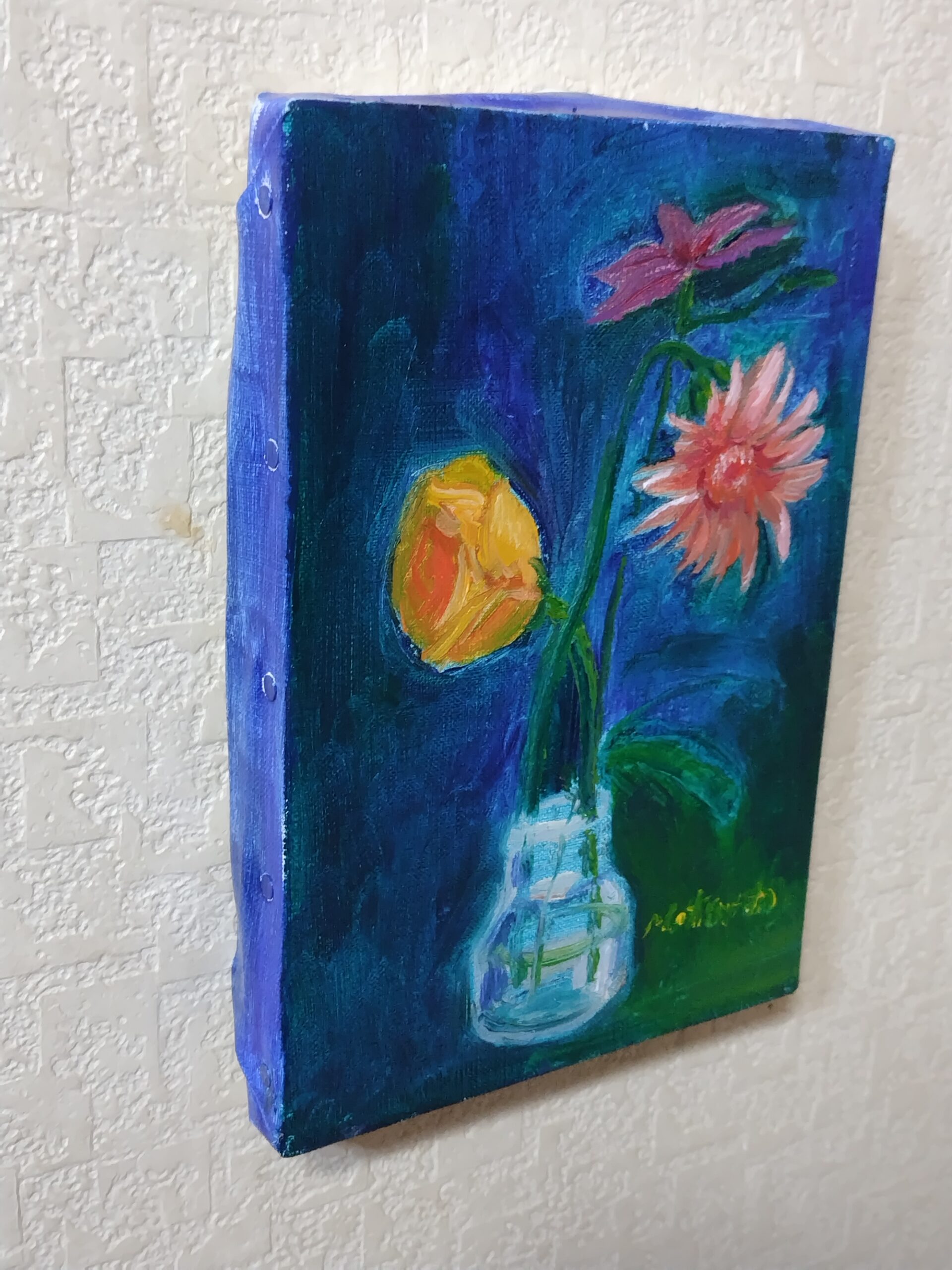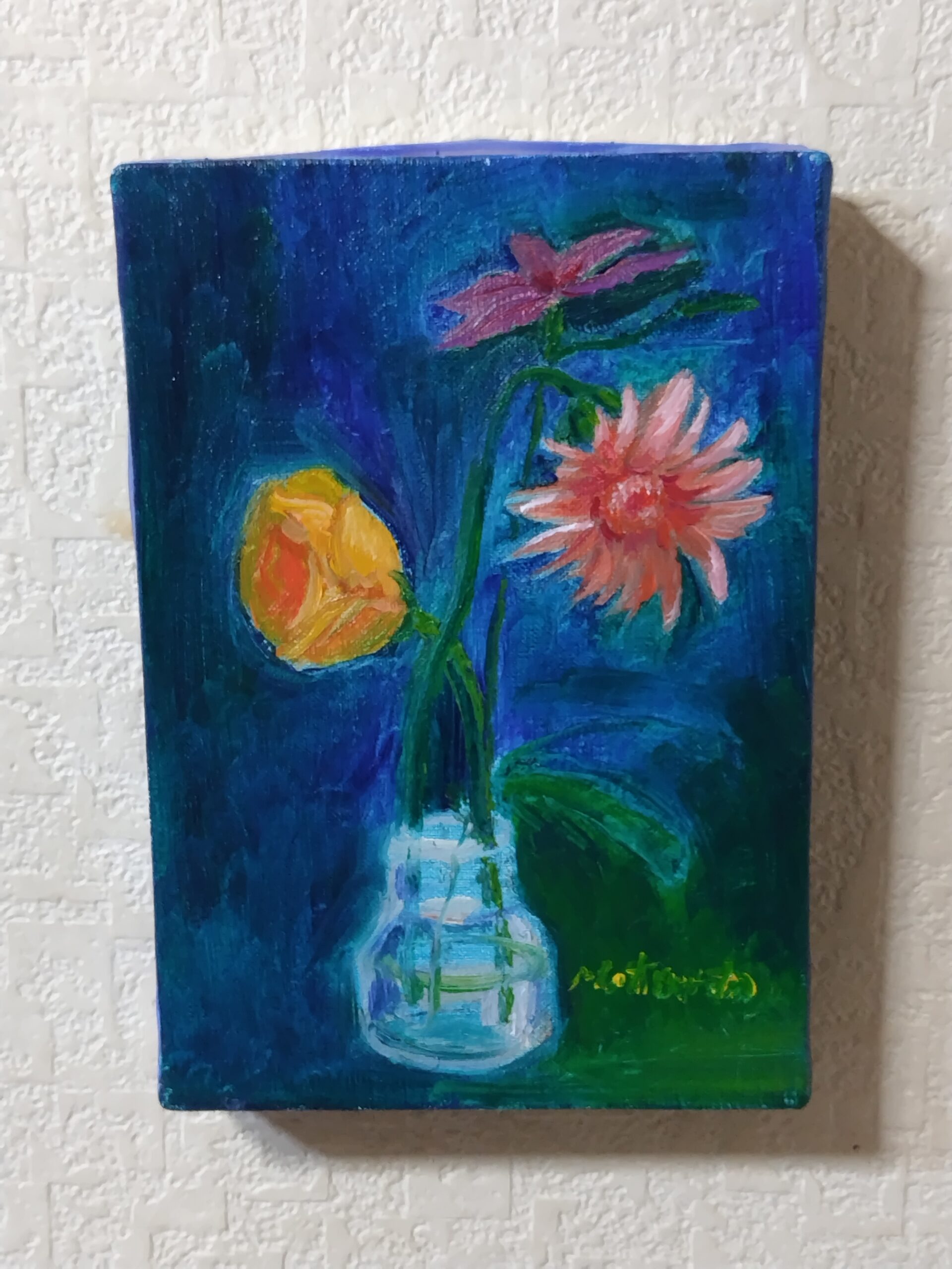 この冬、ガーベラとラナンキュラス、リューココリーネを花屋さんで買って、油絵具で描きました。花の色合いに気を使い、お部屋が明るくなるようにカラフルな色調で仕上げました。寒い冬でも凛と咲く花を見れば人の気分も引き締まります。毎日の生活に張りを感じていただければ嬉しいです。