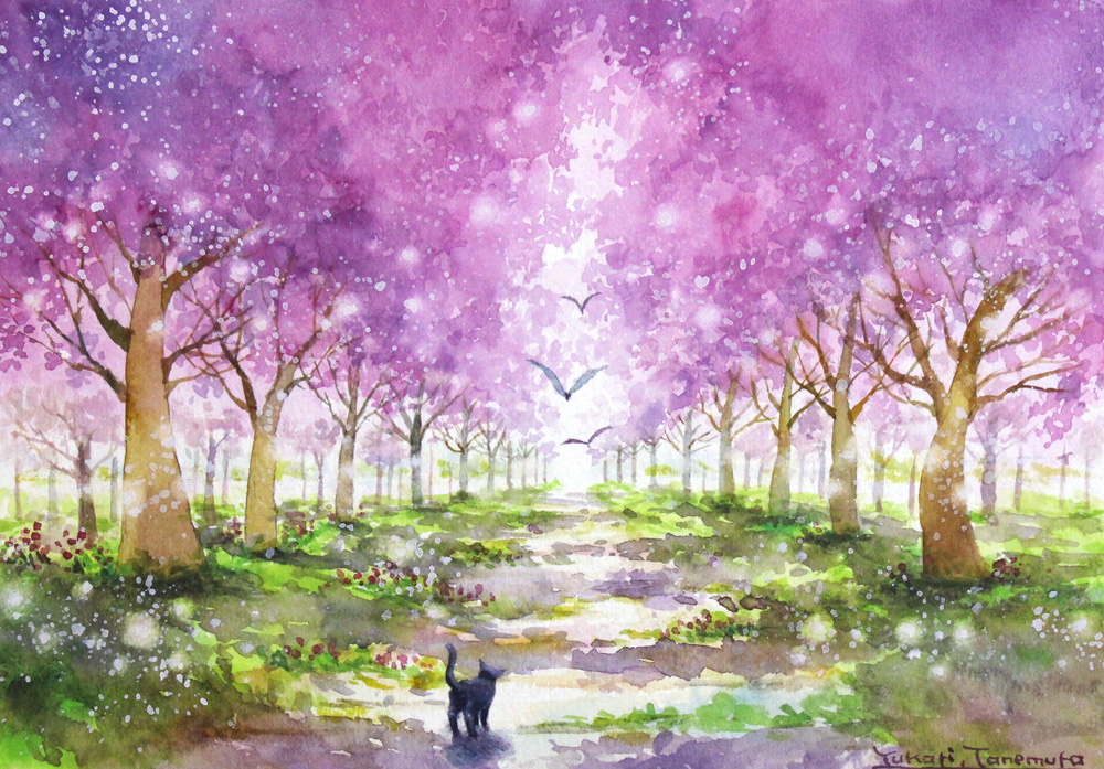 柔らかい春風が吹く、桜並木の散歩道を水彩で表現しました。