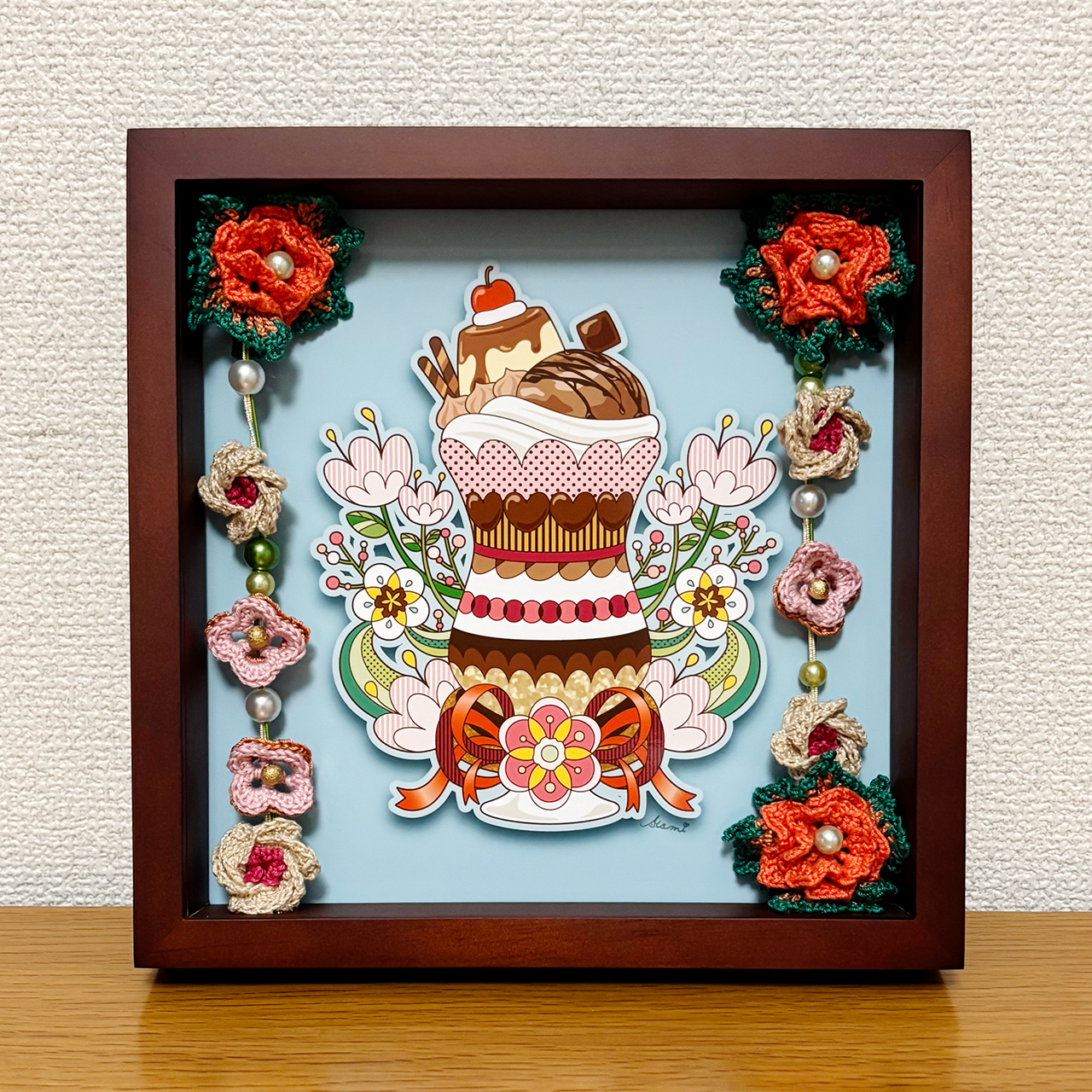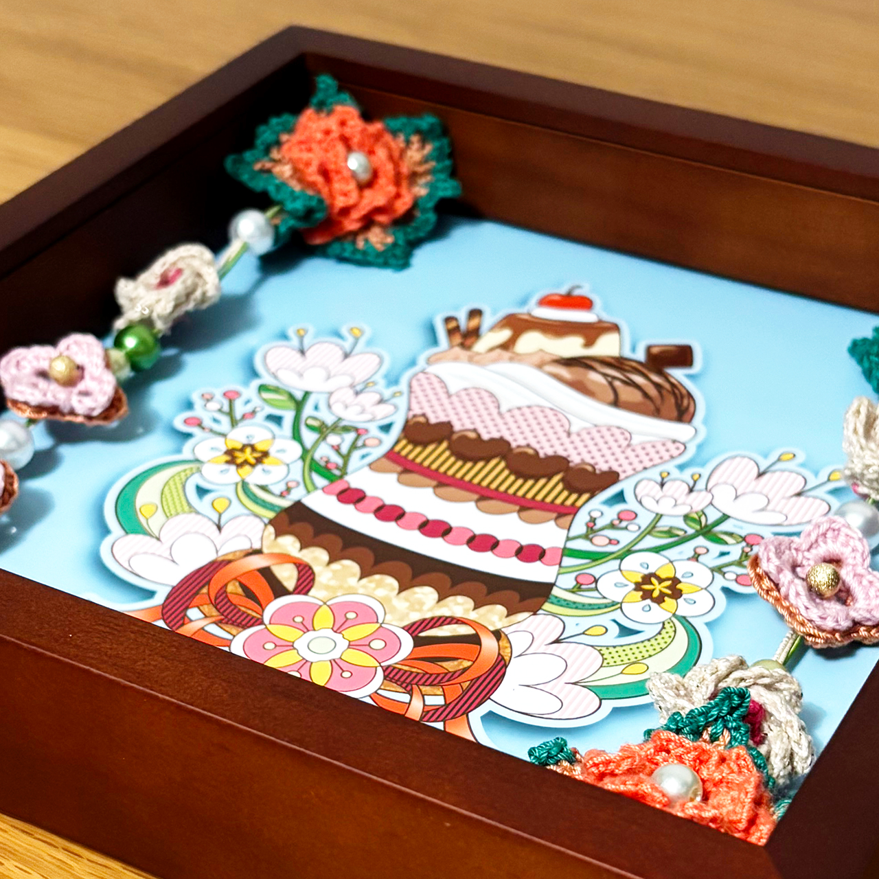 デジタルイラストとかぎ針編みを組み合わせた、立体額装作品です。