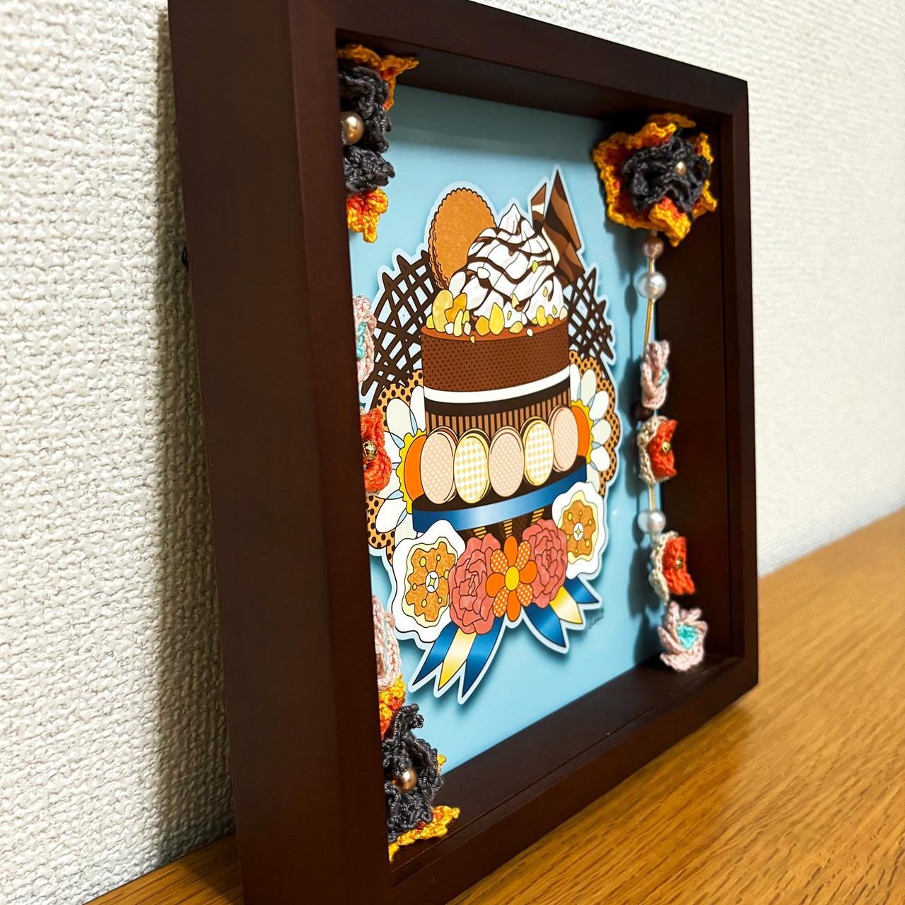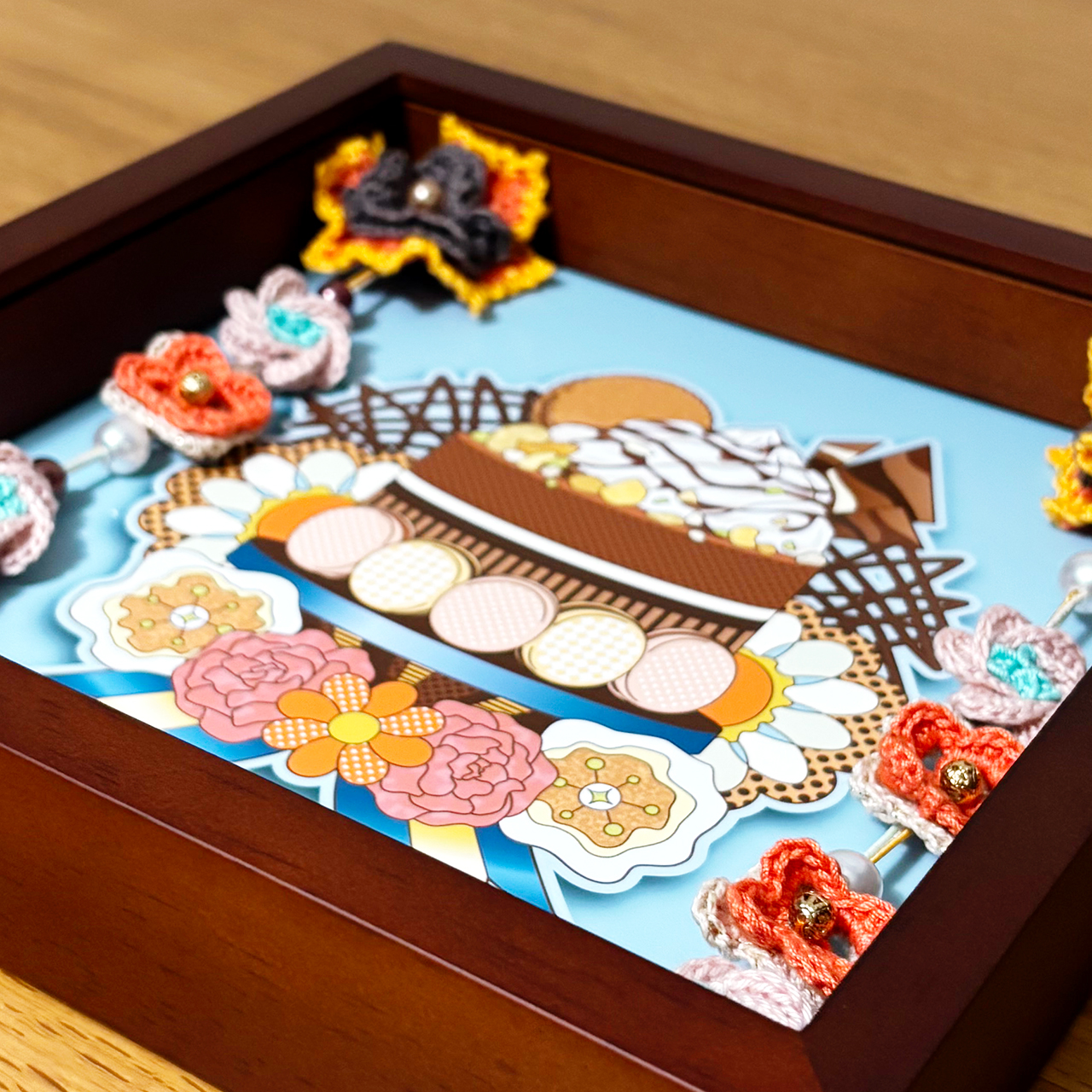 デジタルイラストとかぎ針編みを組み合わせた、立体額装作品です。