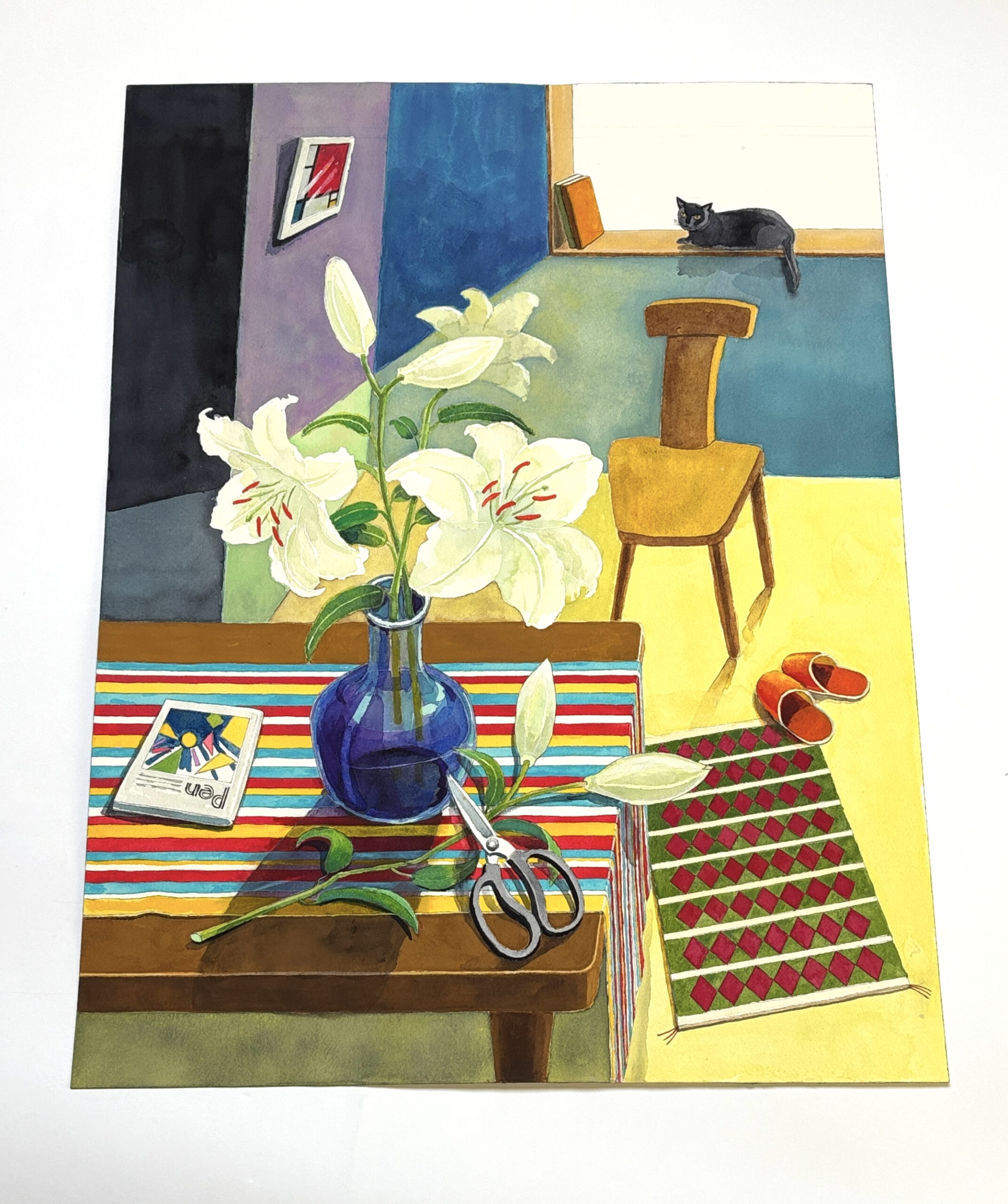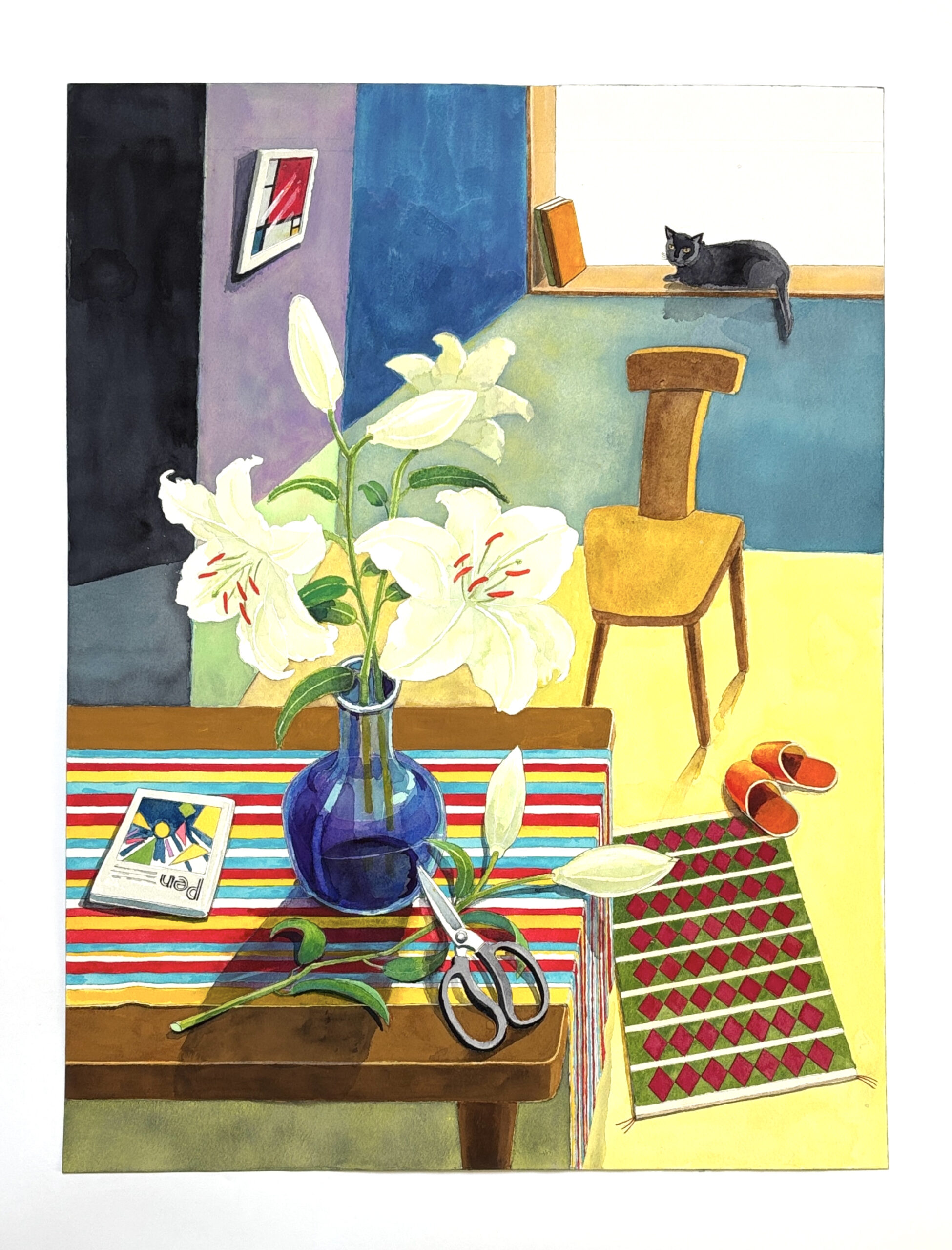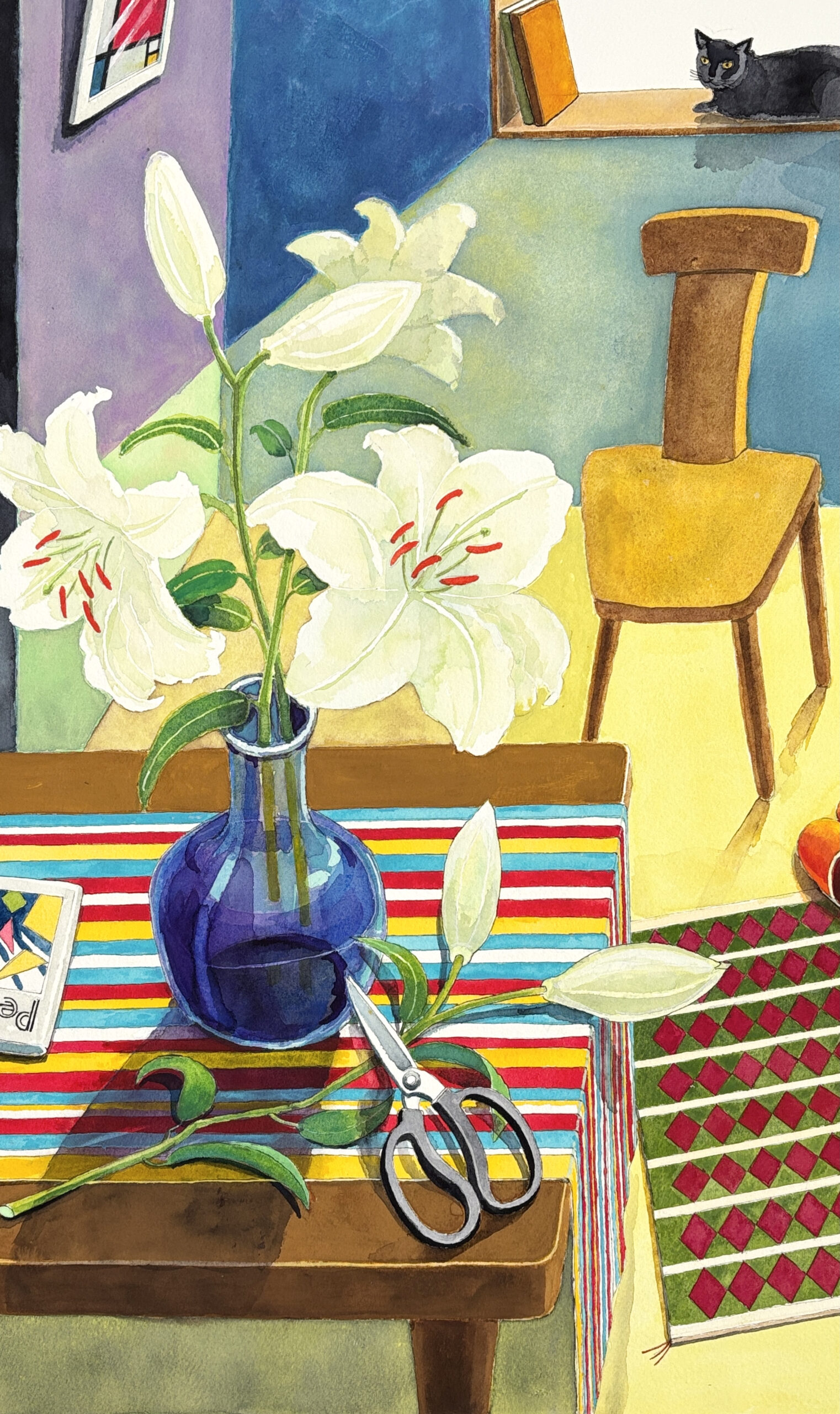 室内の主人がカサブランカを花瓶に活け終わり席をはずしお茶でも入れにいったのだろうか?そんな様子を黒猫がながめている・・