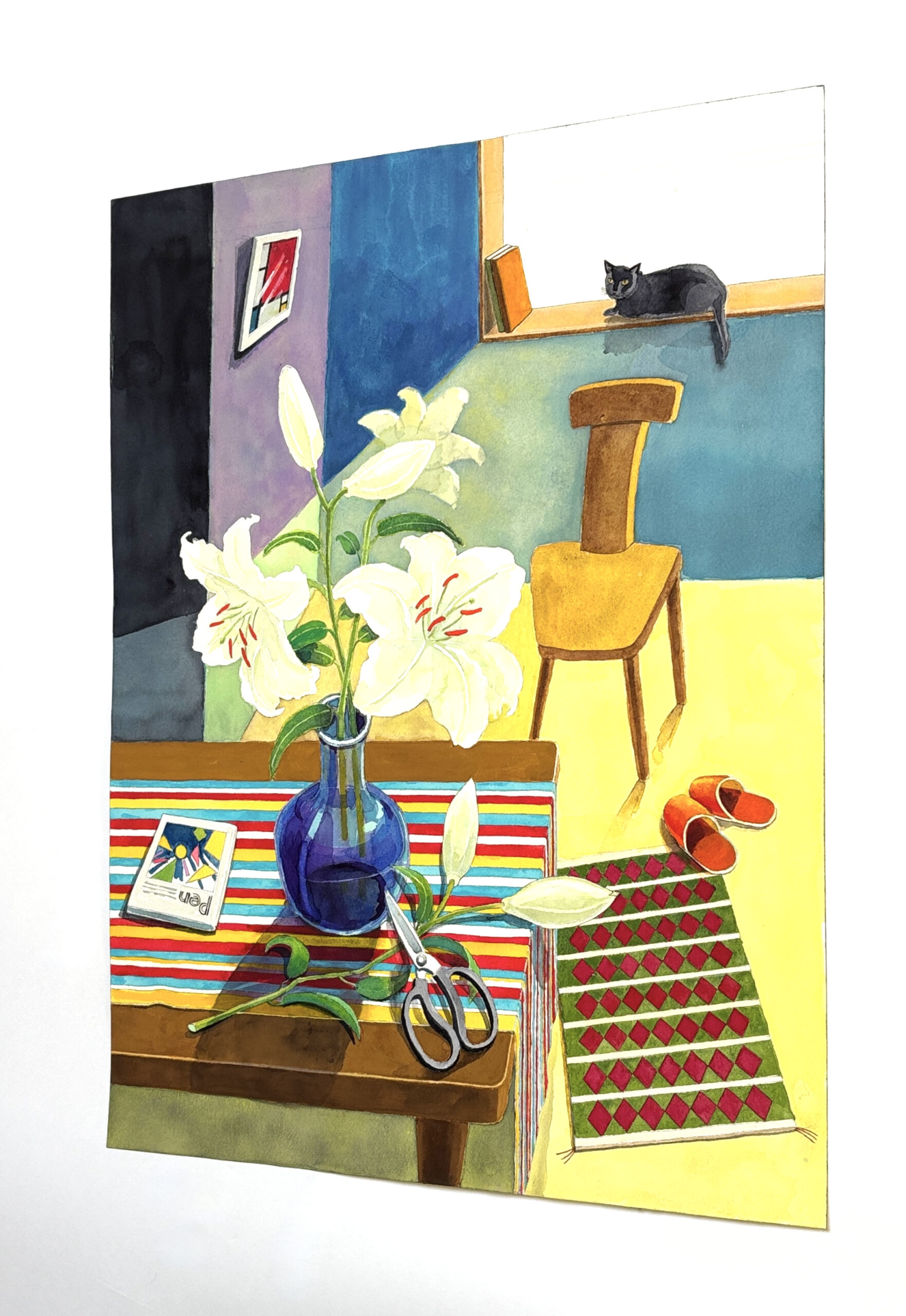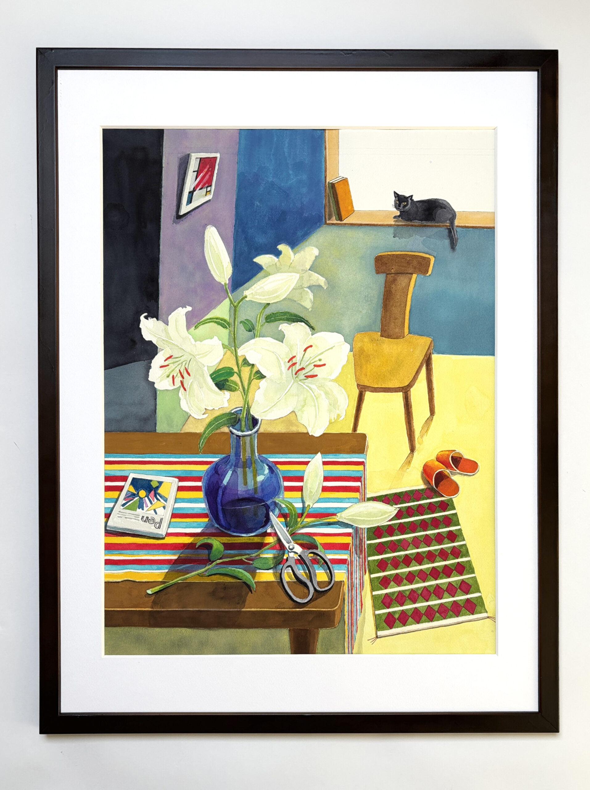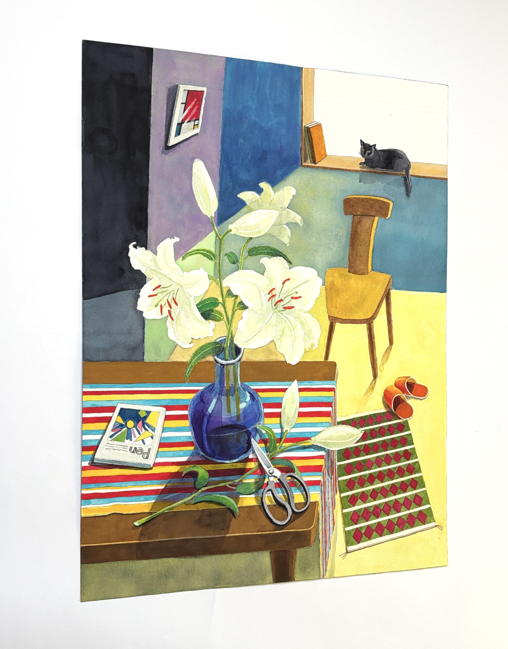 室内の主人がカサブランカを花瓶に活け終わり席をはずしお茶でも入れにいったのだろうか?そんな様子を黒猫がながめている・・