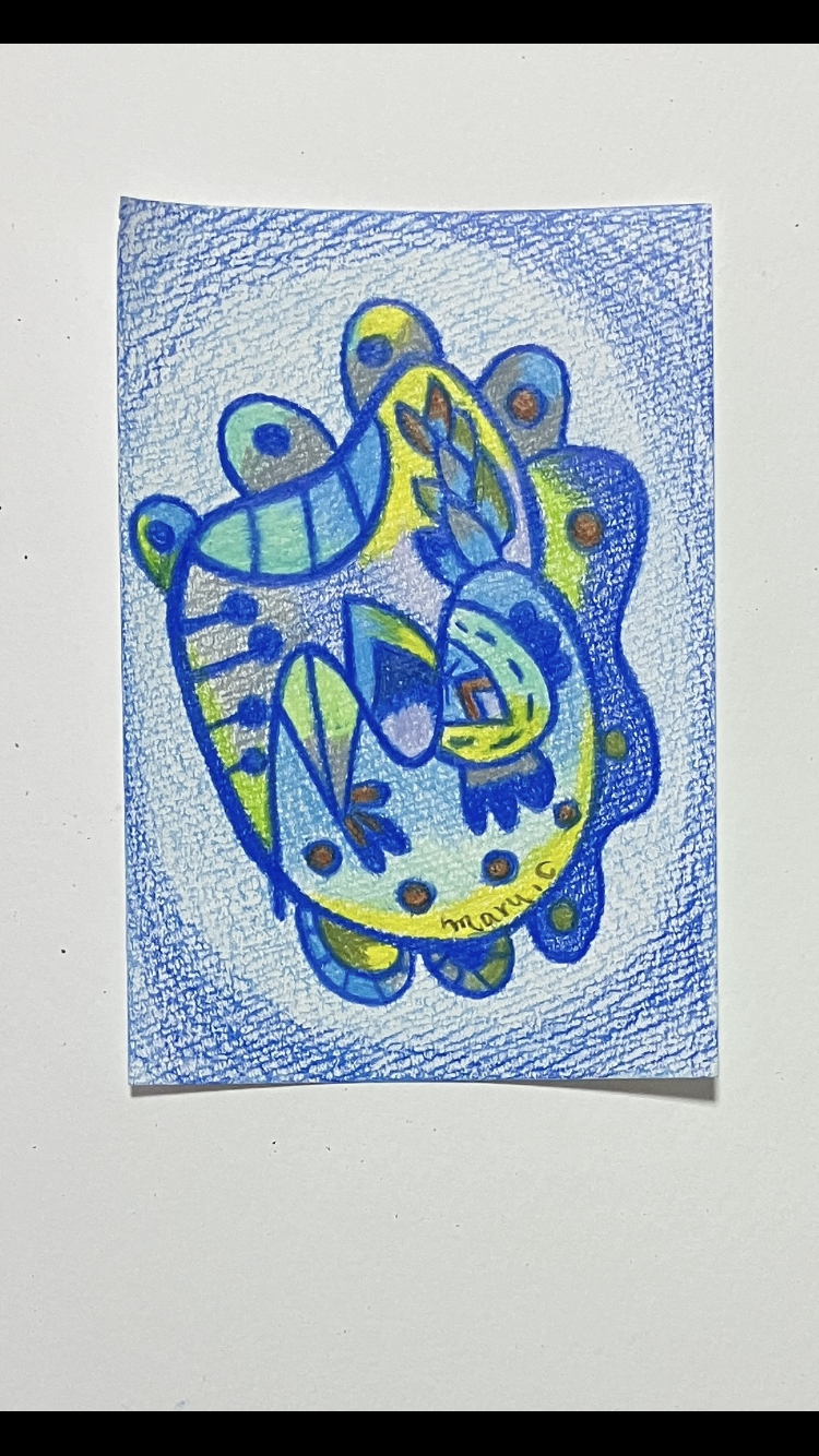 鳥のモチーフが入った抽象画。丸みを帯びた形が柔らかい雰囲気を作っています。青を使用した爽やかな作品です。色鉛筆を塗り込み、画用紙のザラザラした感じも楽しんでいただきたいです。サインは表裏に入っています。簡易的な額を使用しています。お好きな額に入れてお楽しみください。