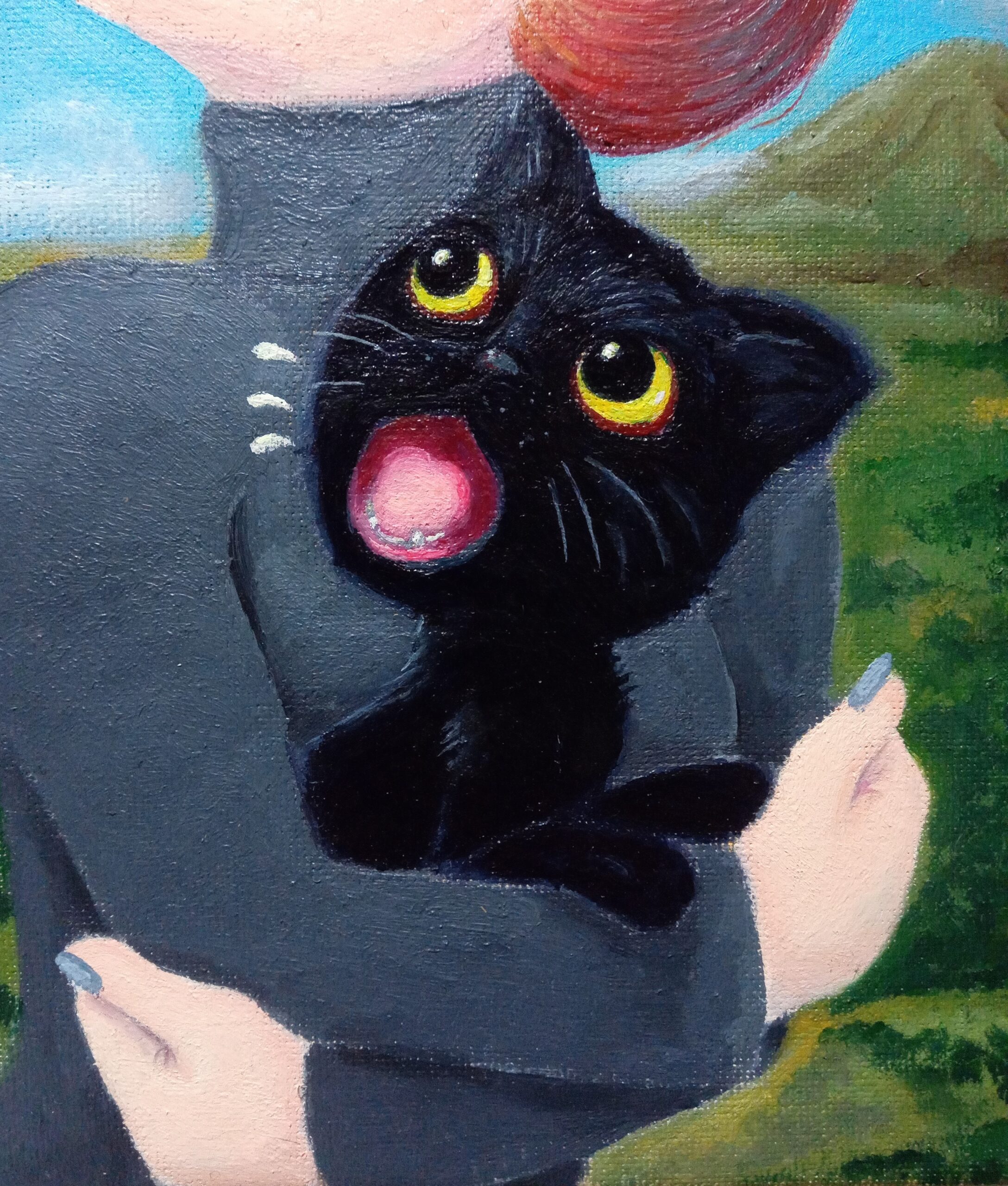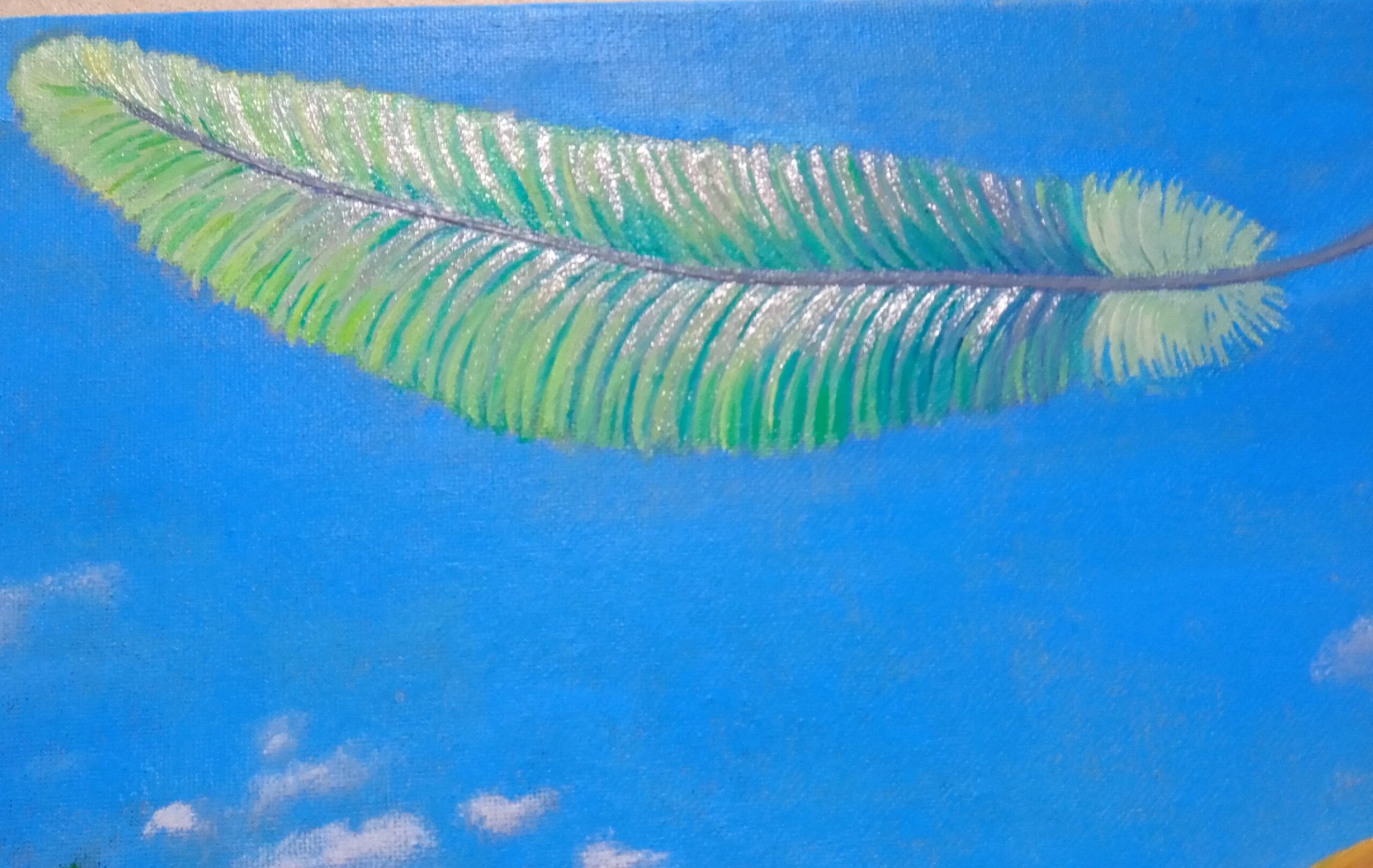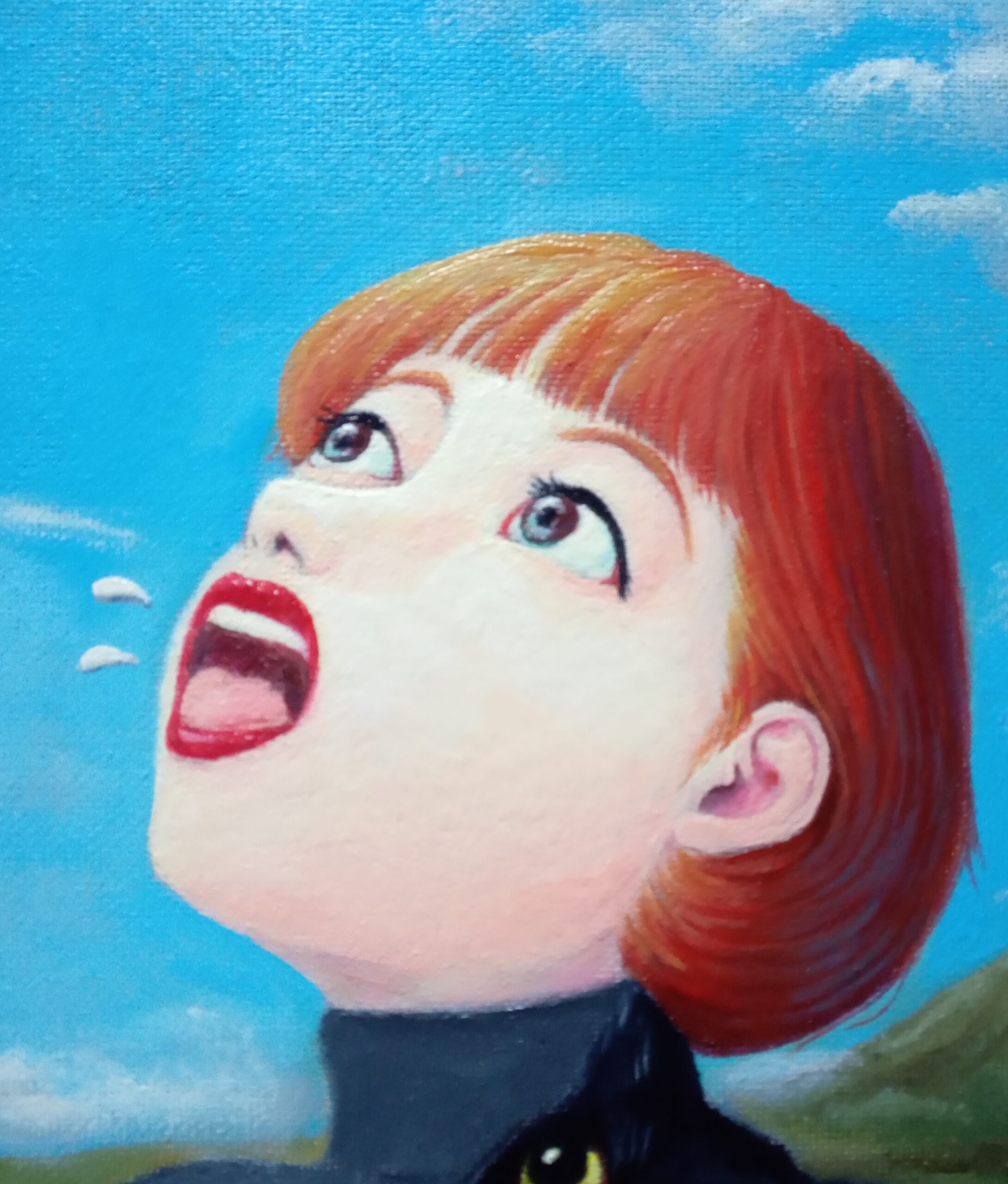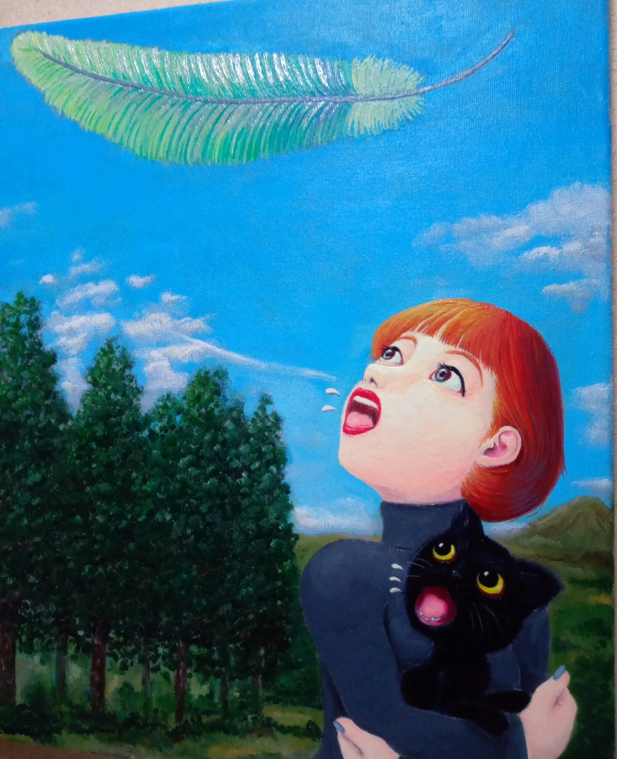 series Girl&Lucy㉙ 少女とルーシーが繰り広げる冒険とロマンの旅をコミカルなタッチで表現しました。 空にヒラヒラ舞う大きな羽! 「あんな大きな羽ってどんな鳥なの⁈」少女もルーシーもかなりビビってます。 羽は一本一本マチエール(絵の具の質感)をつけて丹念に描き、シルバーの絵の具で独特の存在感と輝きを出すように表現しました。