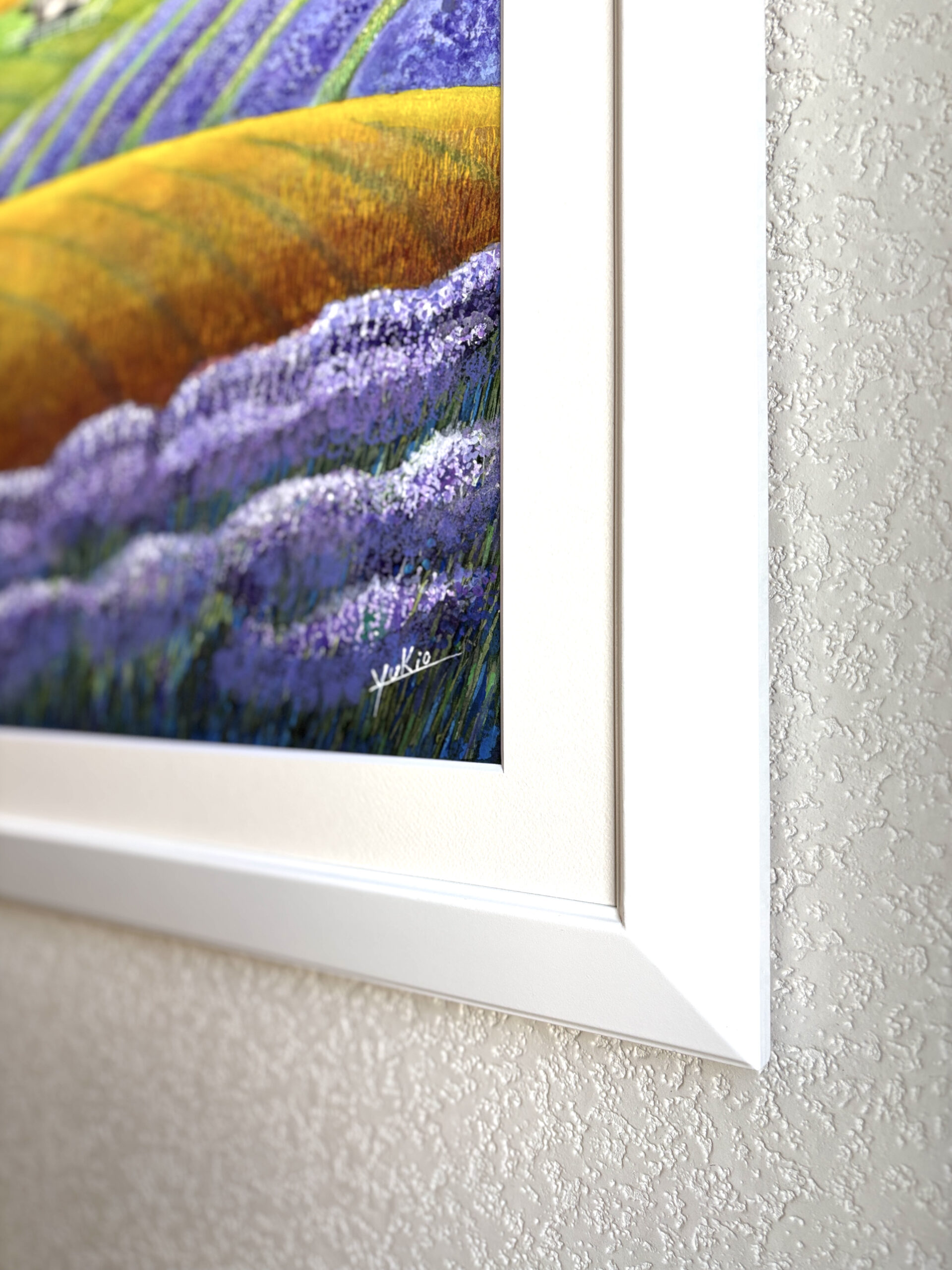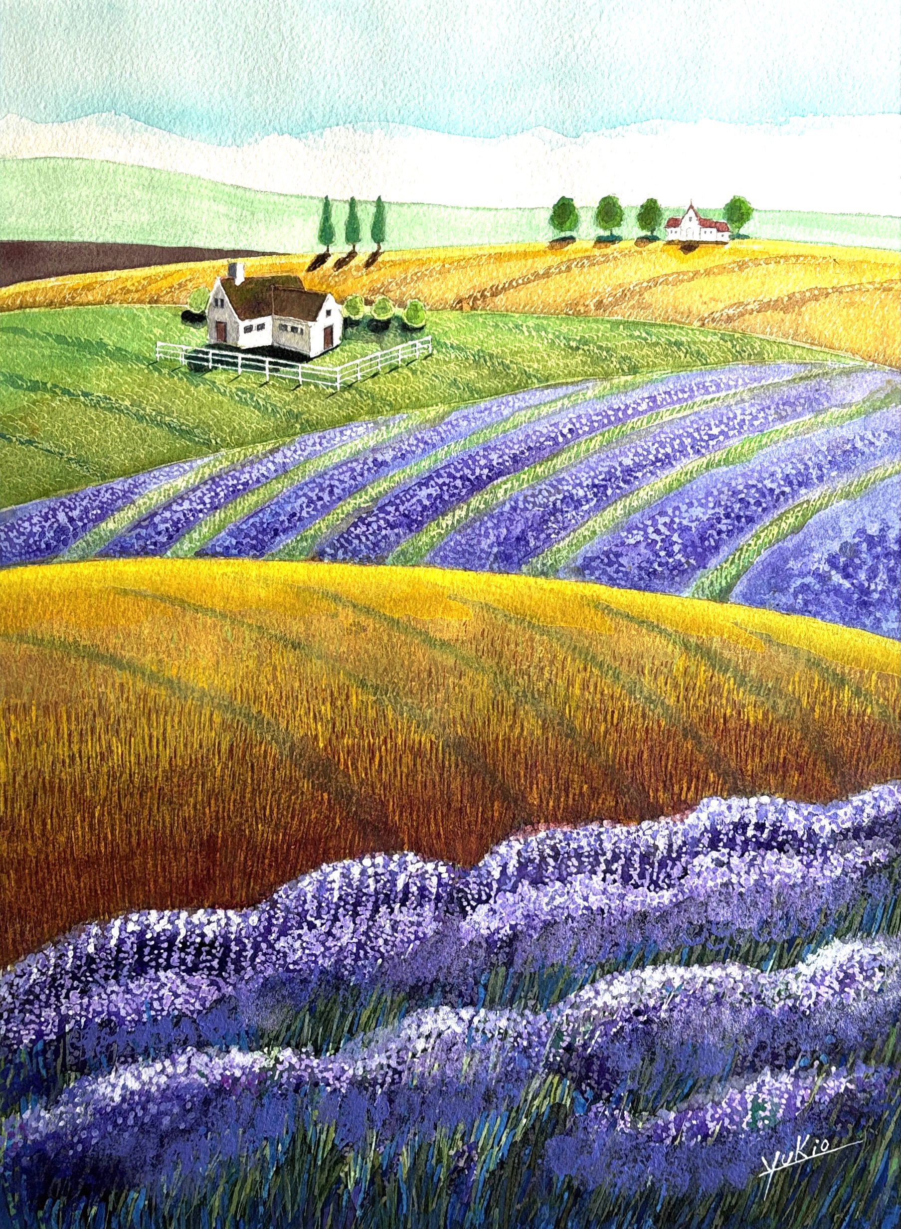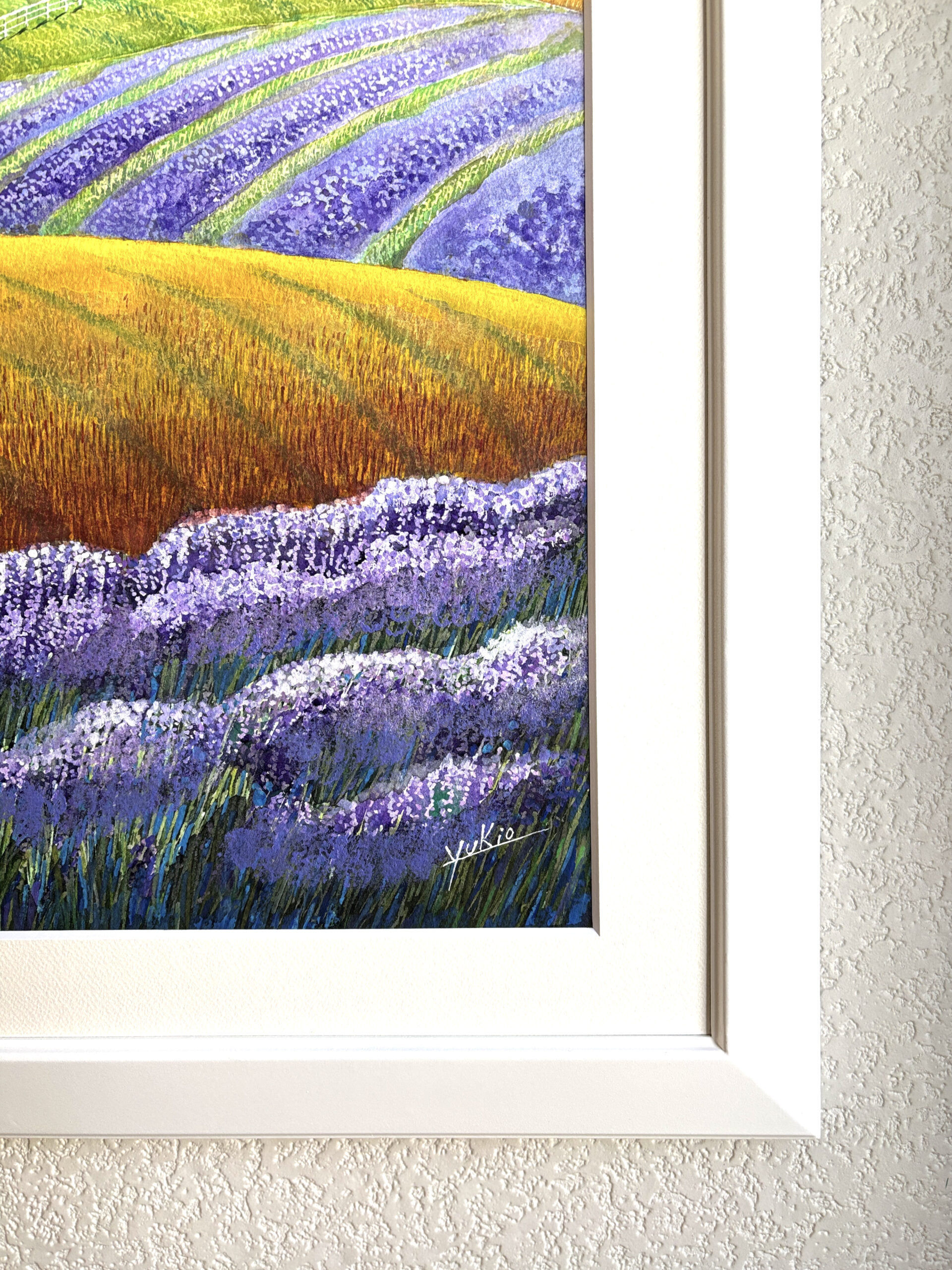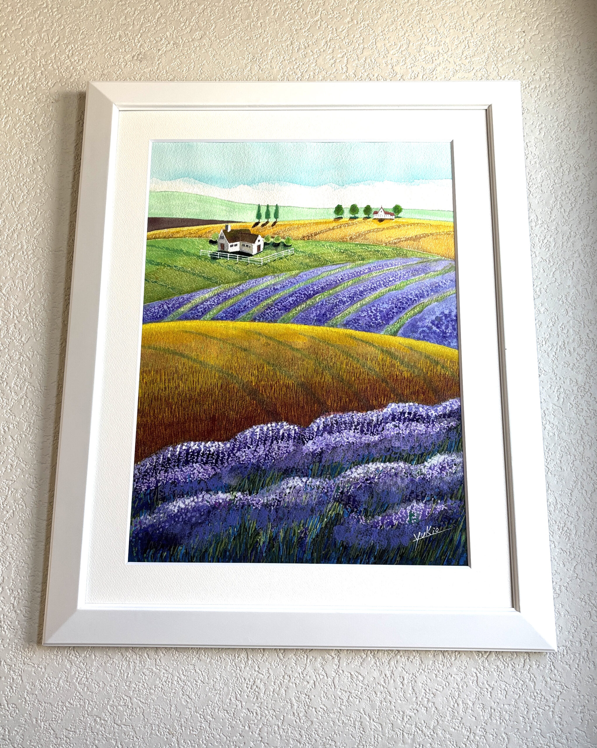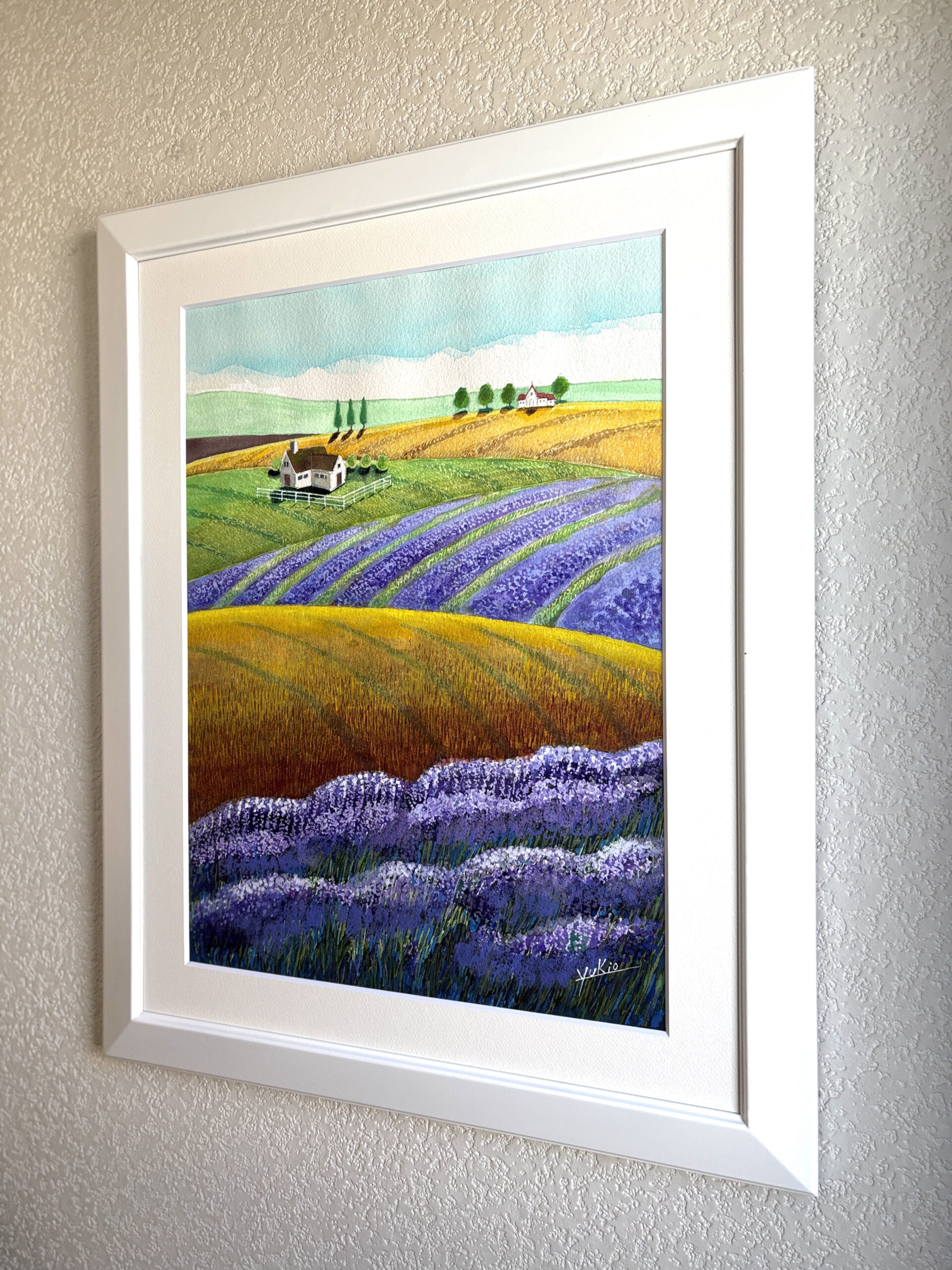 私の心の中の故郷、心が癒される理想の里、風が吹きラベンダーや草の香りが漂ってくる様な風景です。額装しておりますのでそのまま壁に飾ることができます。