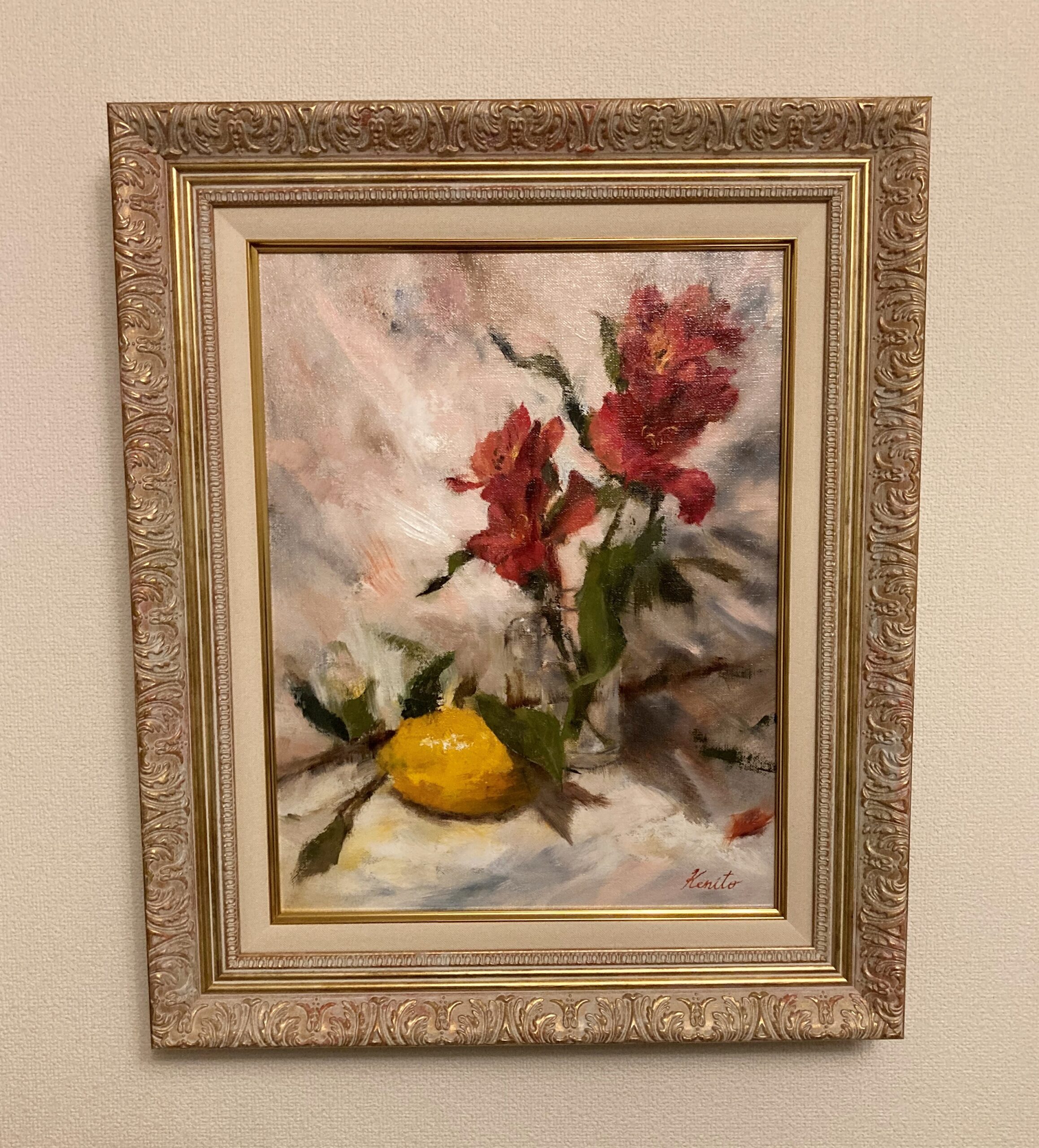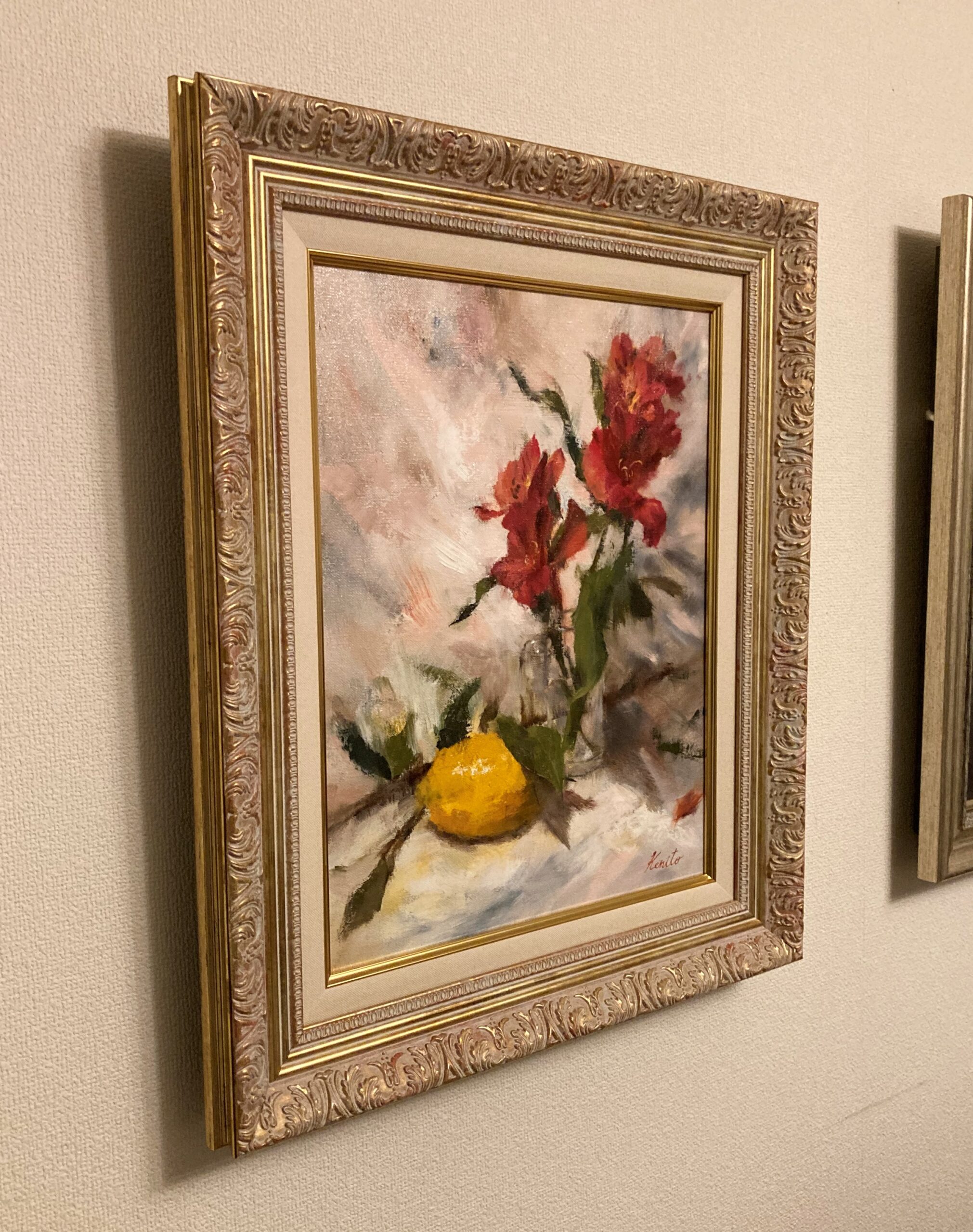 黄色と赤の対比がお互いを引き立てる作品で、背景も軽やかなので白い壁にとても映えると思います。