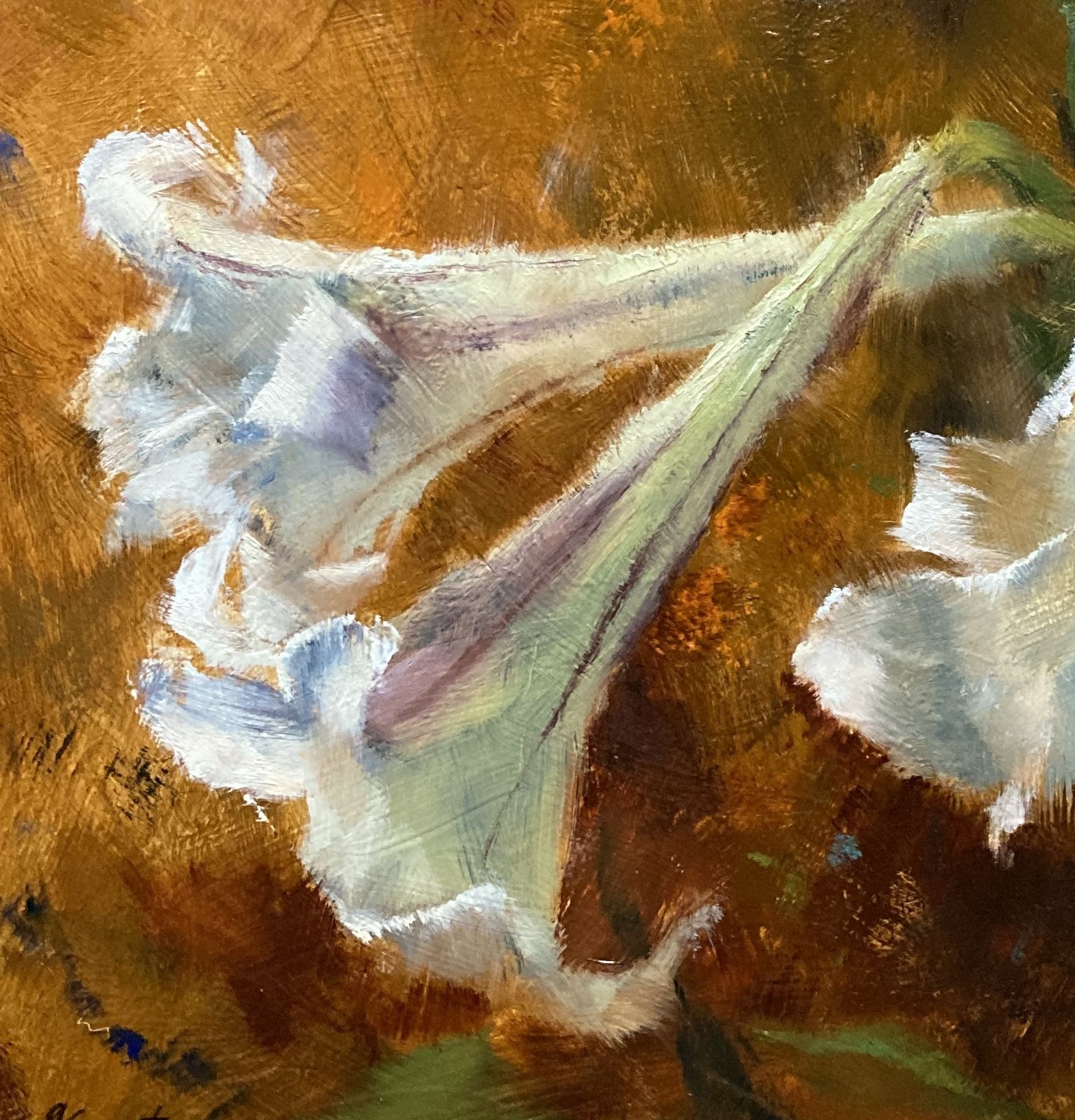 道端に咲いていたタカサゴユリを描きました。オレンジを中心とした色調が何とも言えない雰囲気を醸し出しています。少し緩めに描いたことでソフトな印象を与えています。
