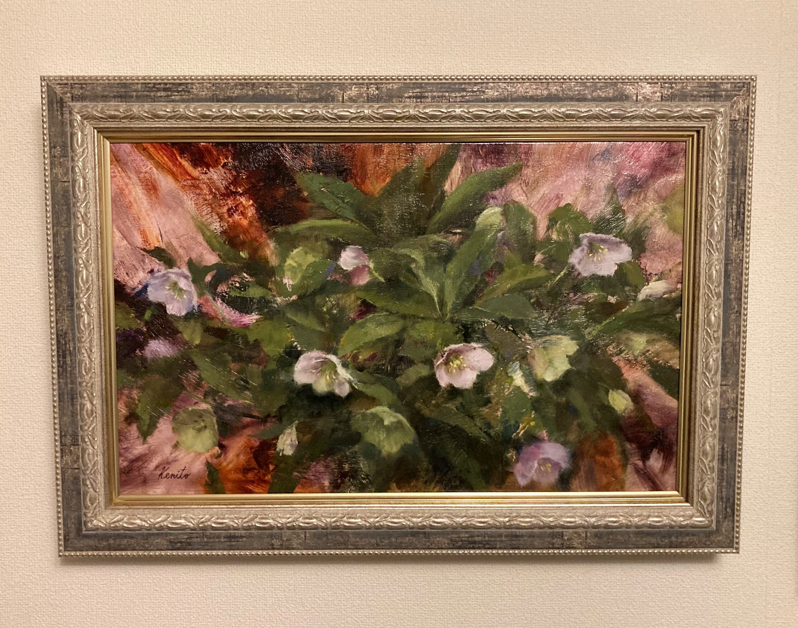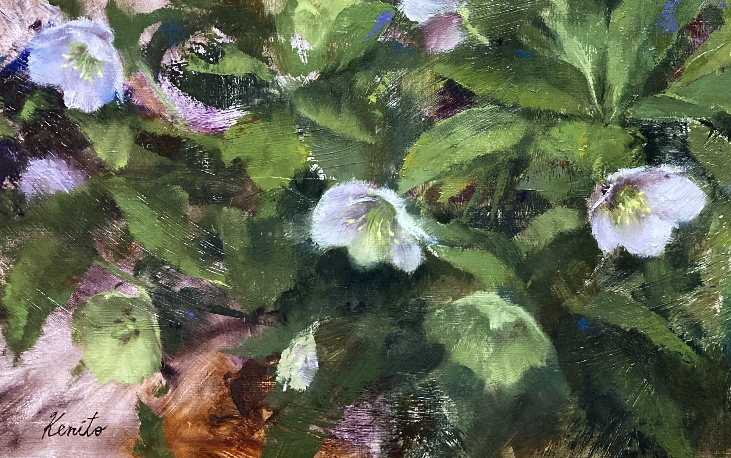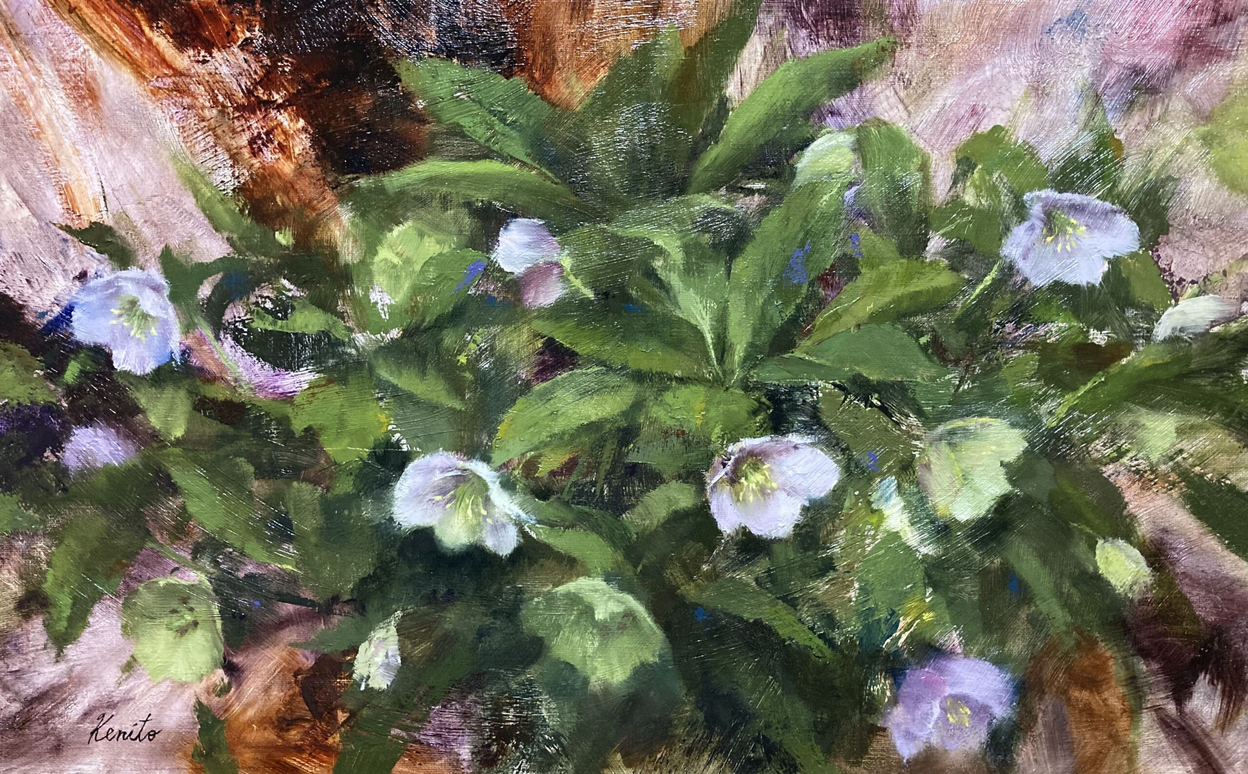 可愛らしいピンクのクリスマスローズを描きました。花の数が多く、まるで踊っているかのようにも見えます。また花が終わりかけて色が変わっている花もあるのが自然を感じます。
