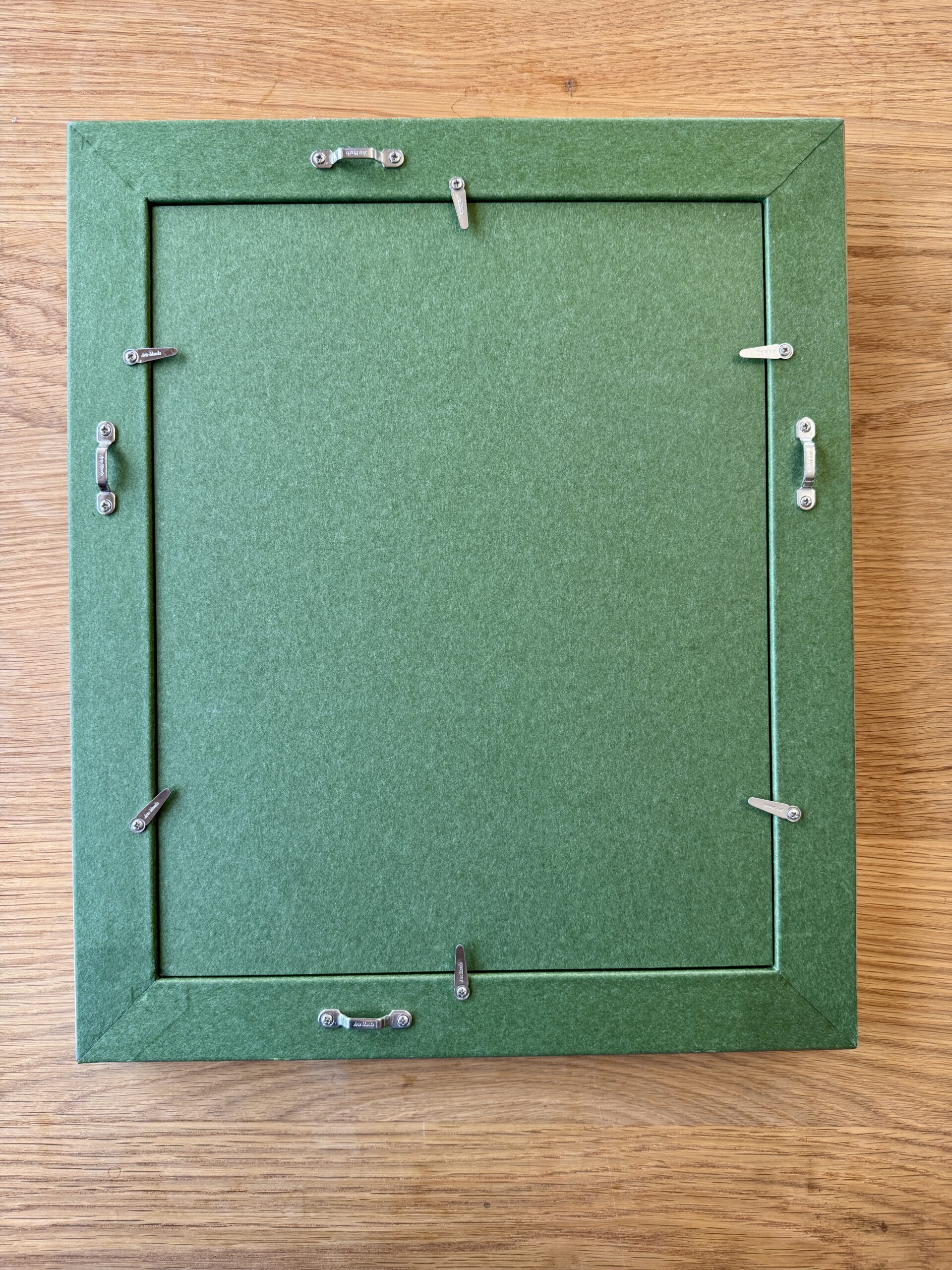 画像の額縁で発送いたします。また、反射防止の為にガラスを外して撮影しております。実物は額縁付属のガラス(またはアクリルガラス)が入ります。
