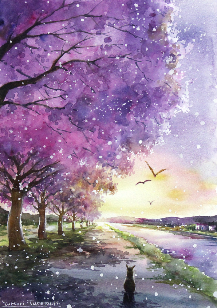 夕日に照らされた桜並木の風景を水彩で表現しました。