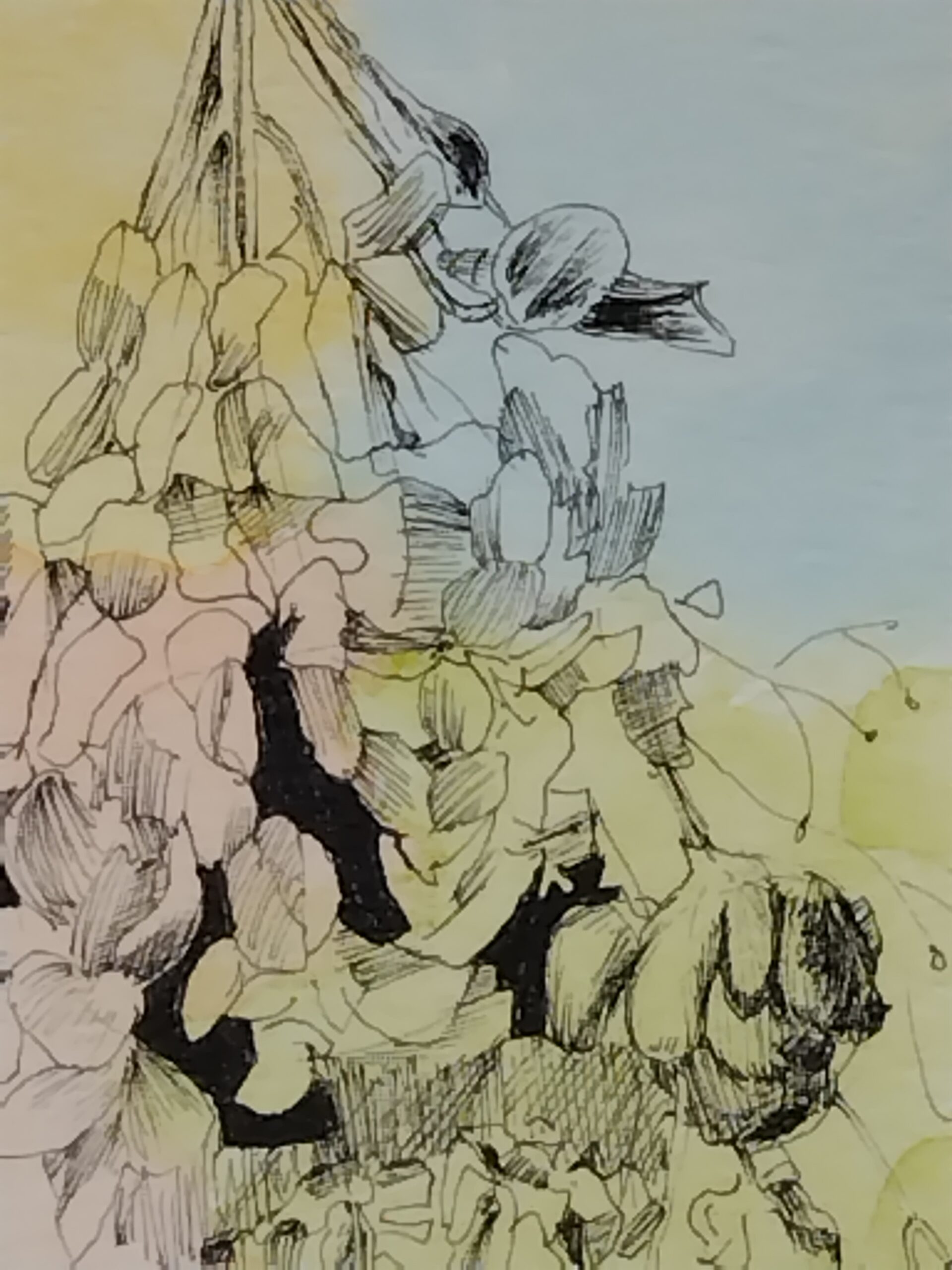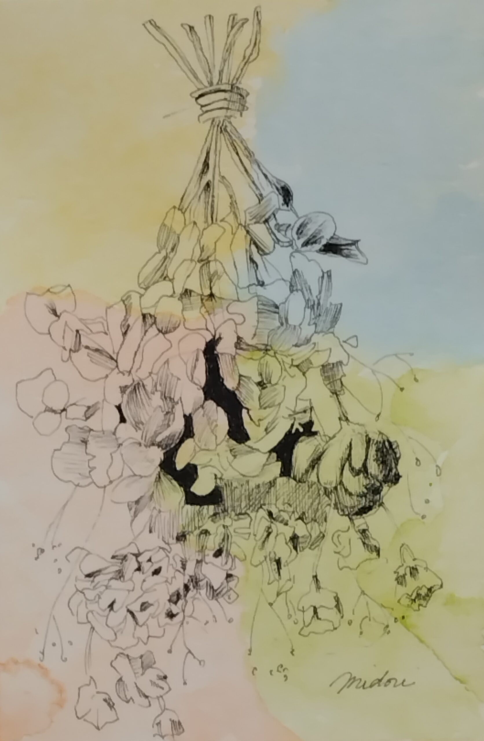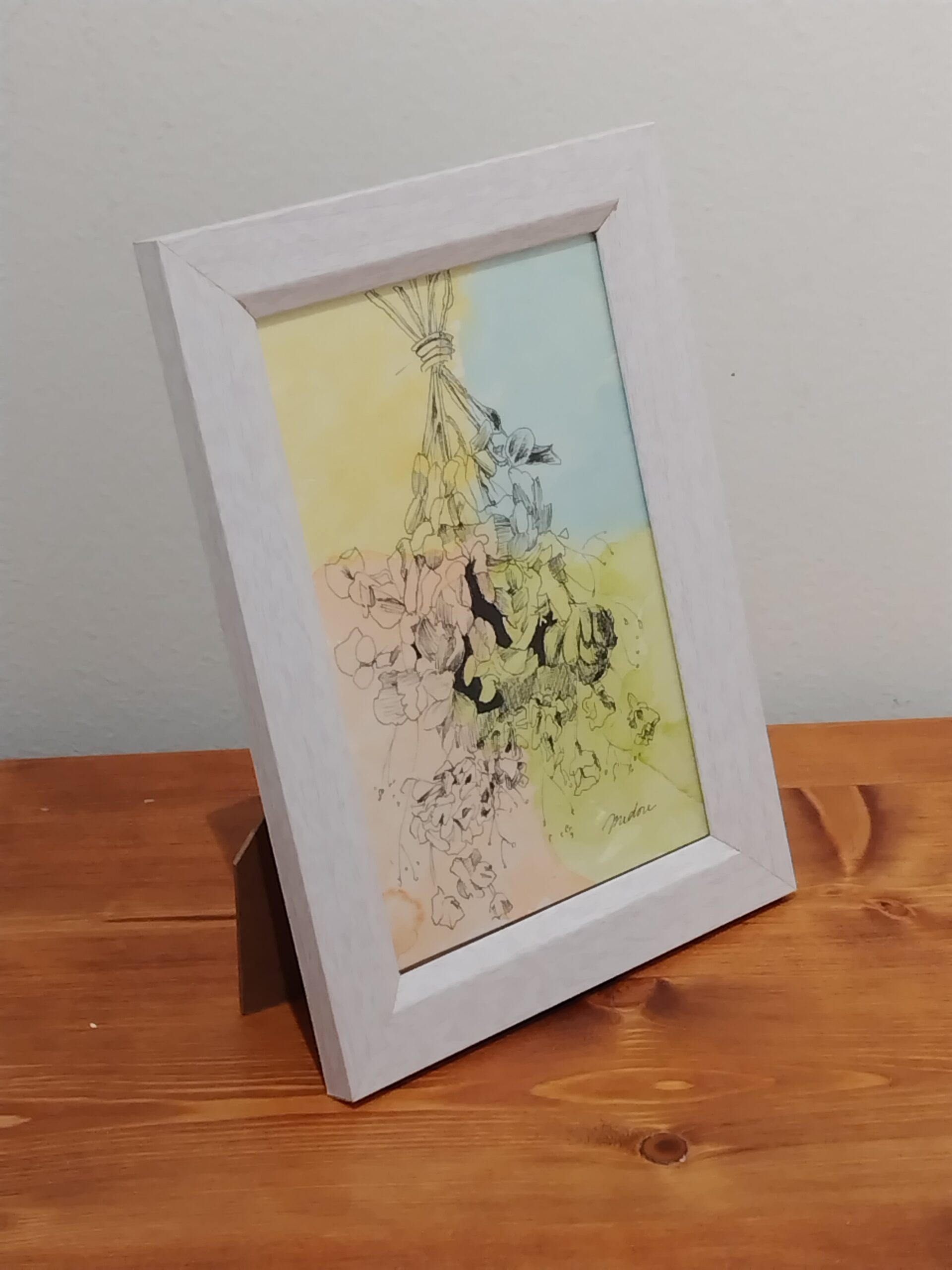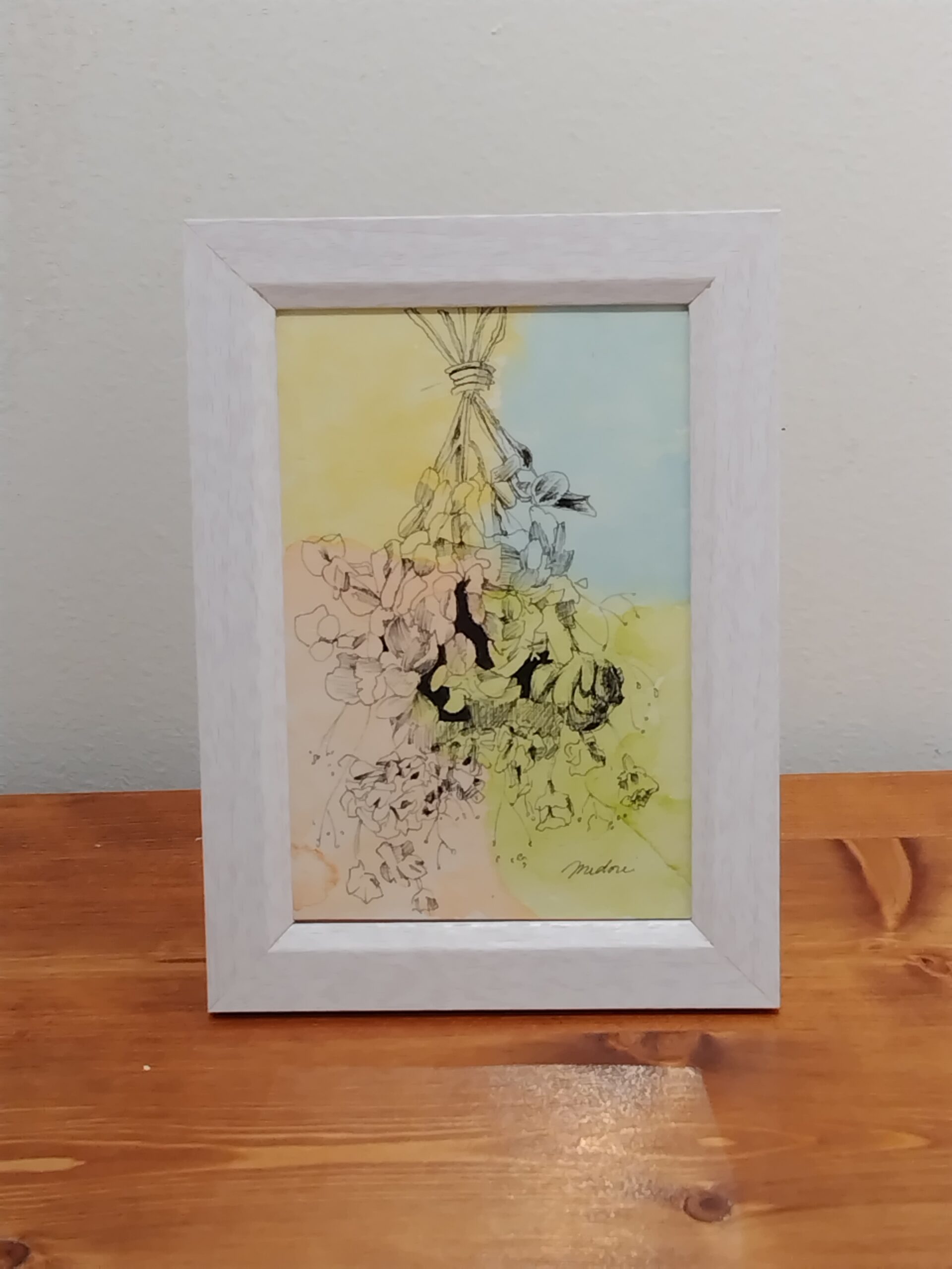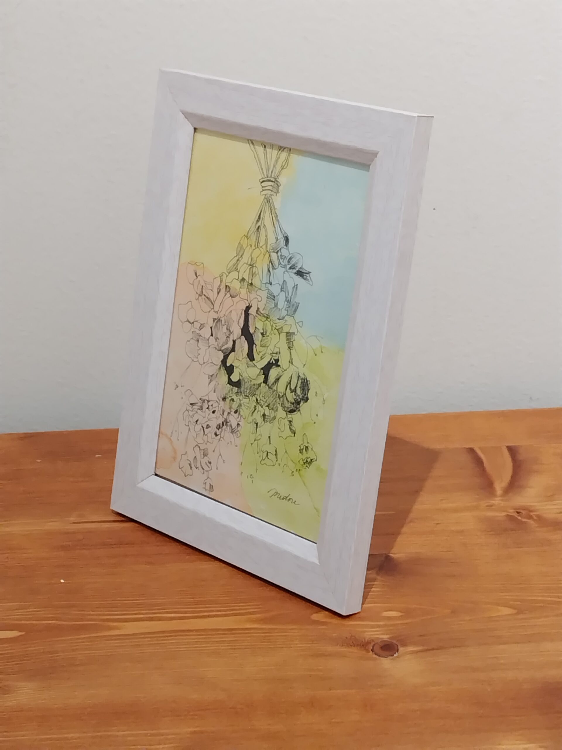 ふんわり水彩の上に精緻にペンで描かれた花をお楽しみください。