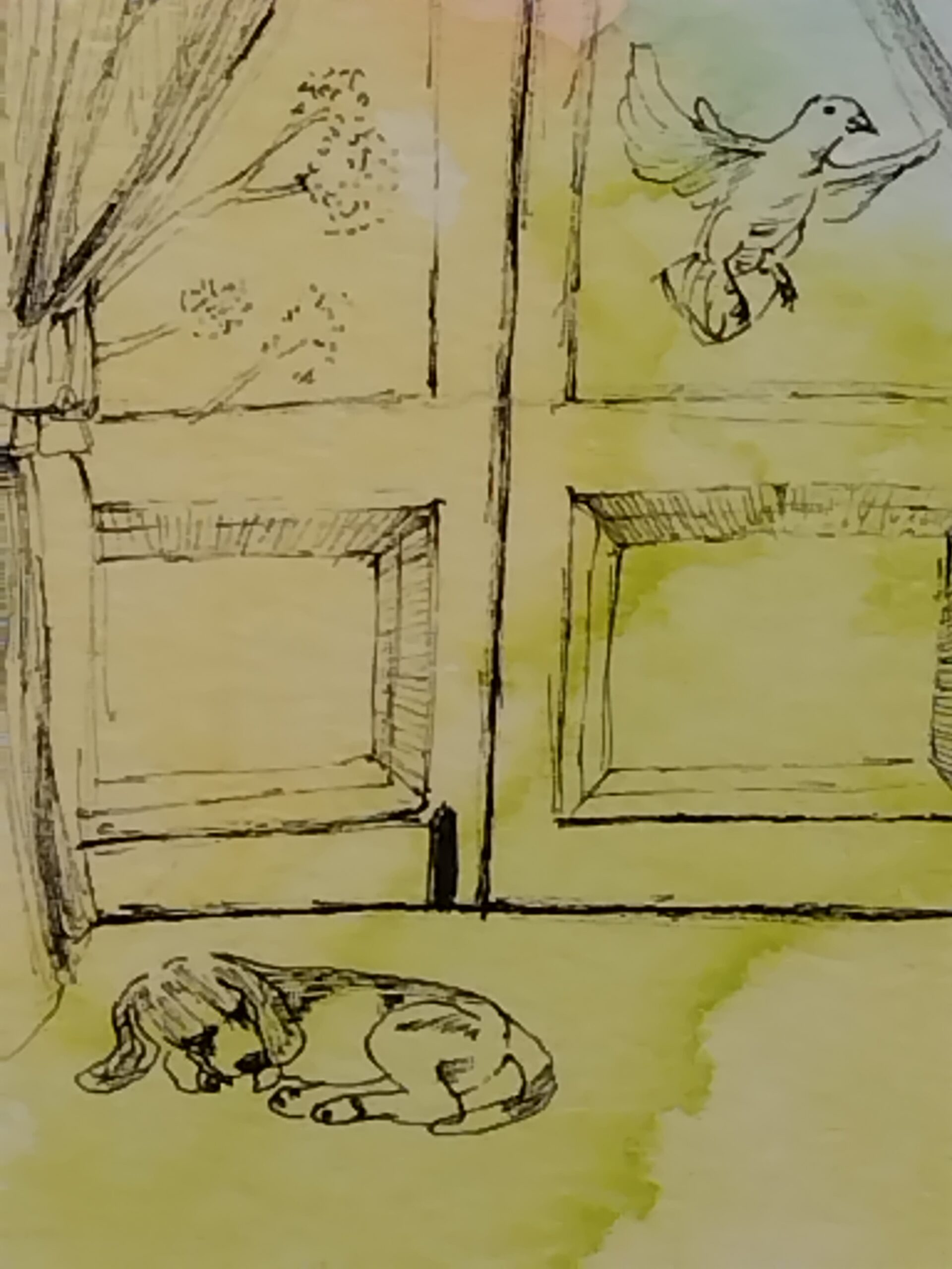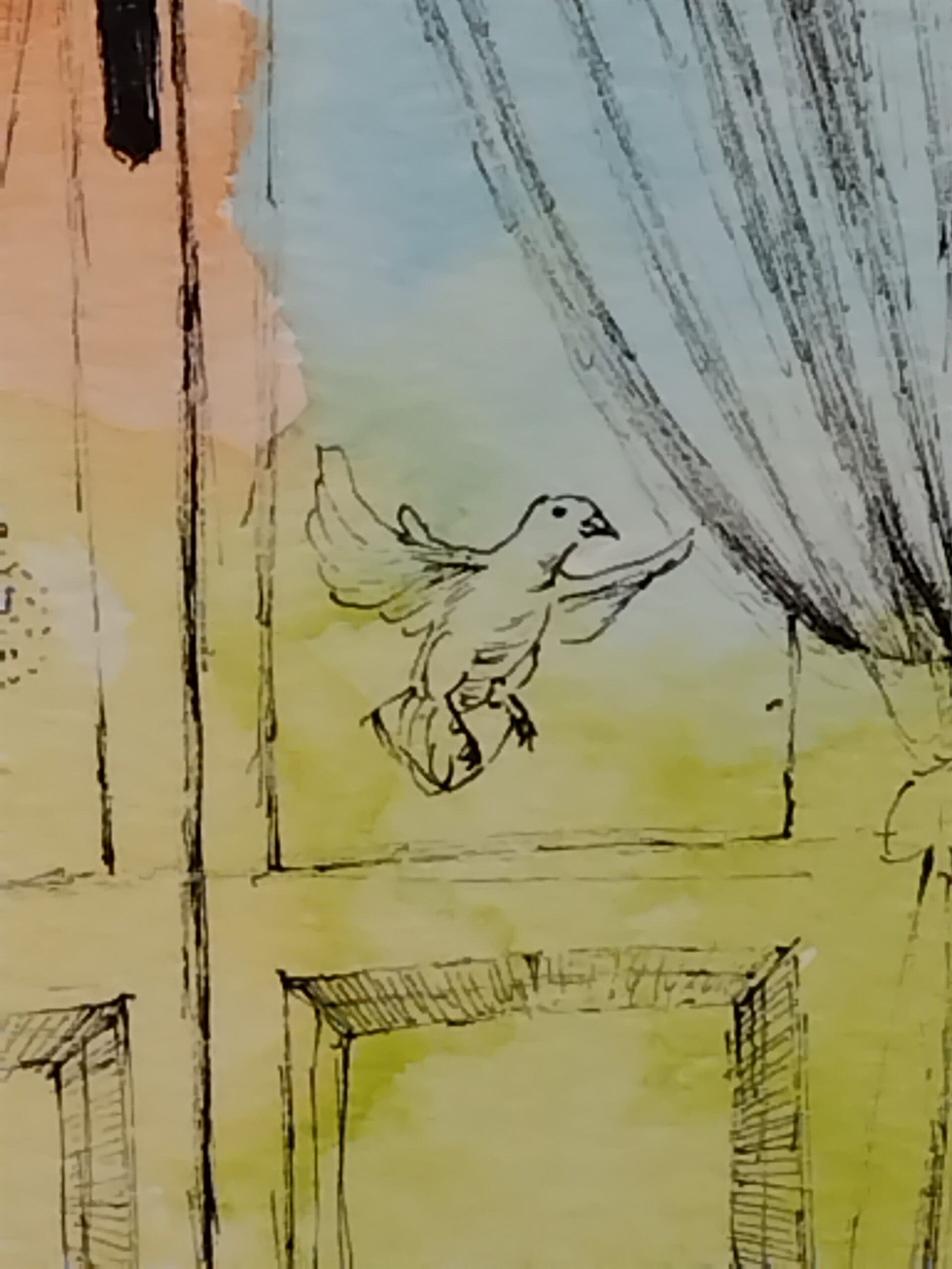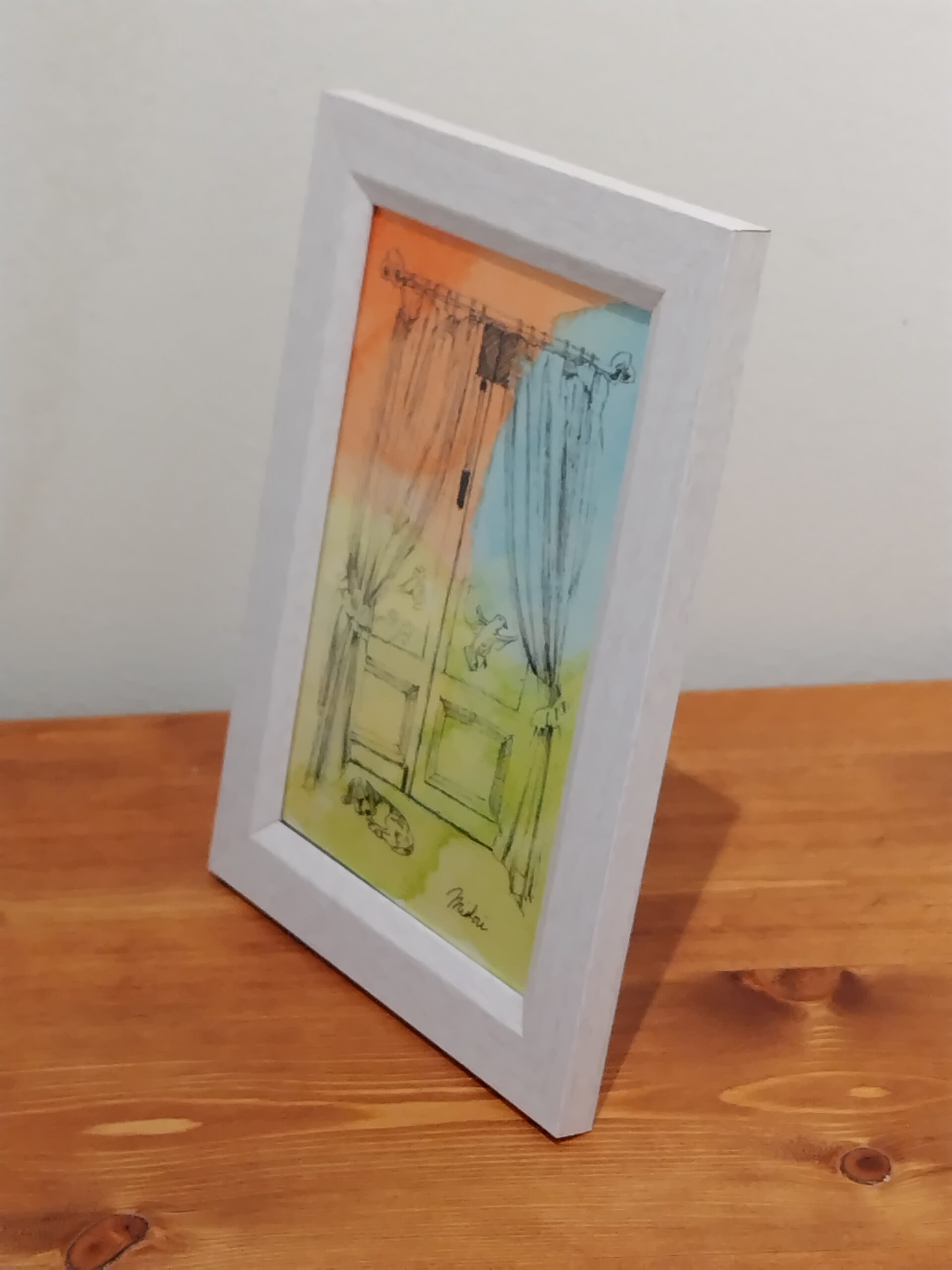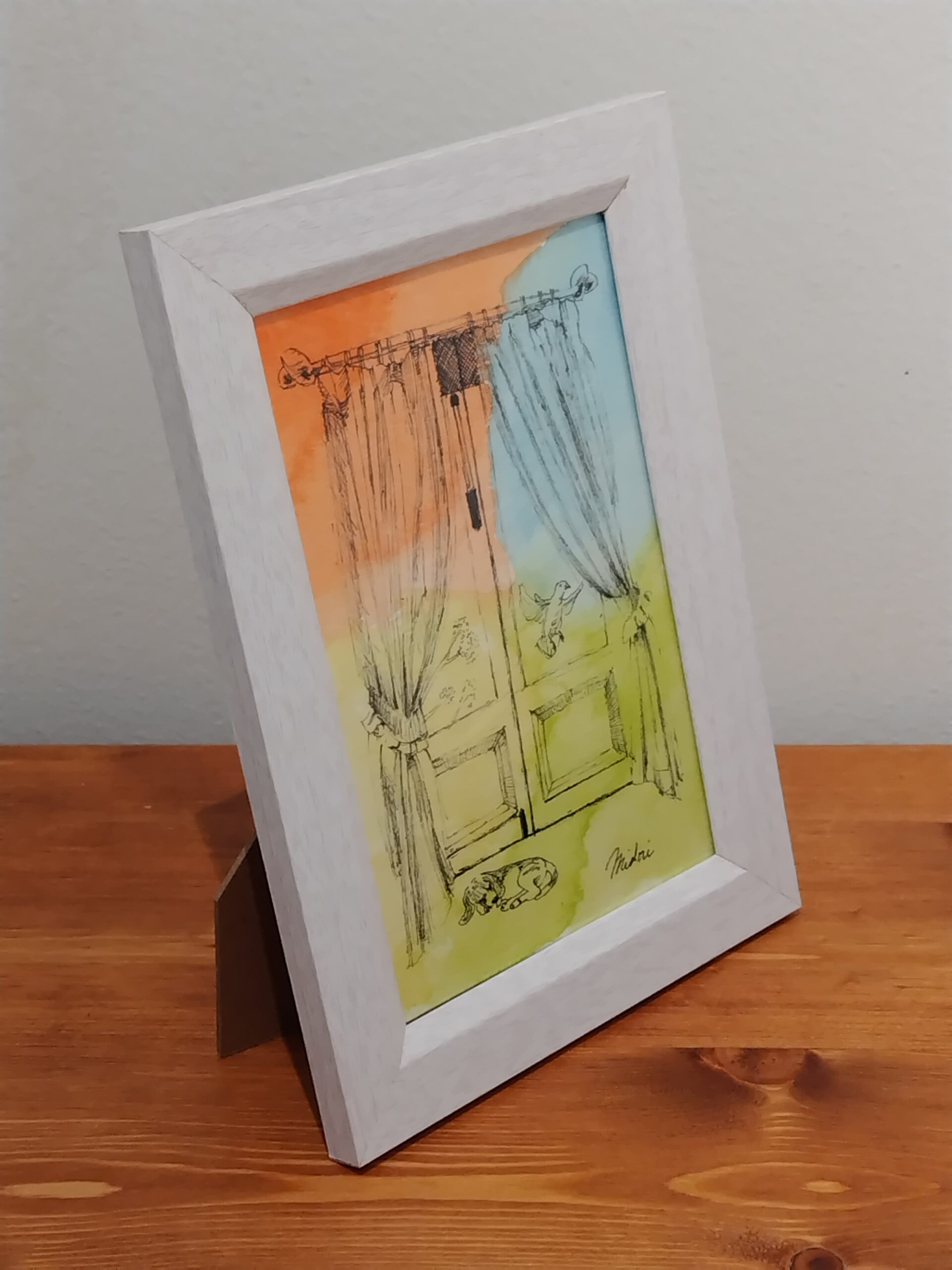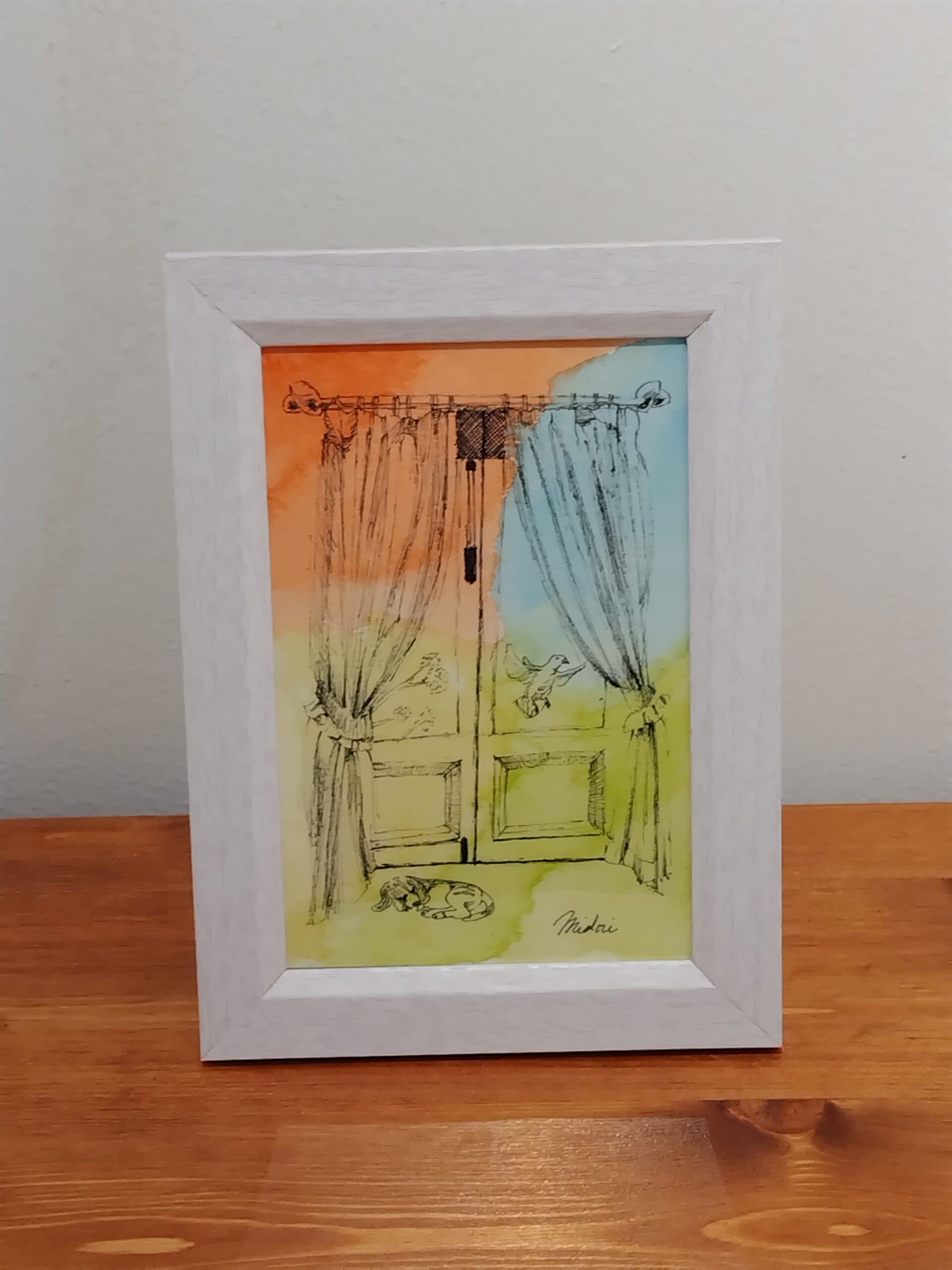 ふんわり水彩の上に、カーテンをはさんだ世界の内外を黒色のペンで精緻に描きました。黒色の美しさをお届けします。