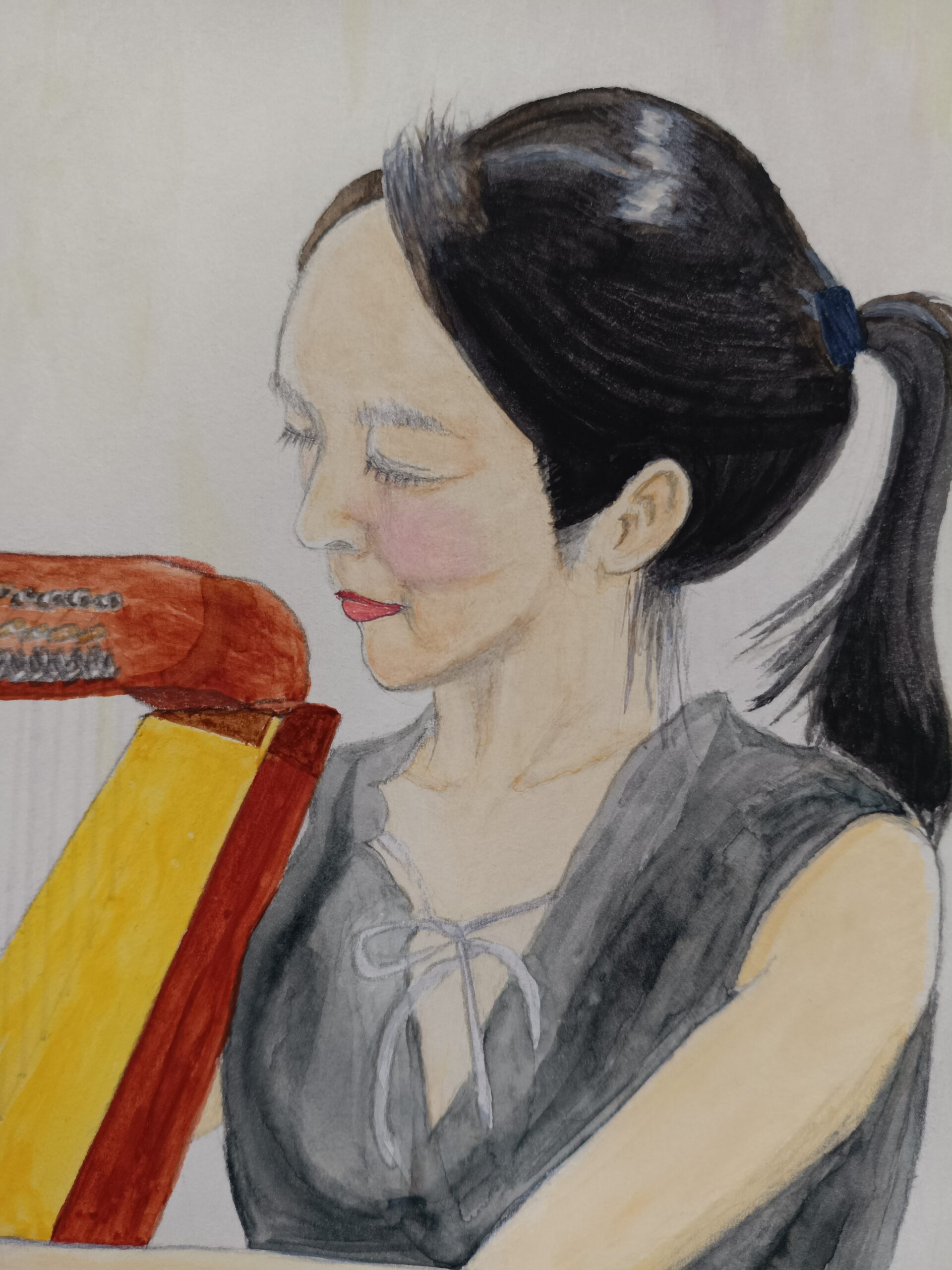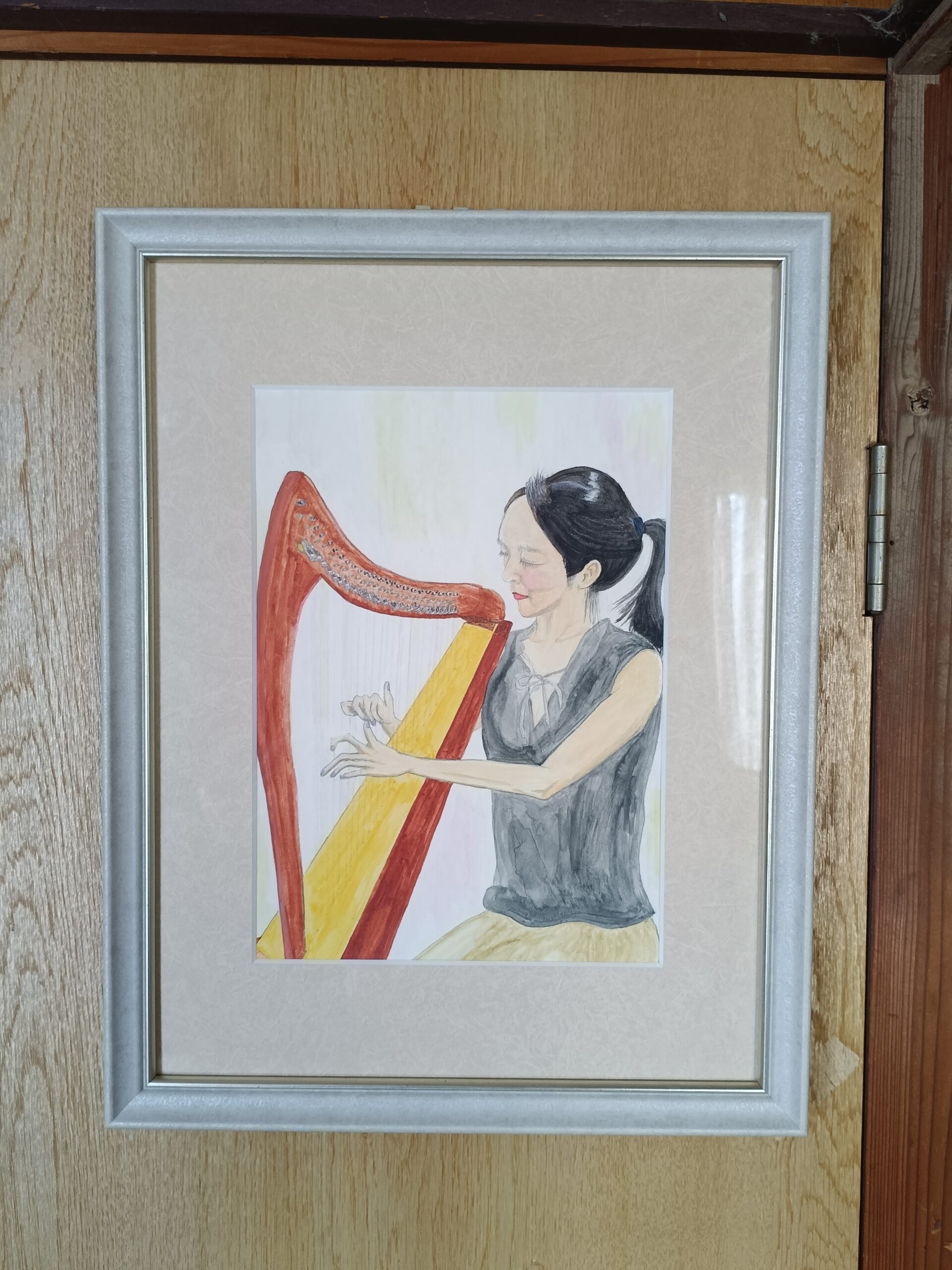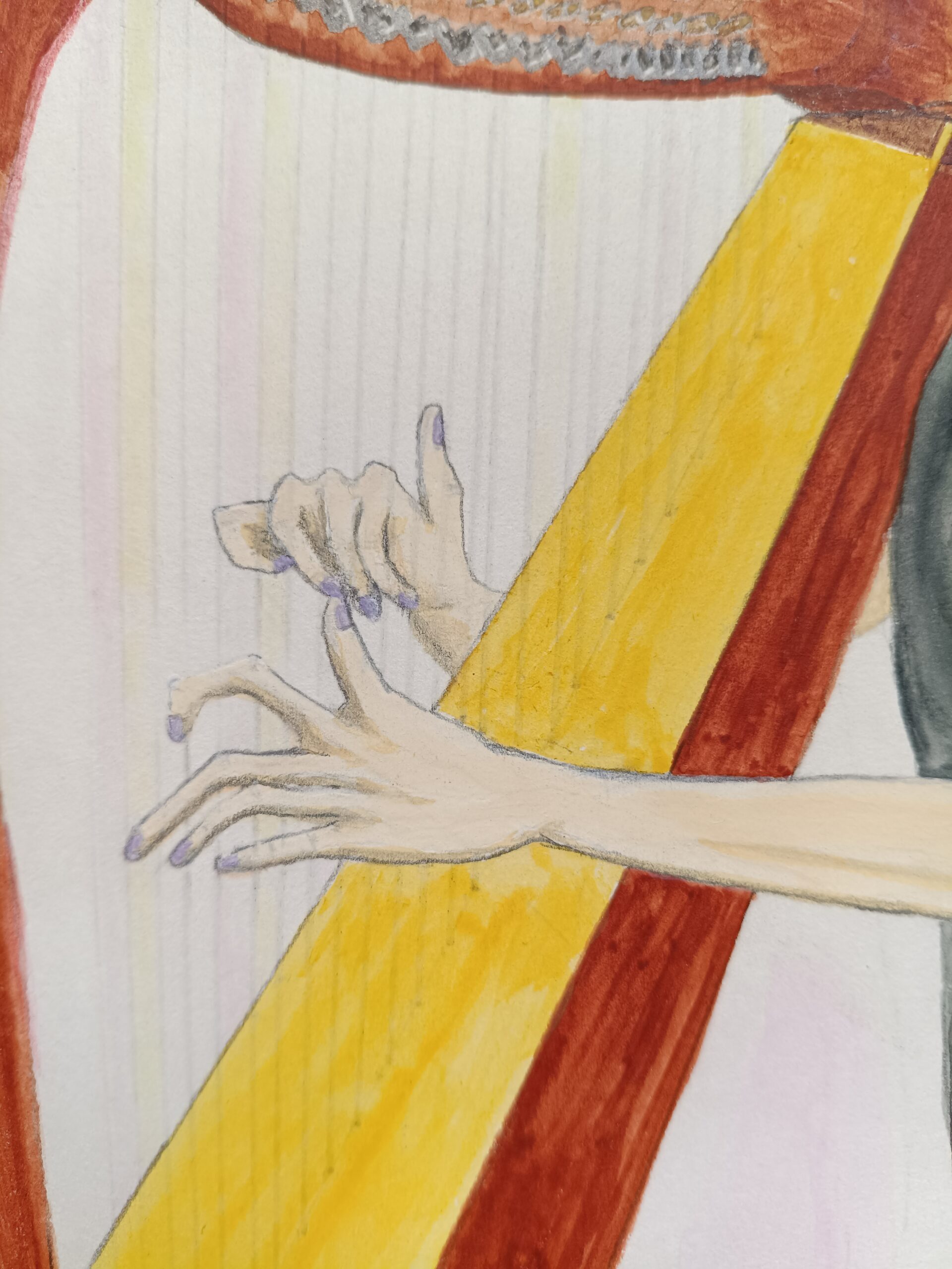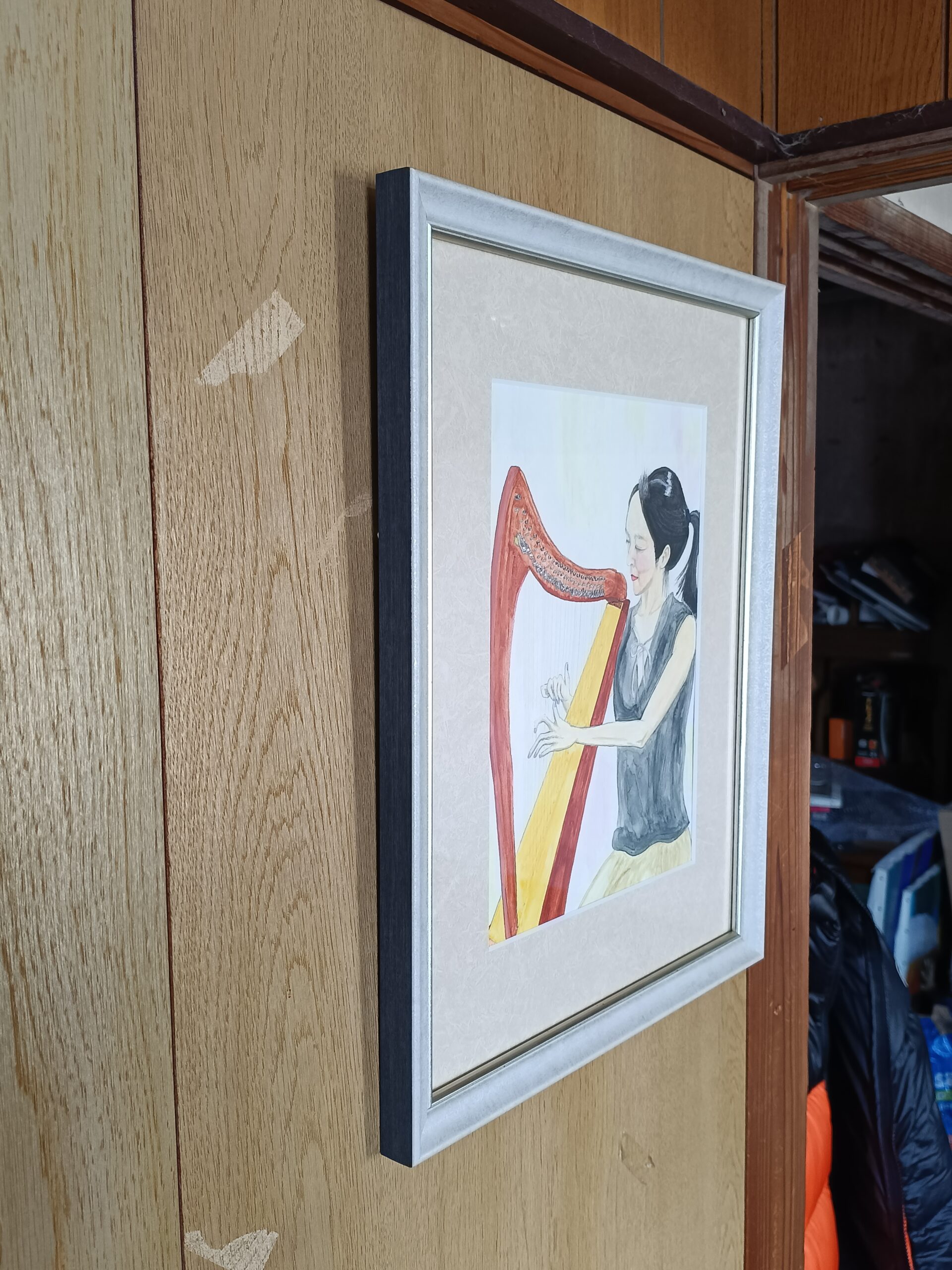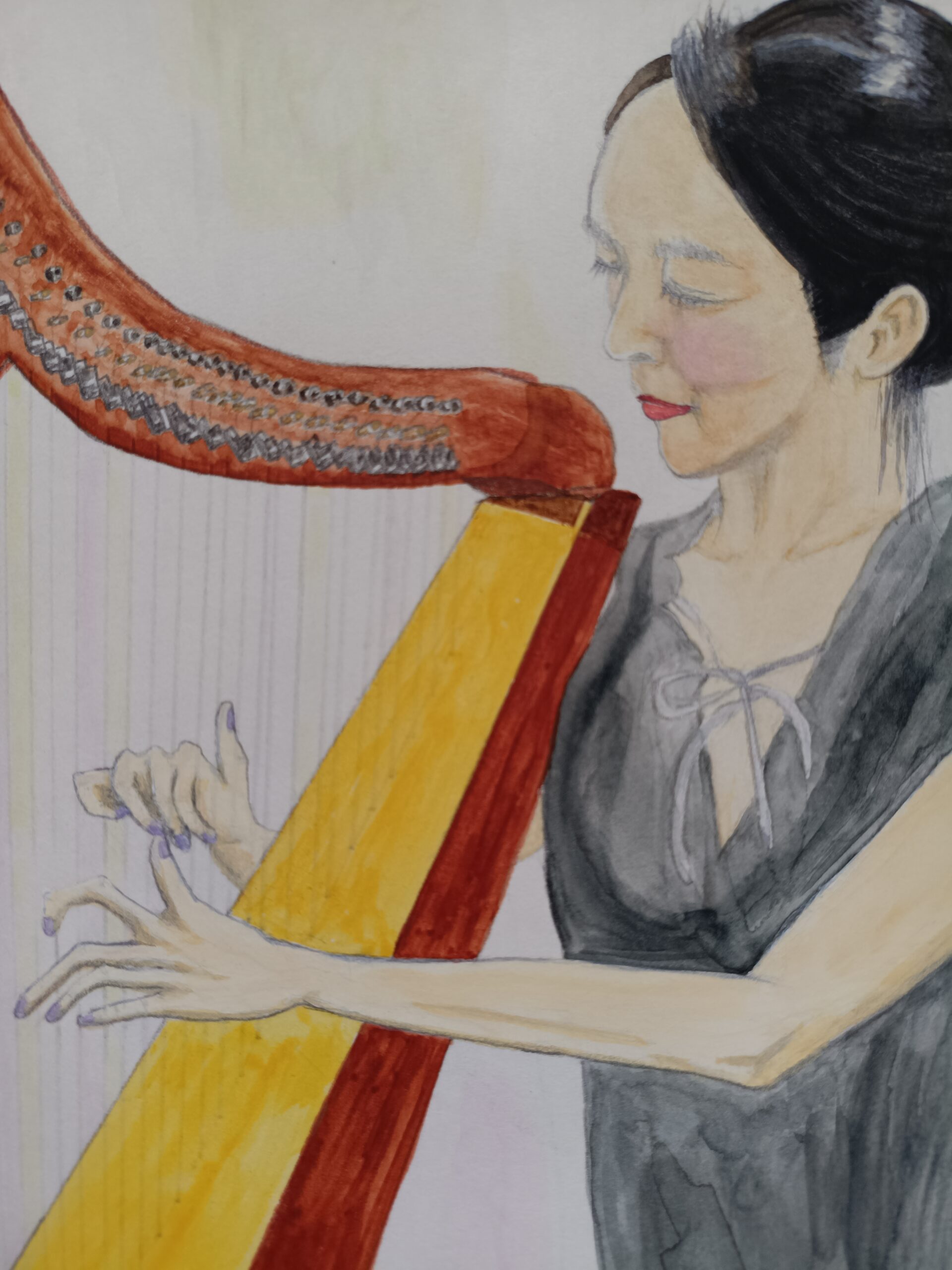 この絵画では、音楽に没頭するハープ奏者の繊細な優美さを捉えました。水彩と鉛筆を用いて、アーティストと楽器の親密な繋がりを表現し、柔らかな動きと静謐な集中力を強調することを目指しました。この作品は、あらゆる空間に穏やかな調和と叙情的な優雅さをもたらし、柔らかな写実性と繊細な感情を通して、静かな思索と安らぎを誘います。