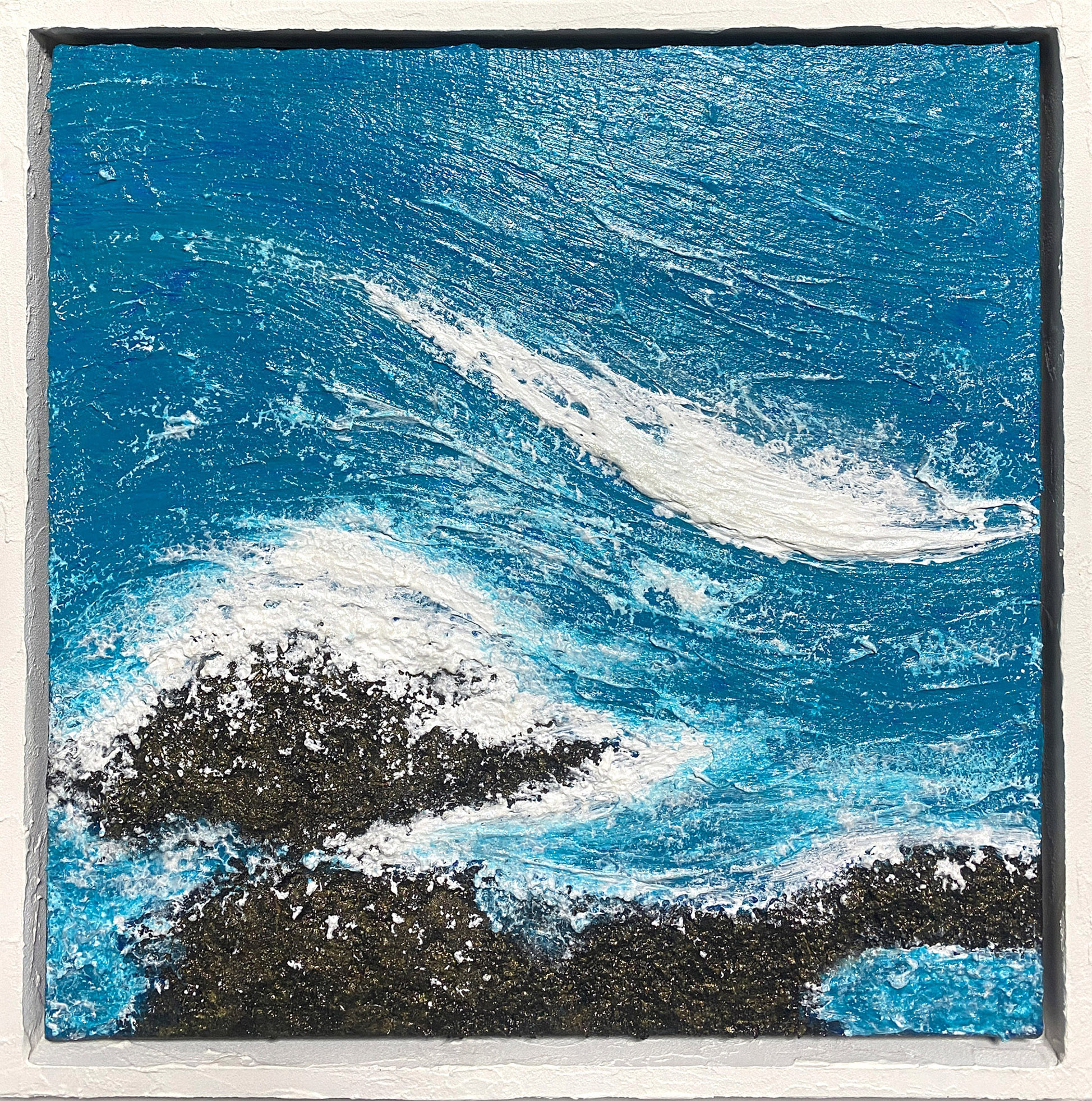 荒々しい海岸線に打ち寄せる波と、それに耐える岩礁。青く透明な海水が岩にぶつかり、白い泡が弾ける。海の深みと、太陽の光を受けて輝く水面の質感が、自然の力強さと美しさを感じさせます。