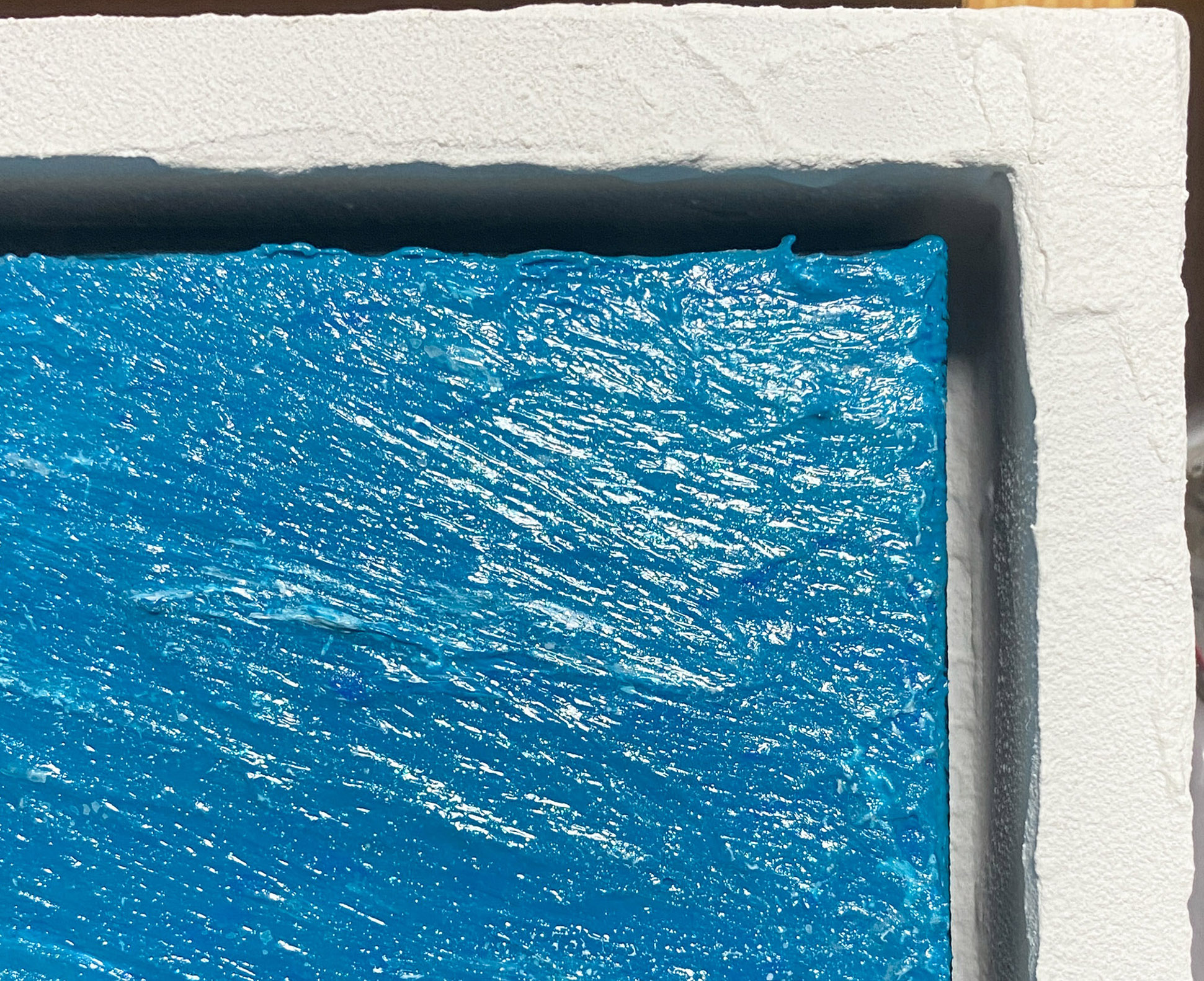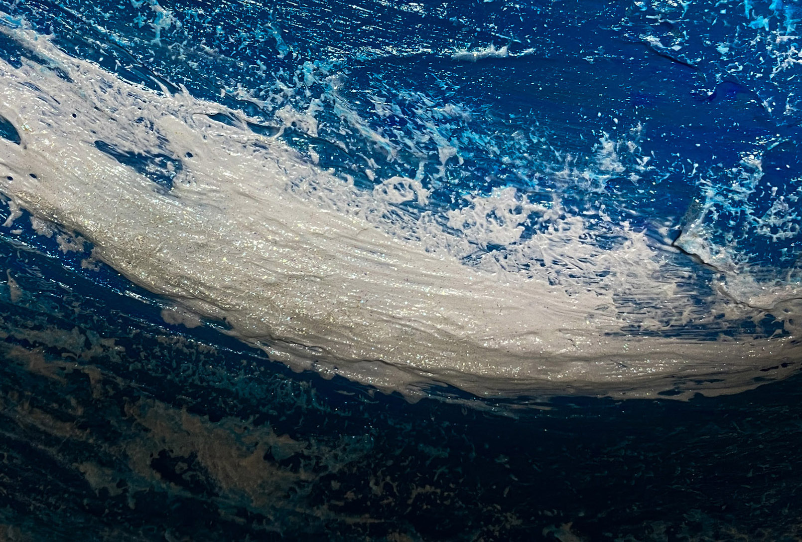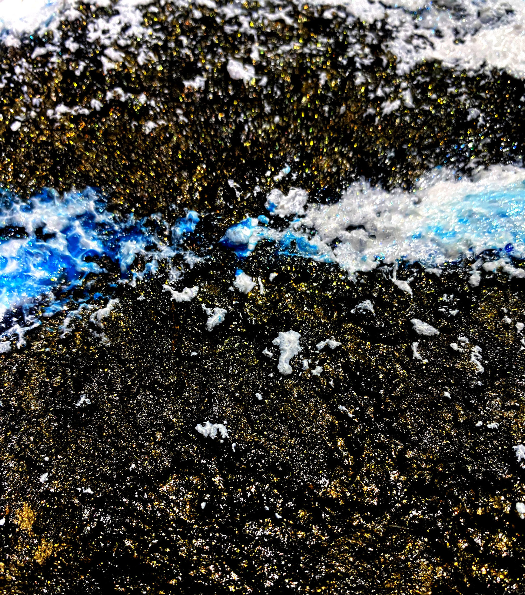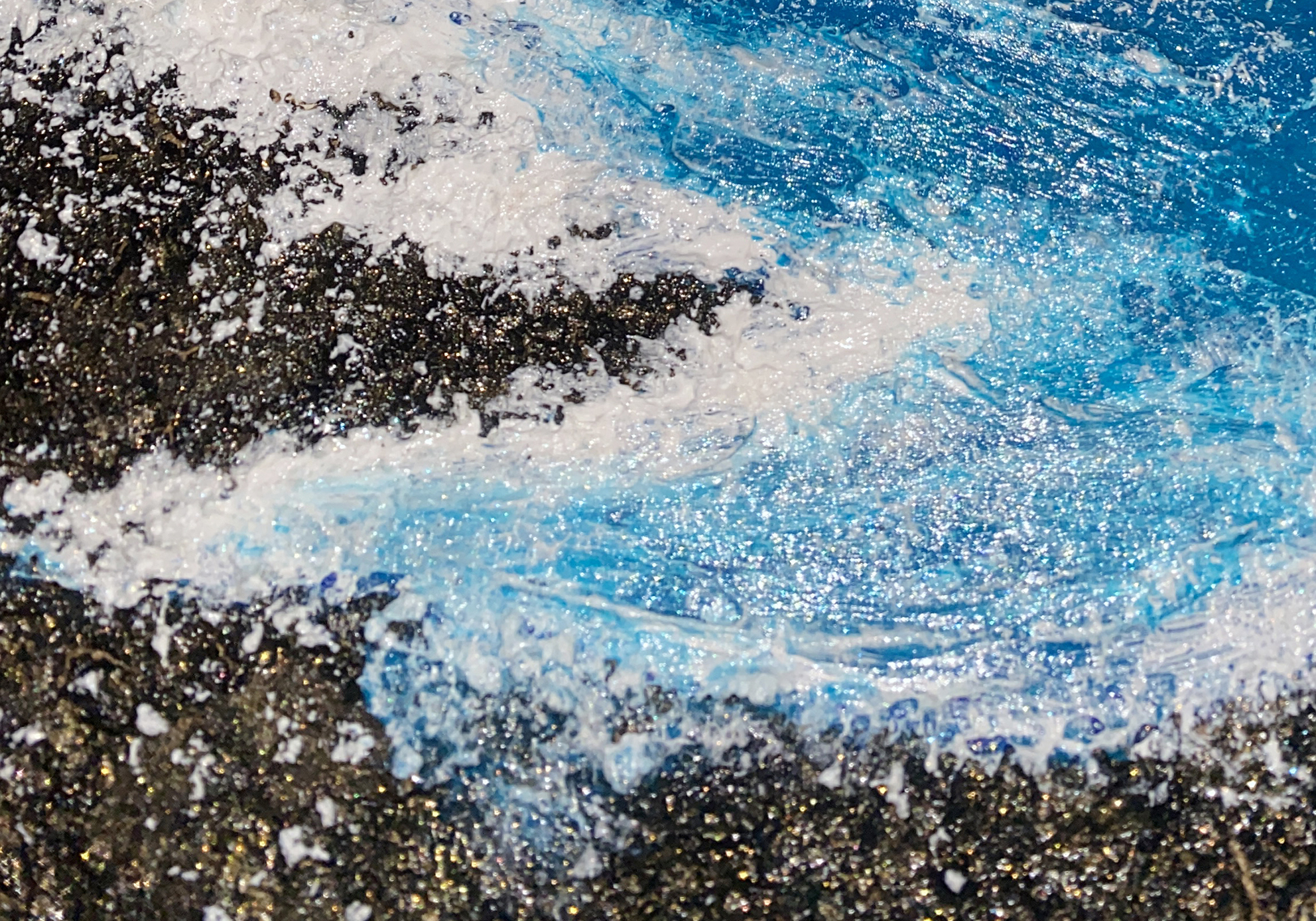 見る角度によって輝き方が変わる特殊なアクリル絵の具を使用しており、画面全体がキラキラと輝きます。