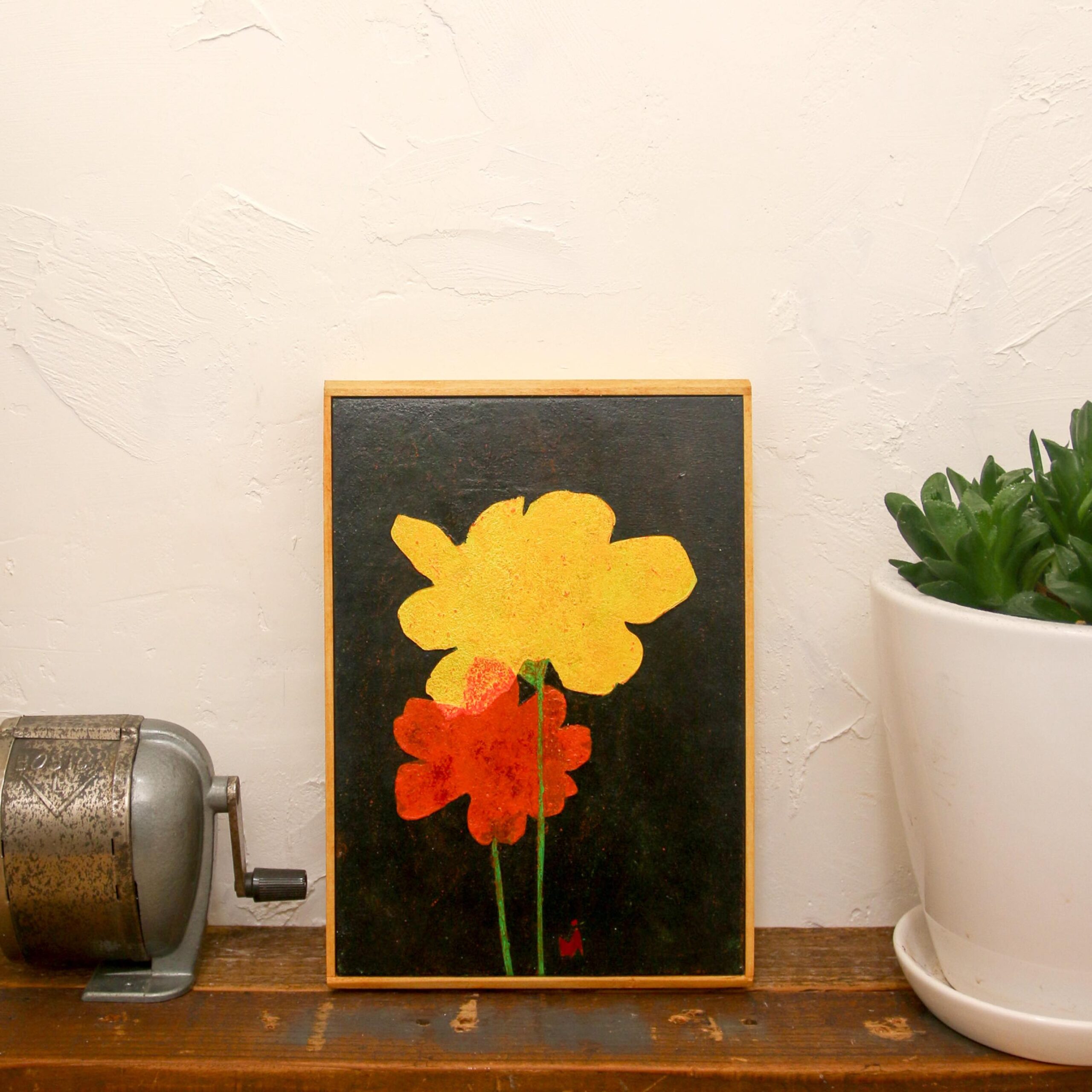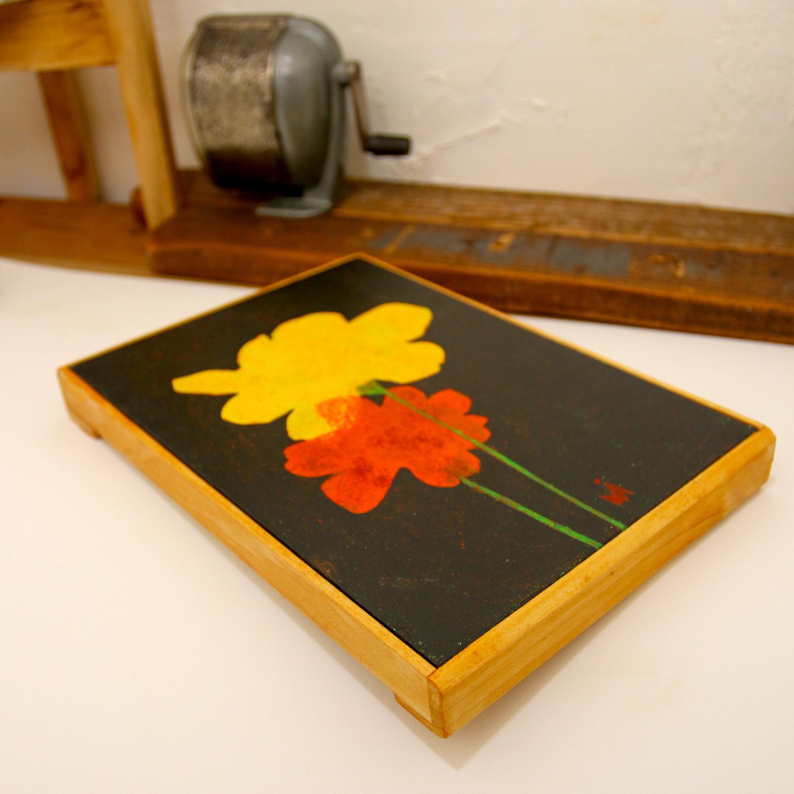 Materials: Wooden panel, acrylic paint, oil pastel
