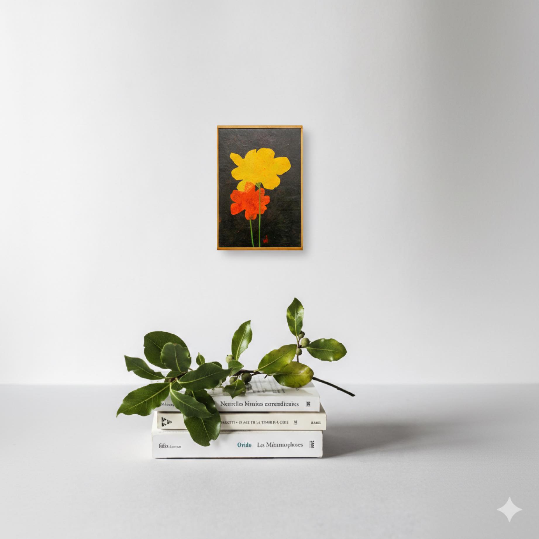 Two blossoms rise quietly from a field of deep black.