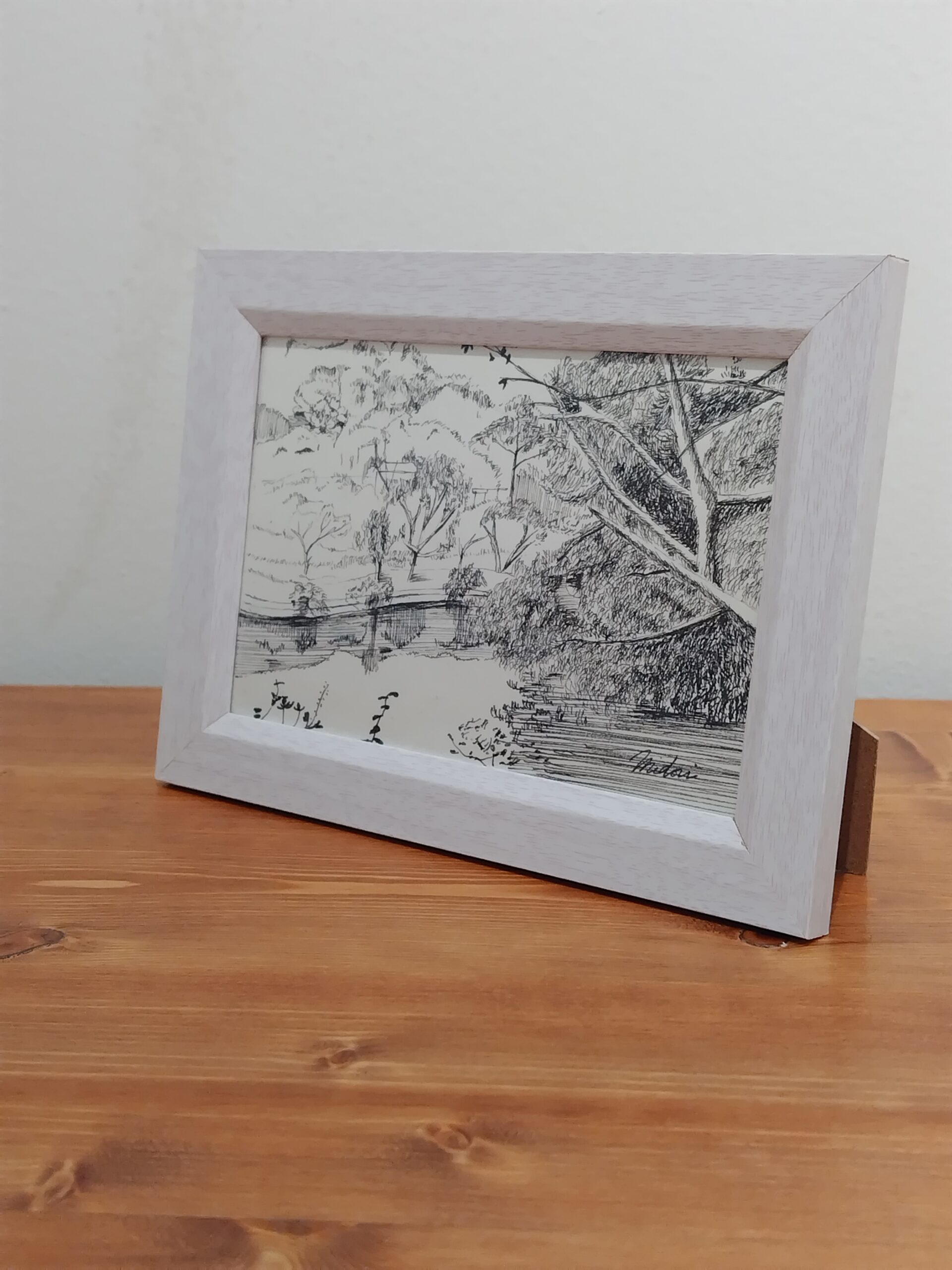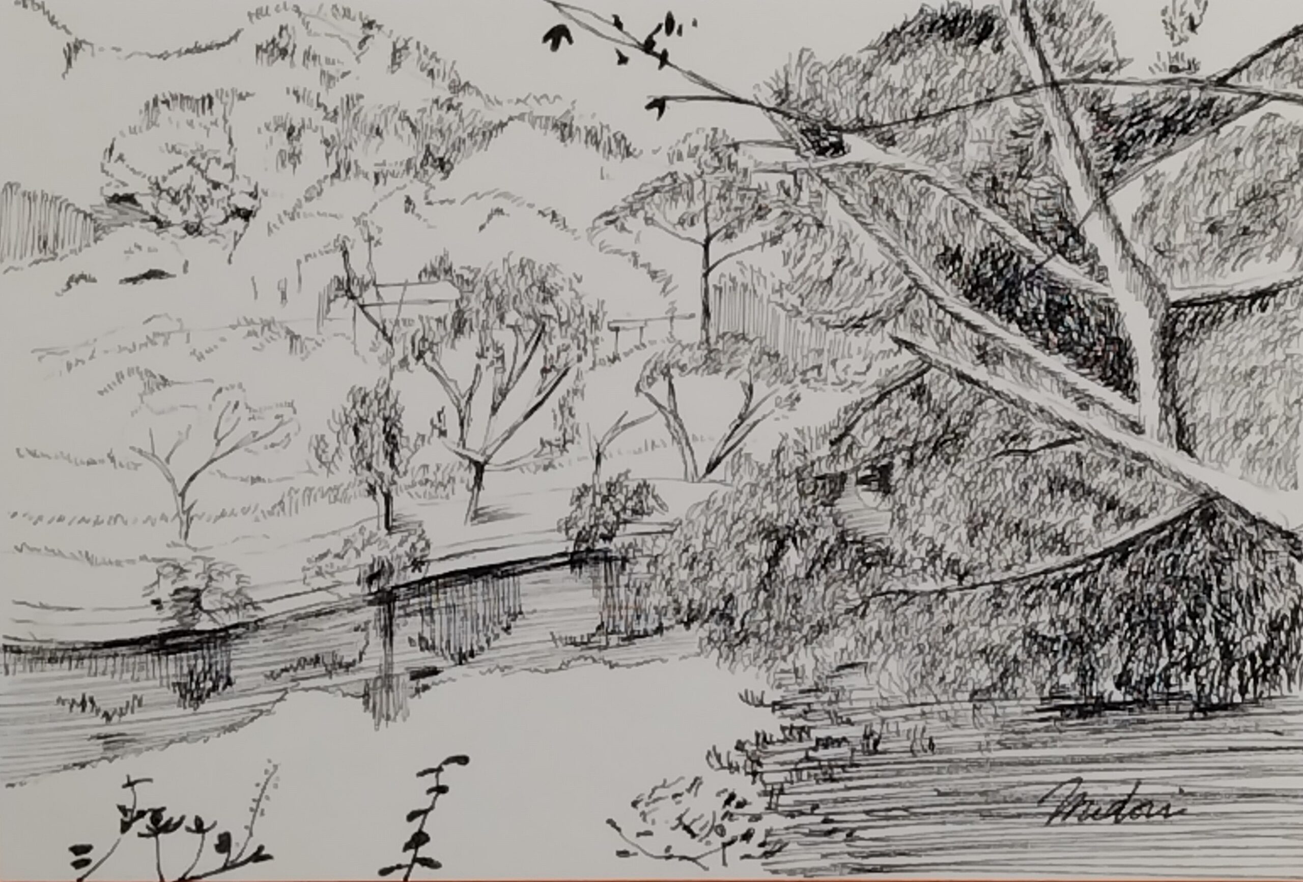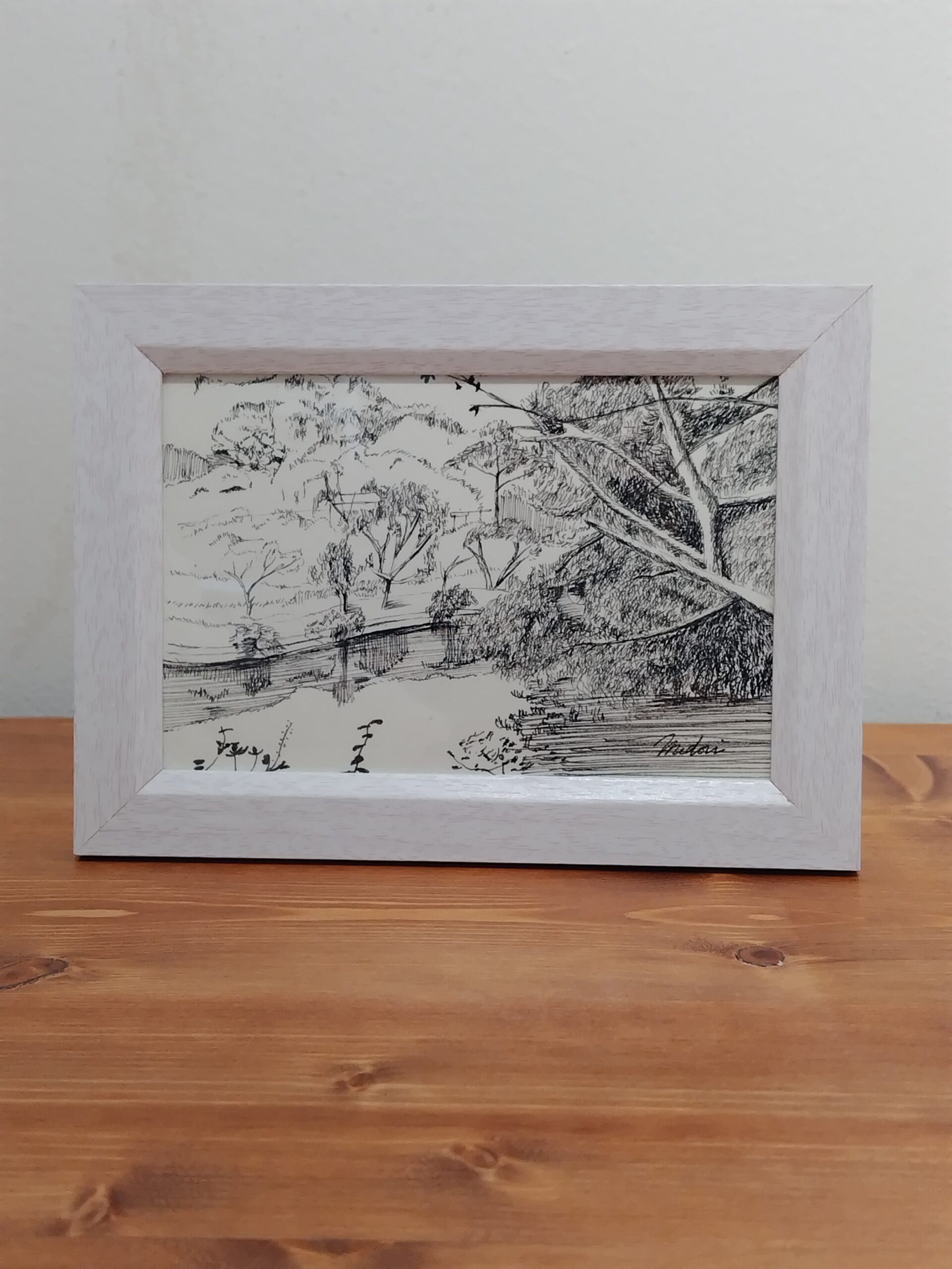 森に面した湖をペンの精緻な筆致で描きました。美しい黒色をお楽しみください。