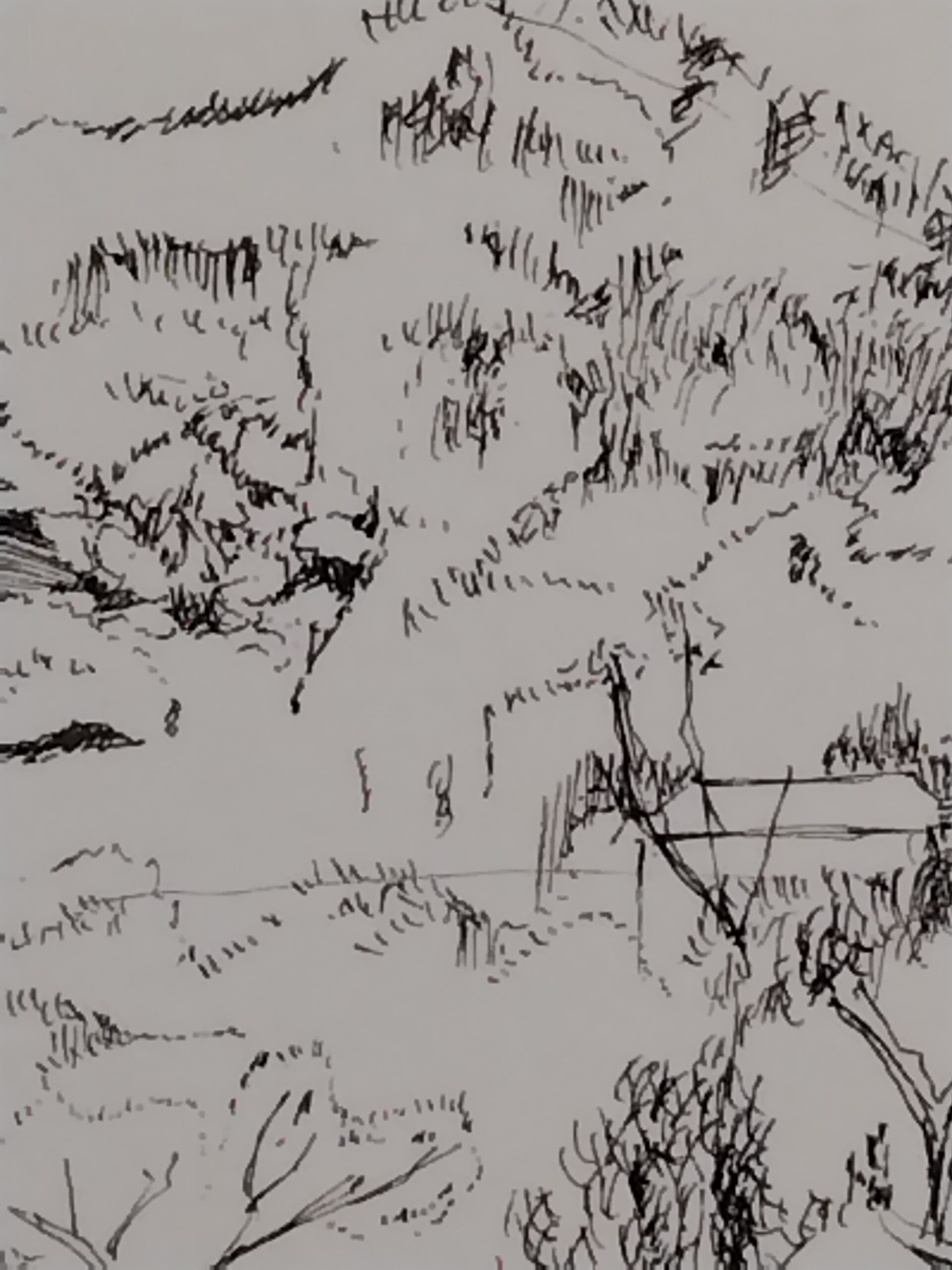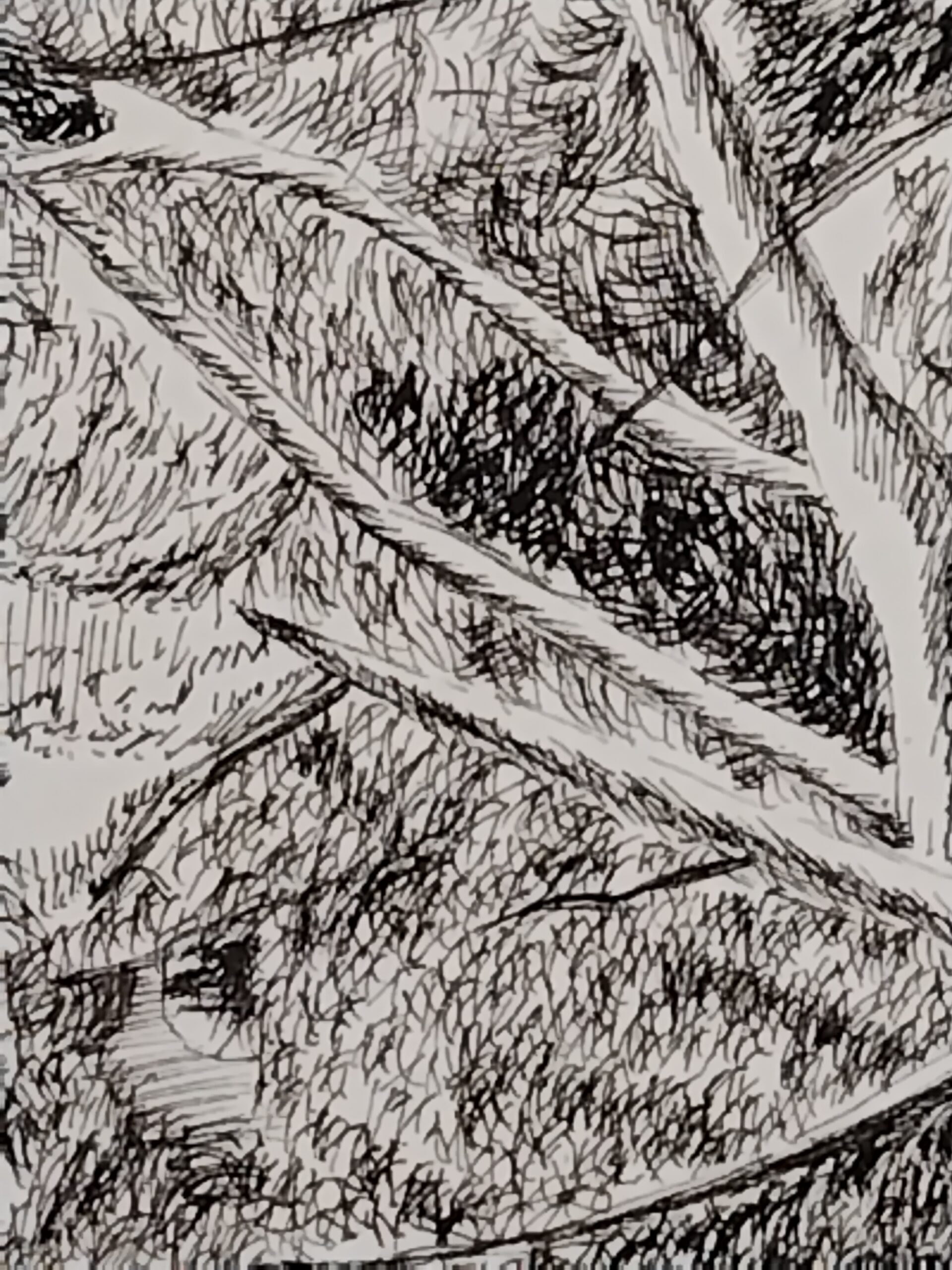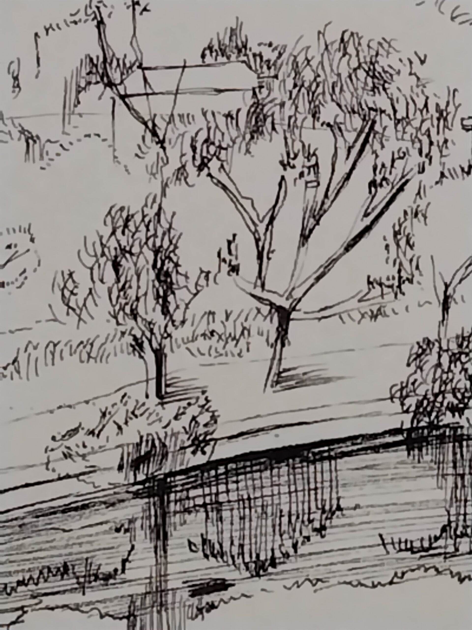 森に面した湖をペンの精緻な筆致で描きました。美しい黒色をお楽しみください。