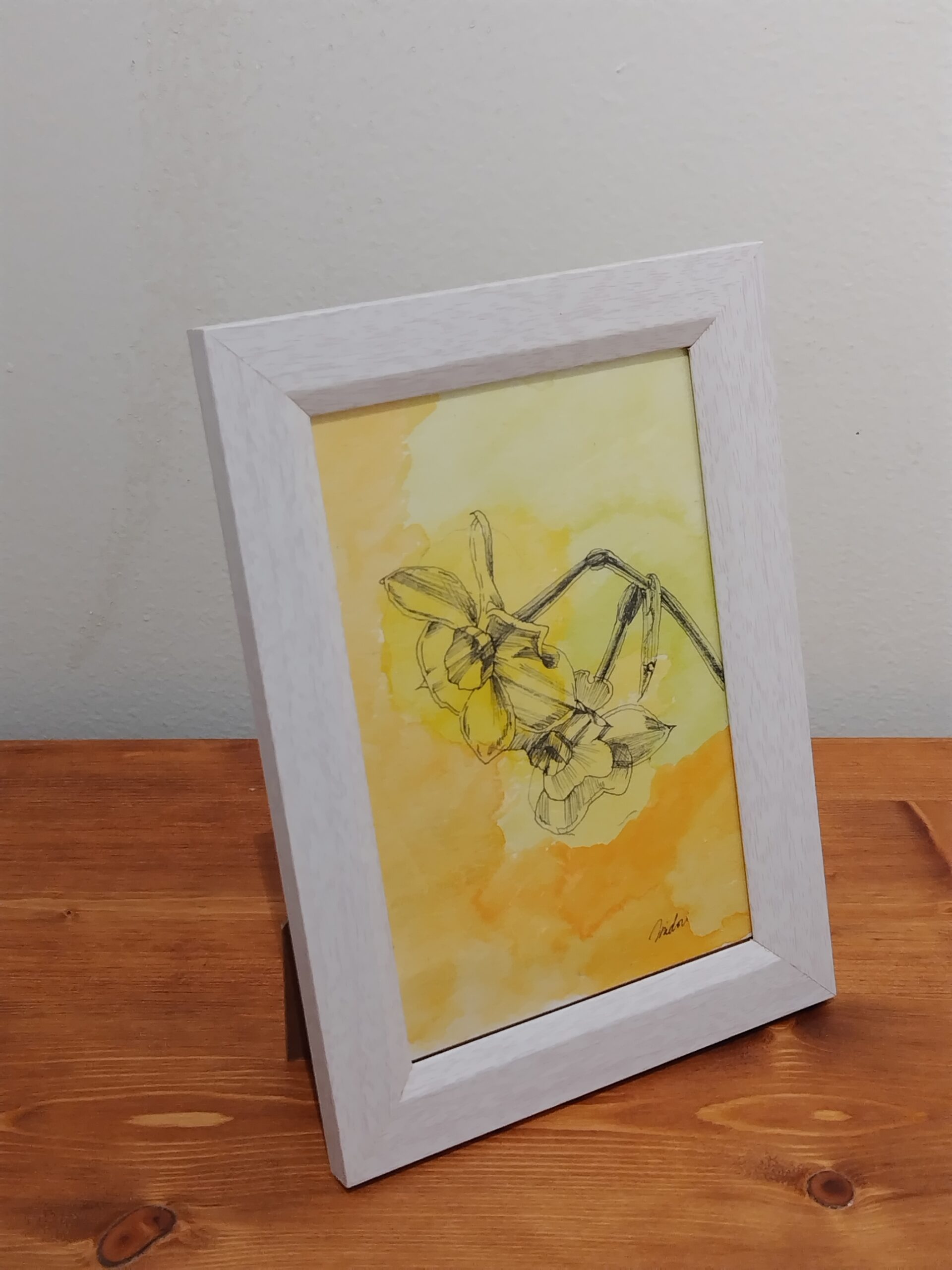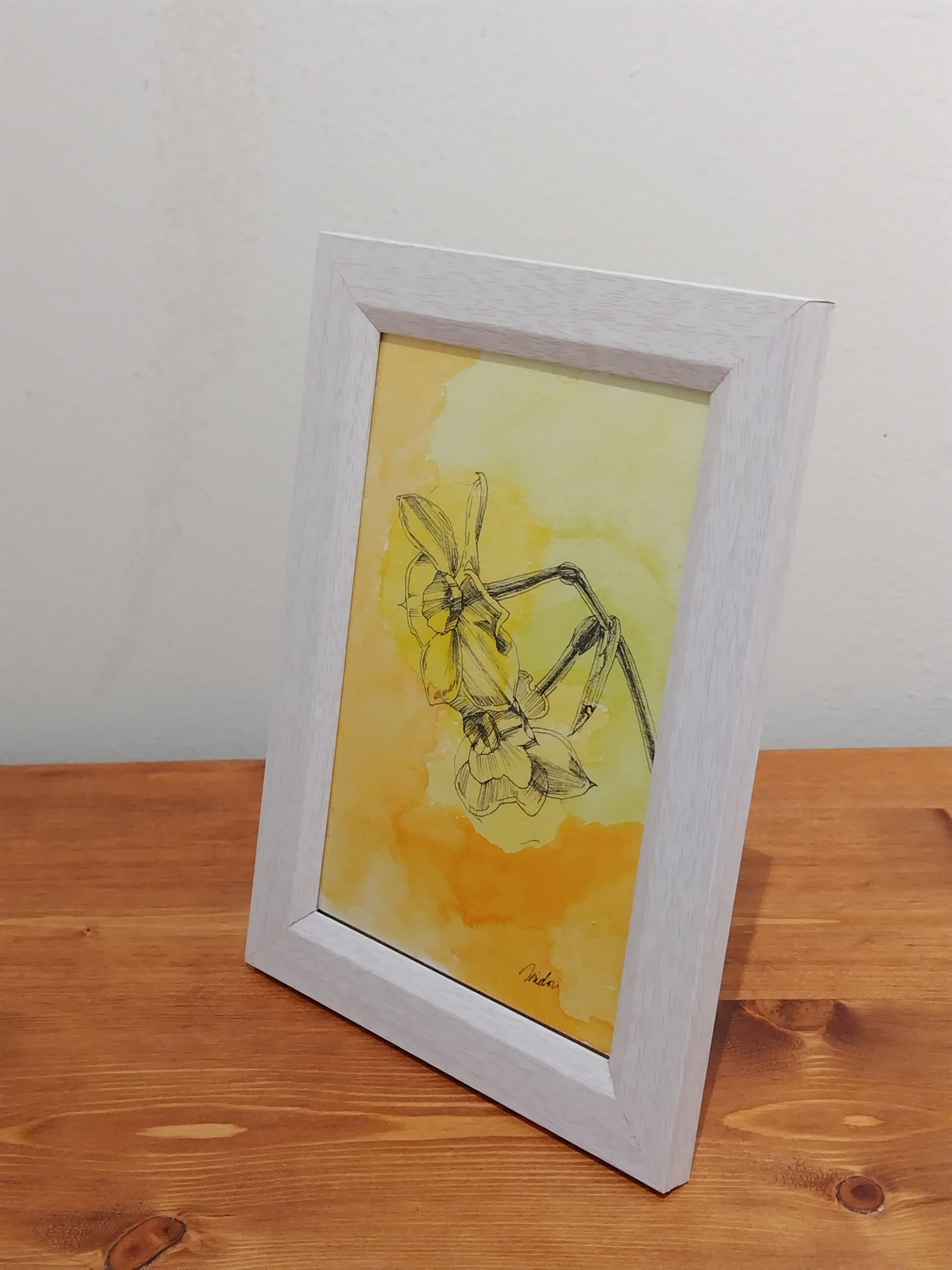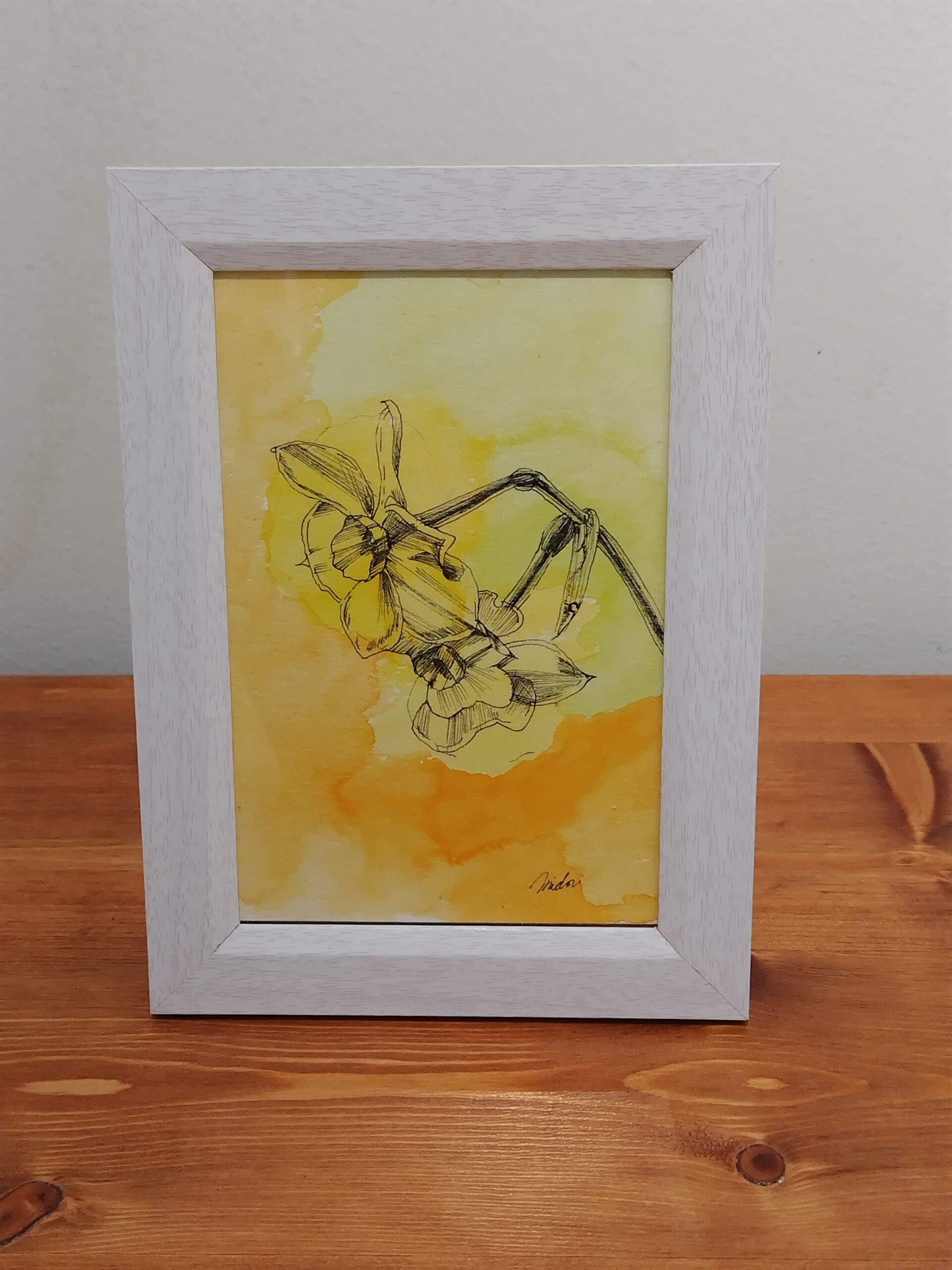 明るい黄色の水彩の上にスイセンの花を描きました。お部屋がパッと明るくします。