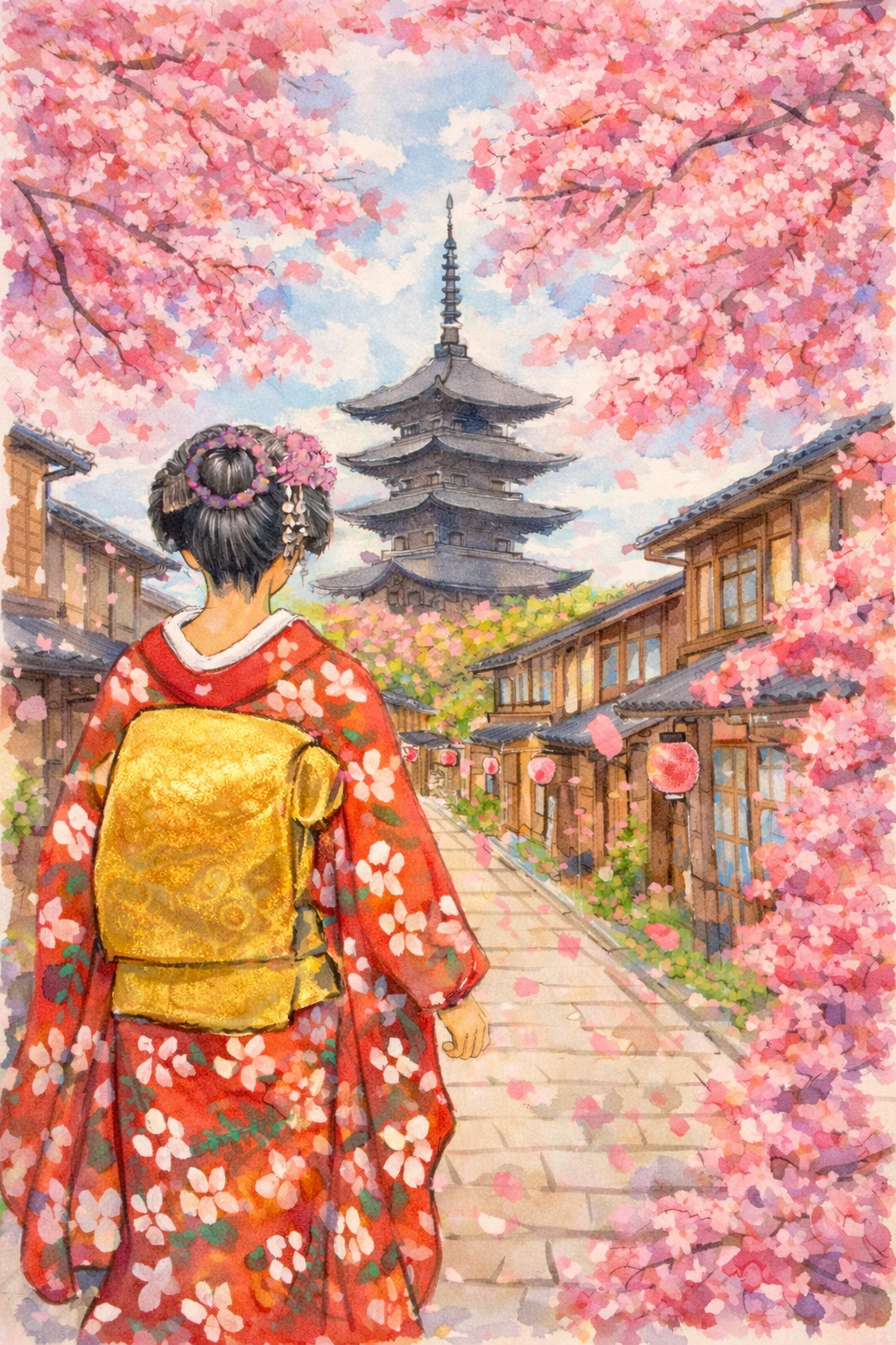 着物姿の女性歩く後ろ姿を描き、