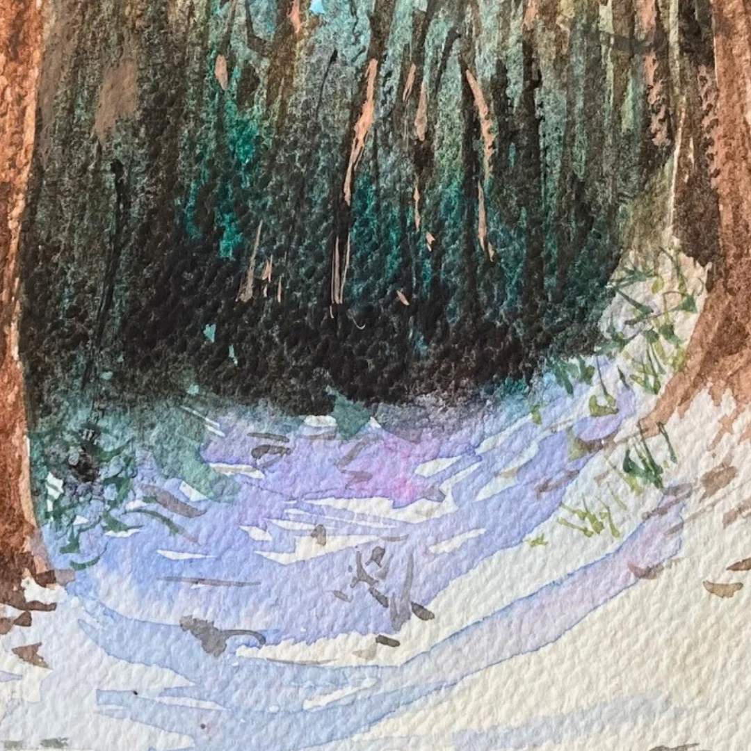 雪が降った直後の静かな雪道を水彩で描きました。少し冷たい空気が画面から伝われば幸いです。