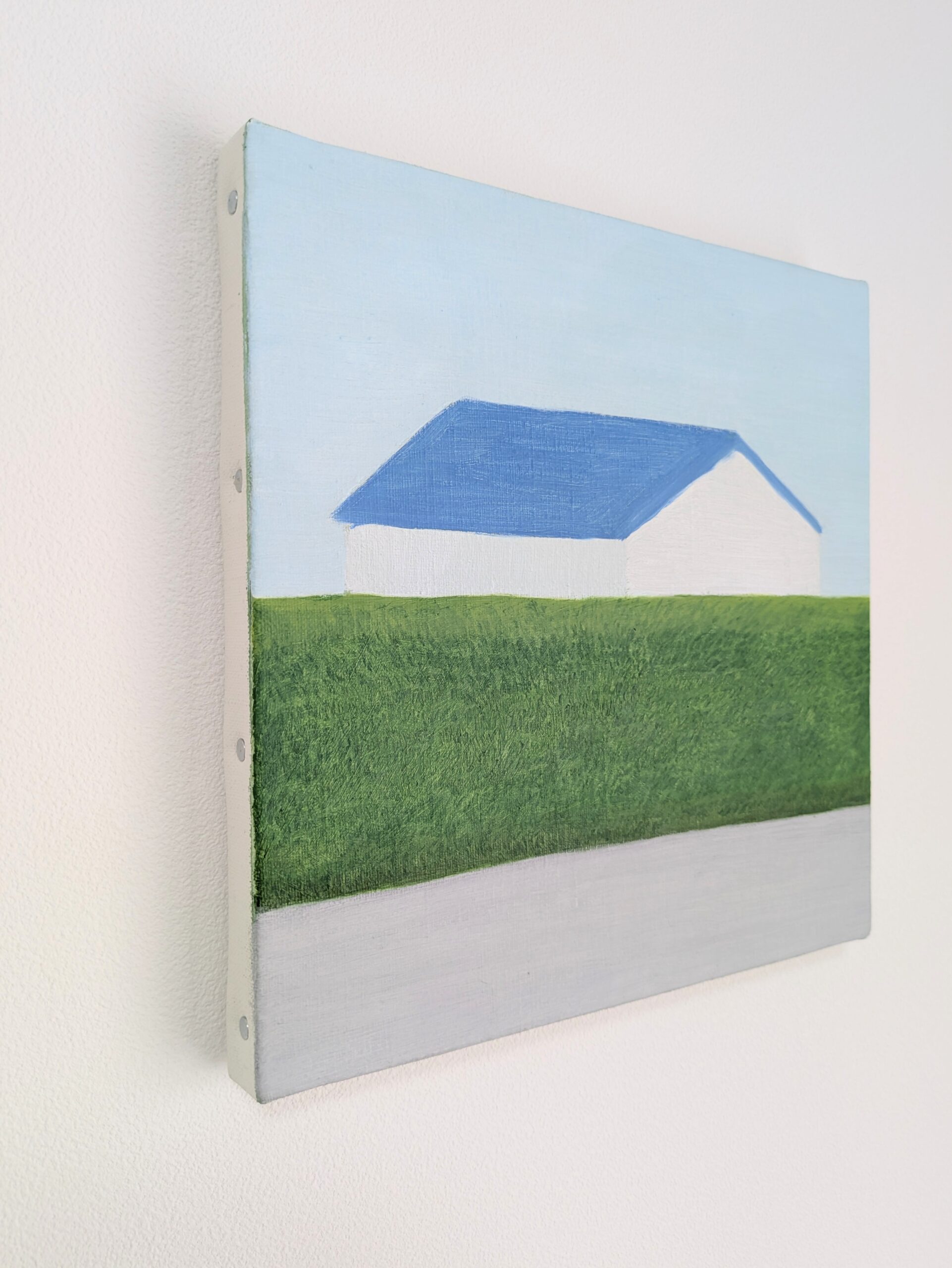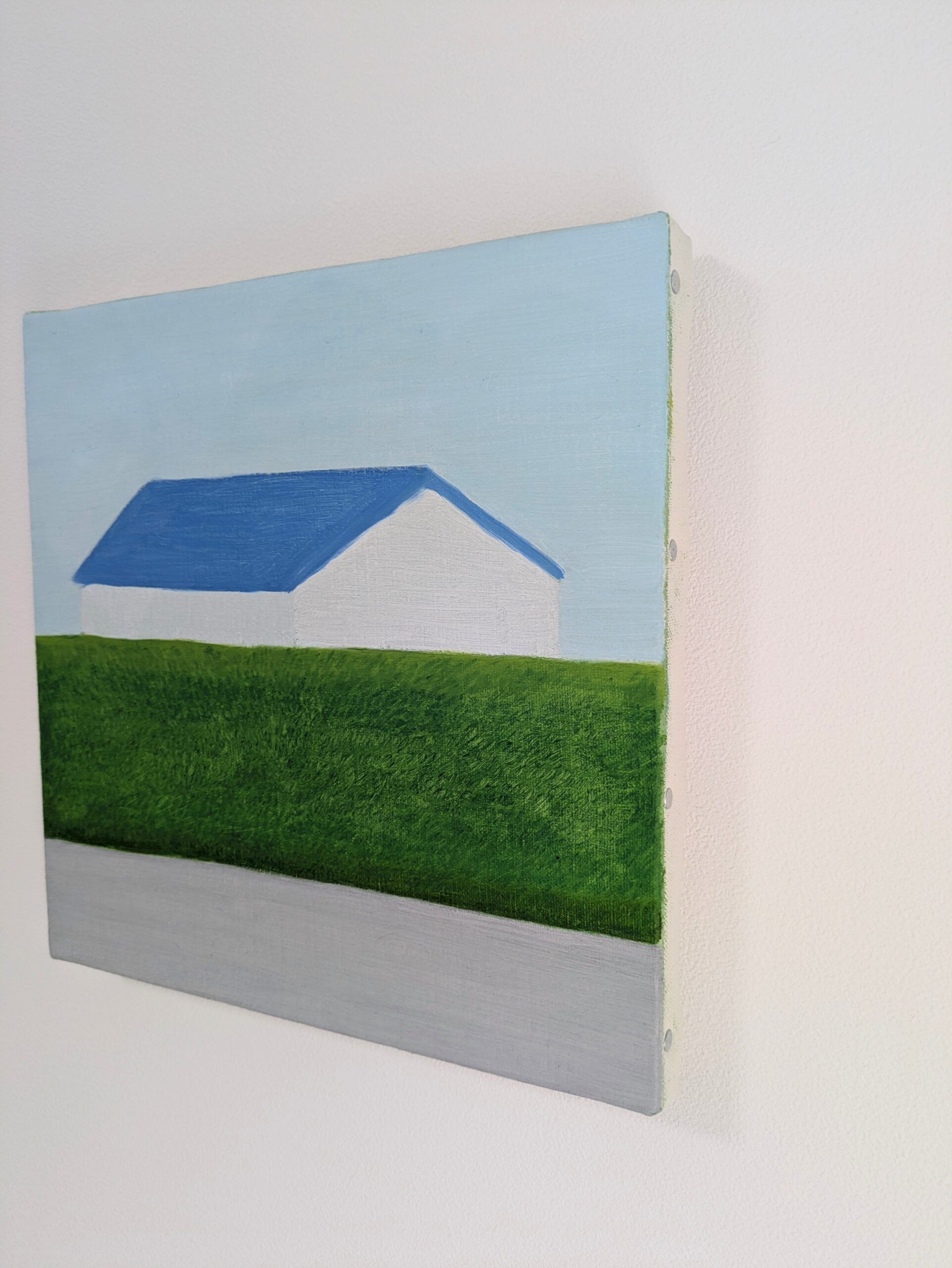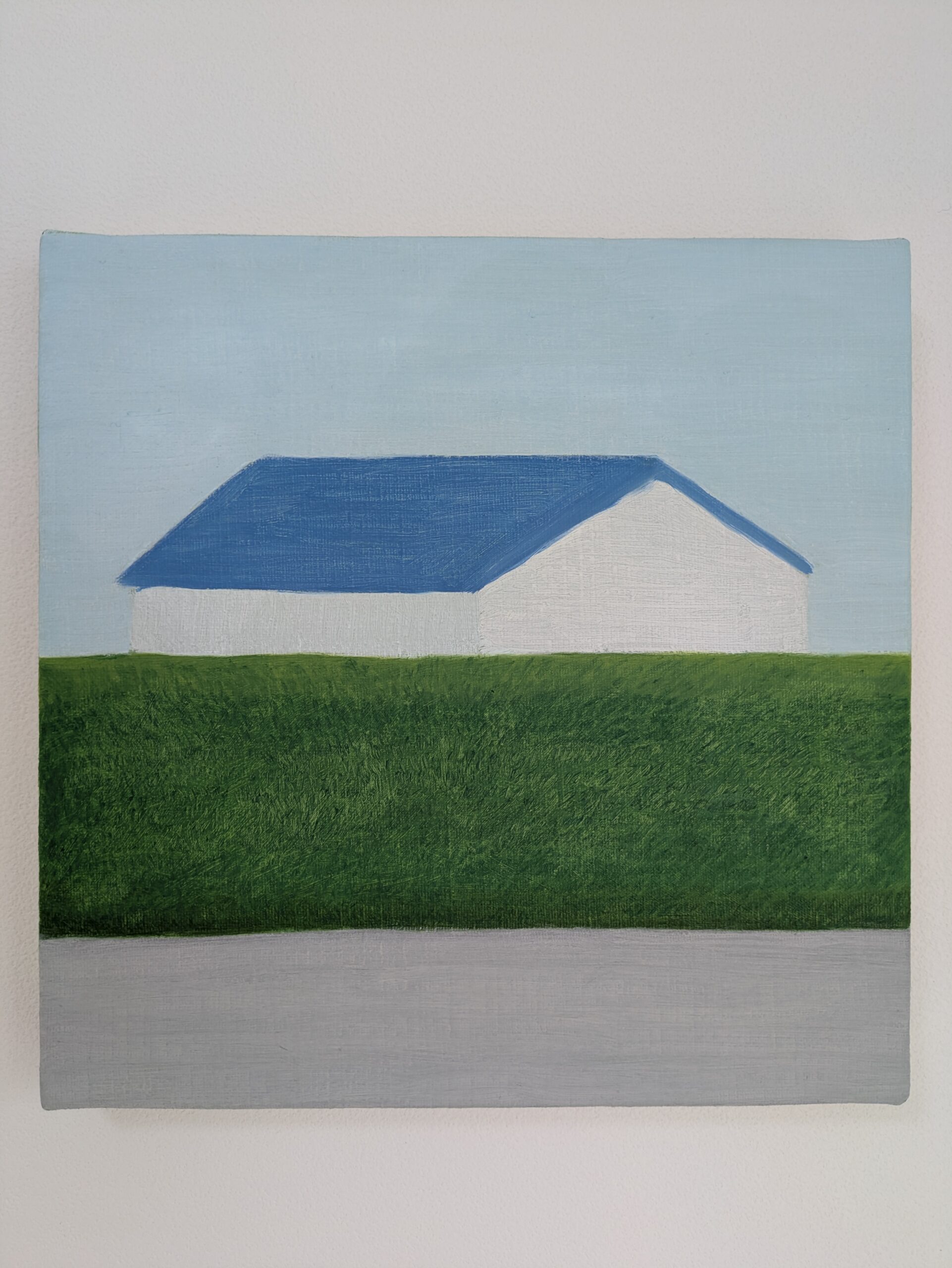 水平に重なる地面と生垣とその向こうにある家。その形と距離感に心を奪われ描いた一枚です。