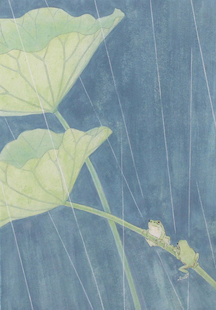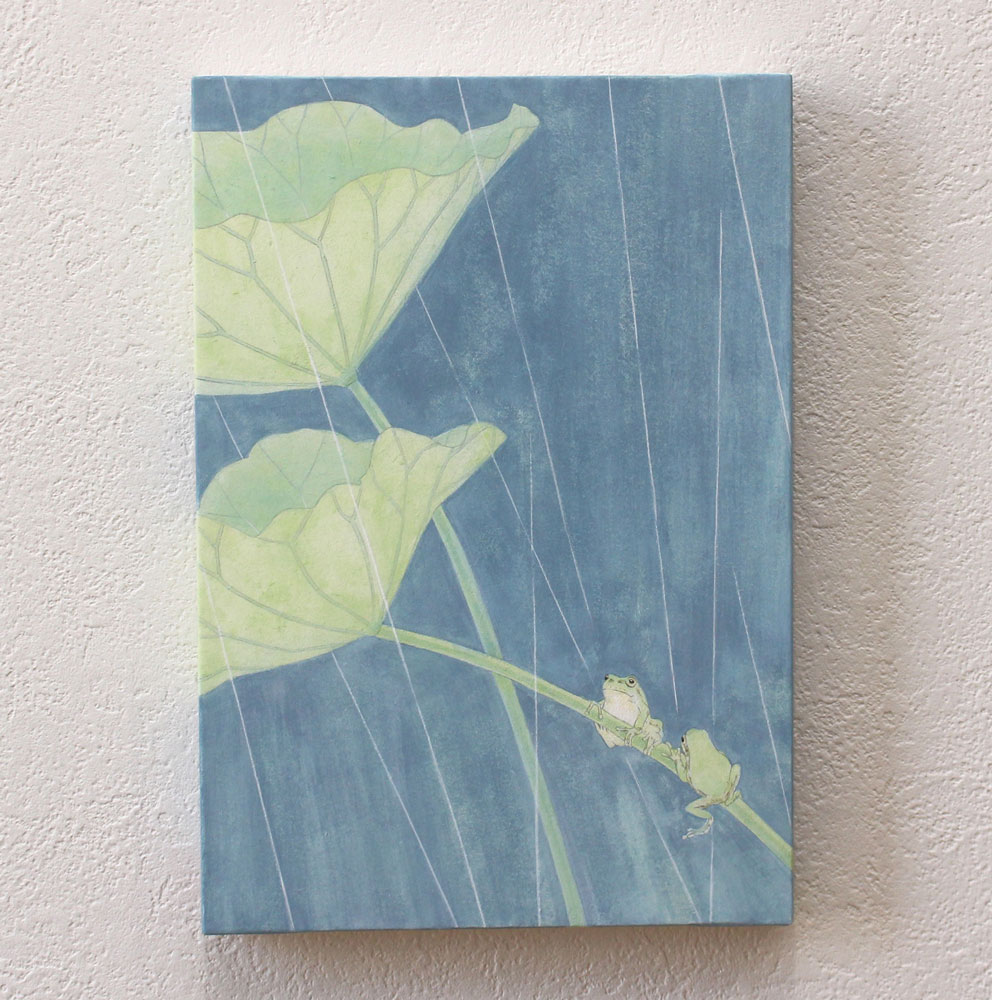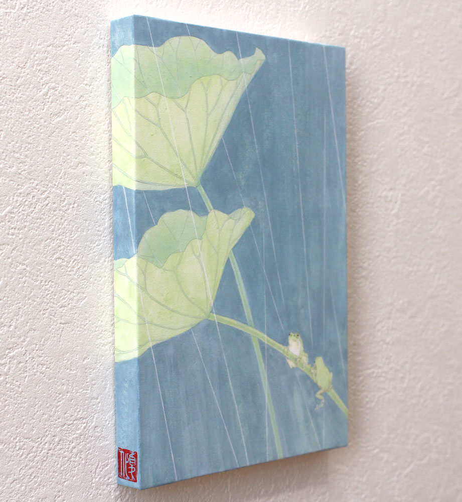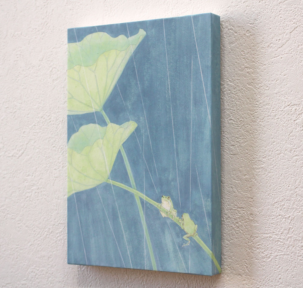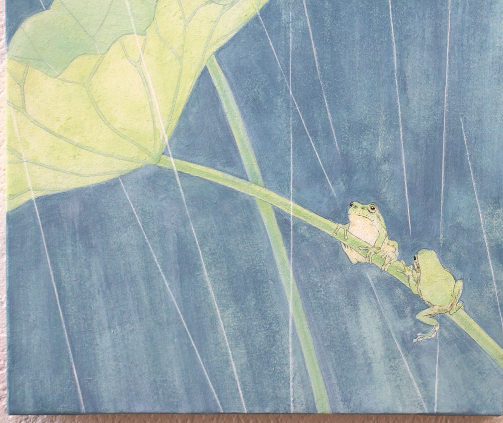 ハスの淡いグリーンと背景の群青から落ち着いた世界観に仕上がりました。