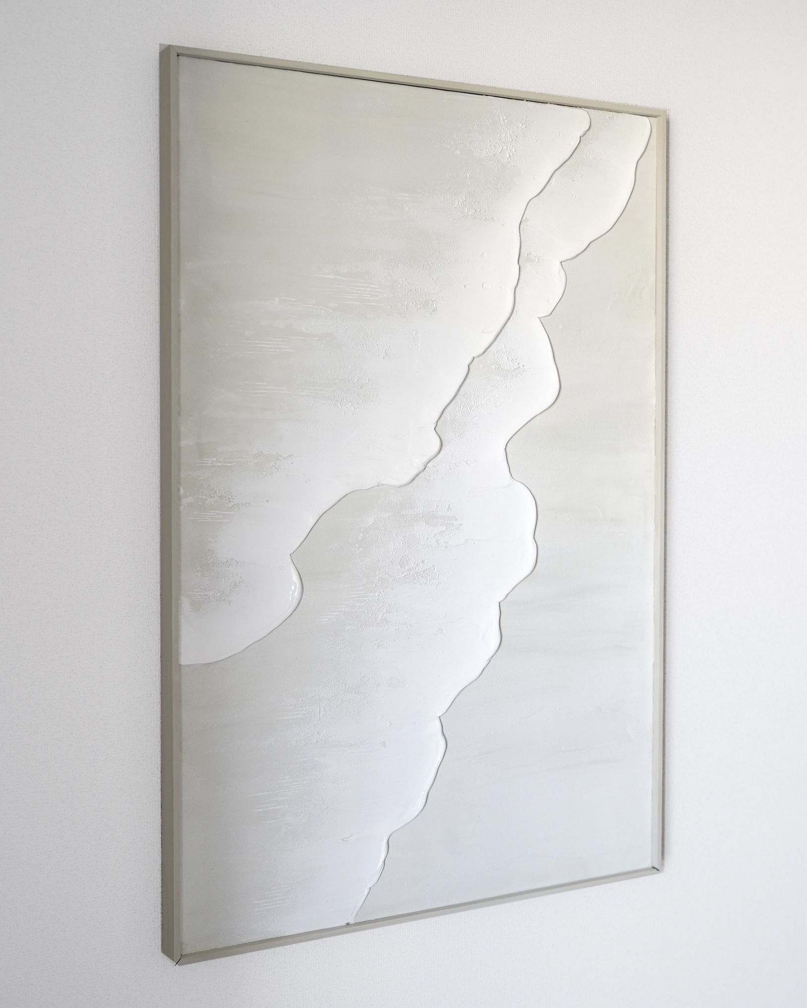 私は一人で風景の写真を撮りに出かけます。そこで目にした、穏やかながら滞ることのない波打ち際からインスピレーションを得ています。二度と同じ形で現れることのない無形の波を、確かにあった一瞬を、アートとして表現しました。
