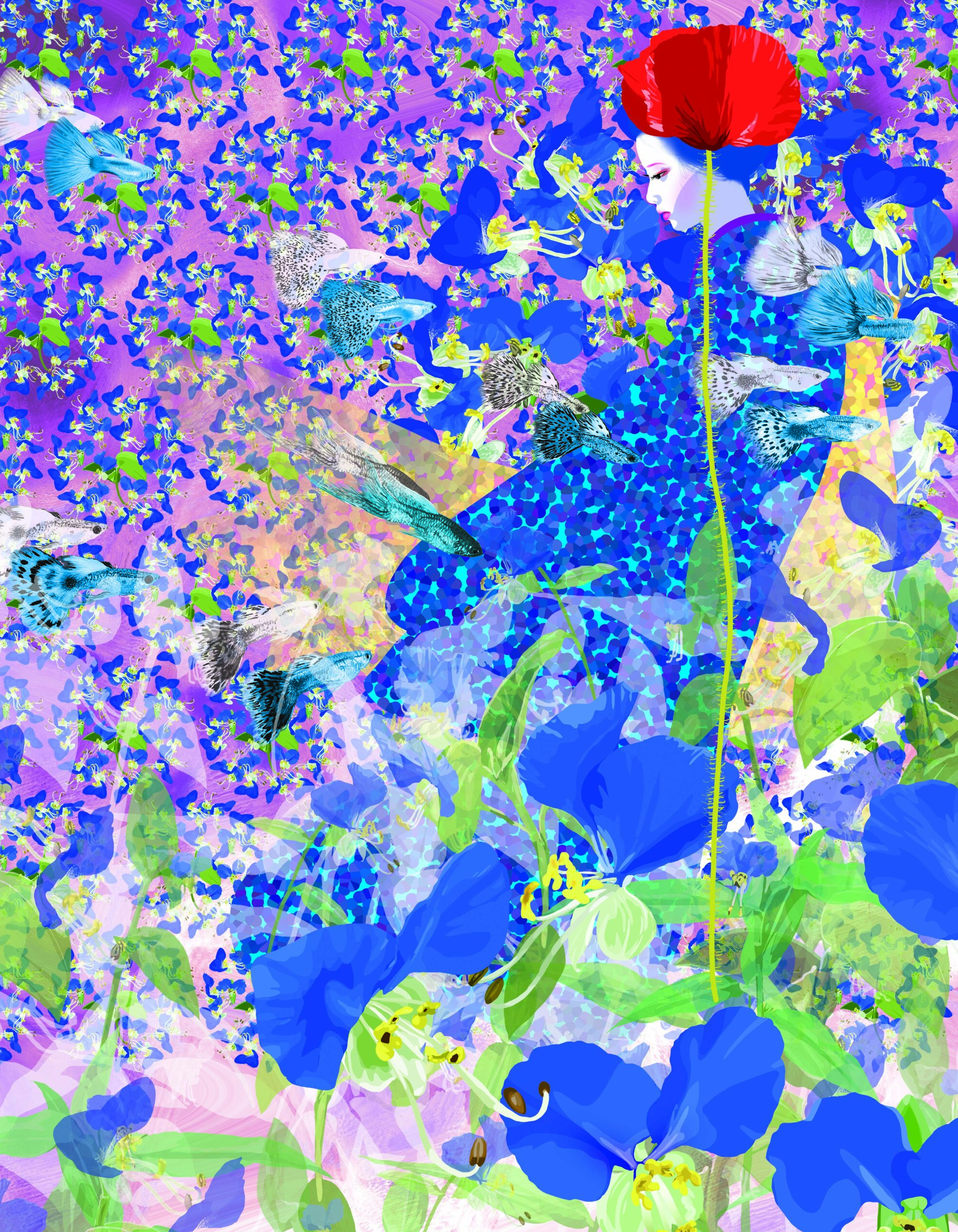 露草の水中をグッピーが泳ぎます。