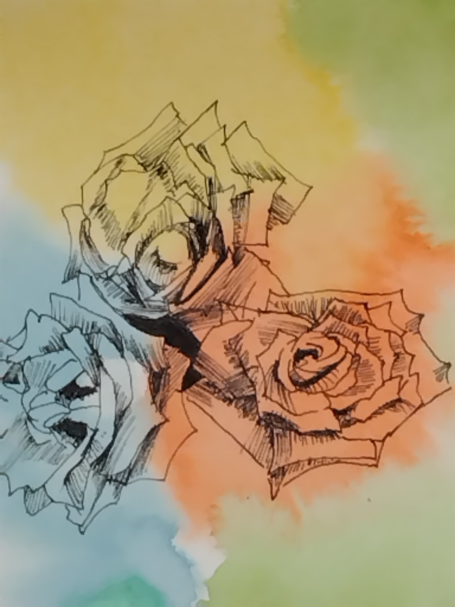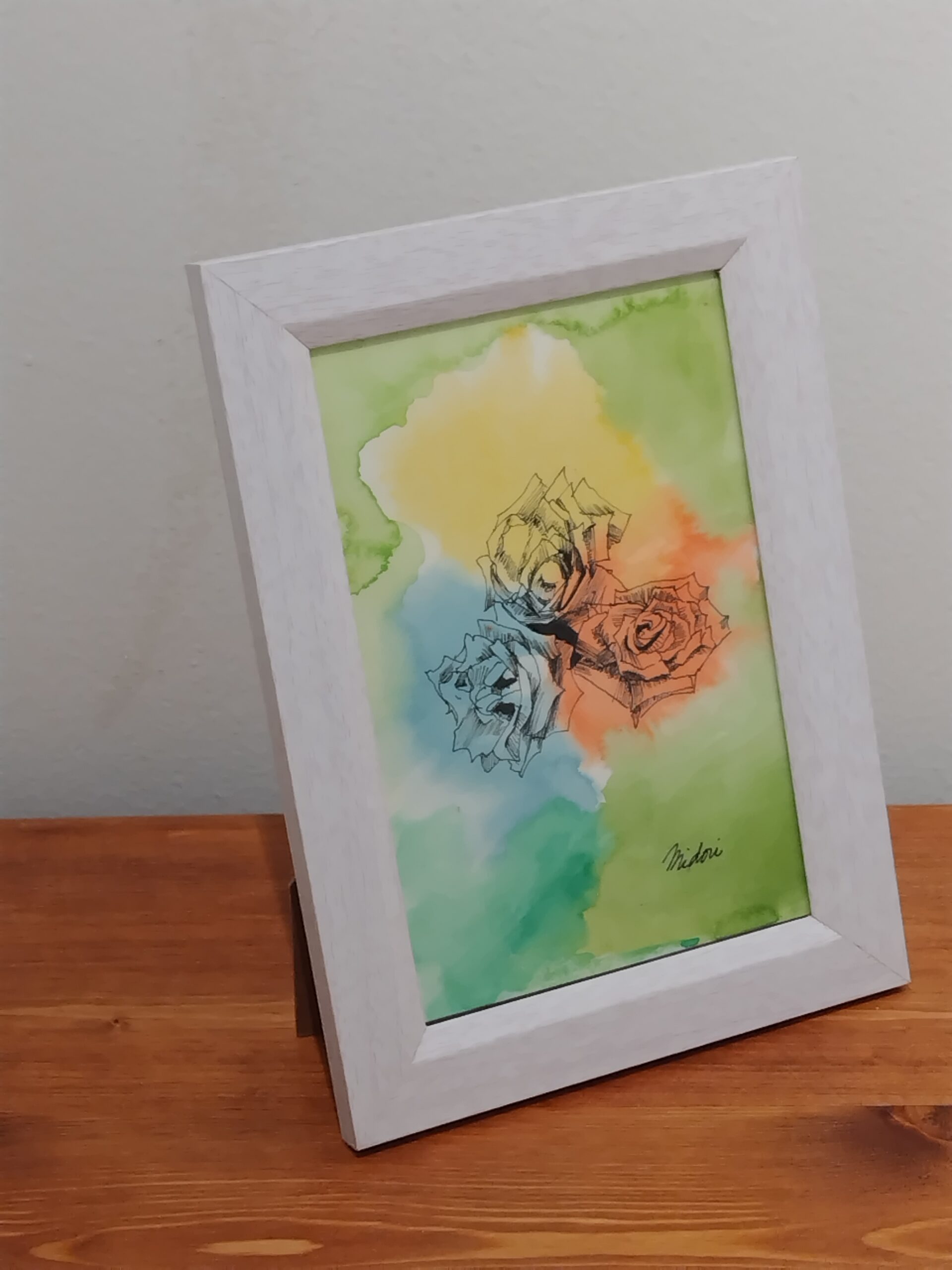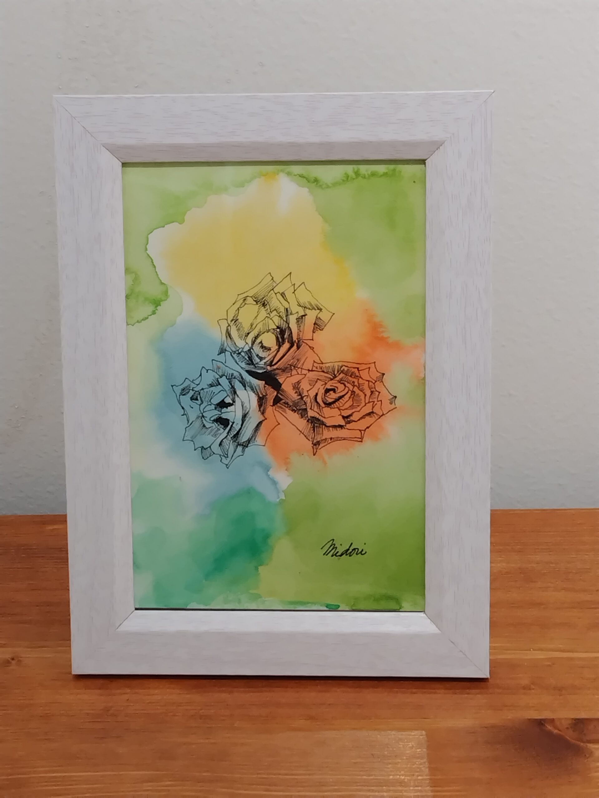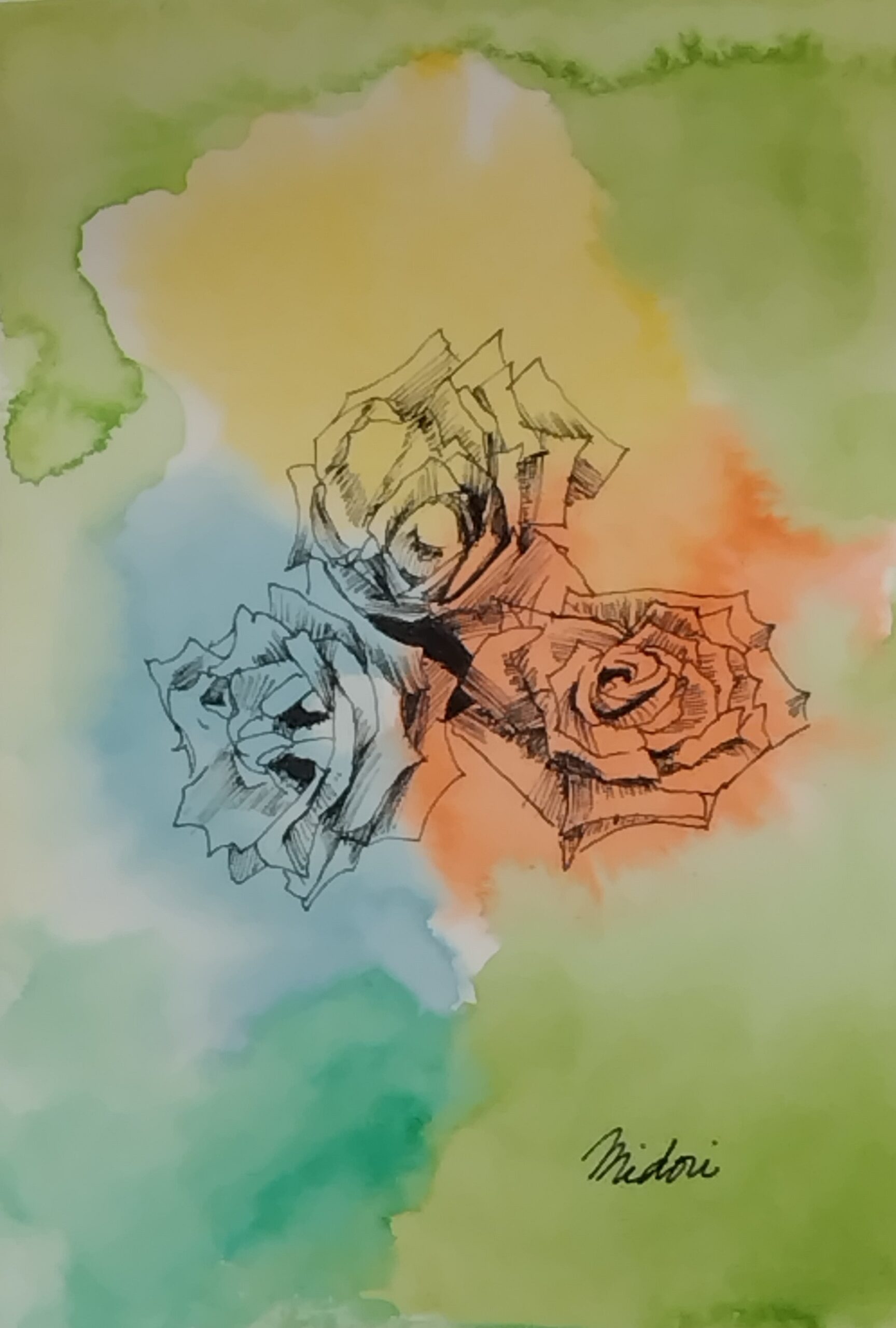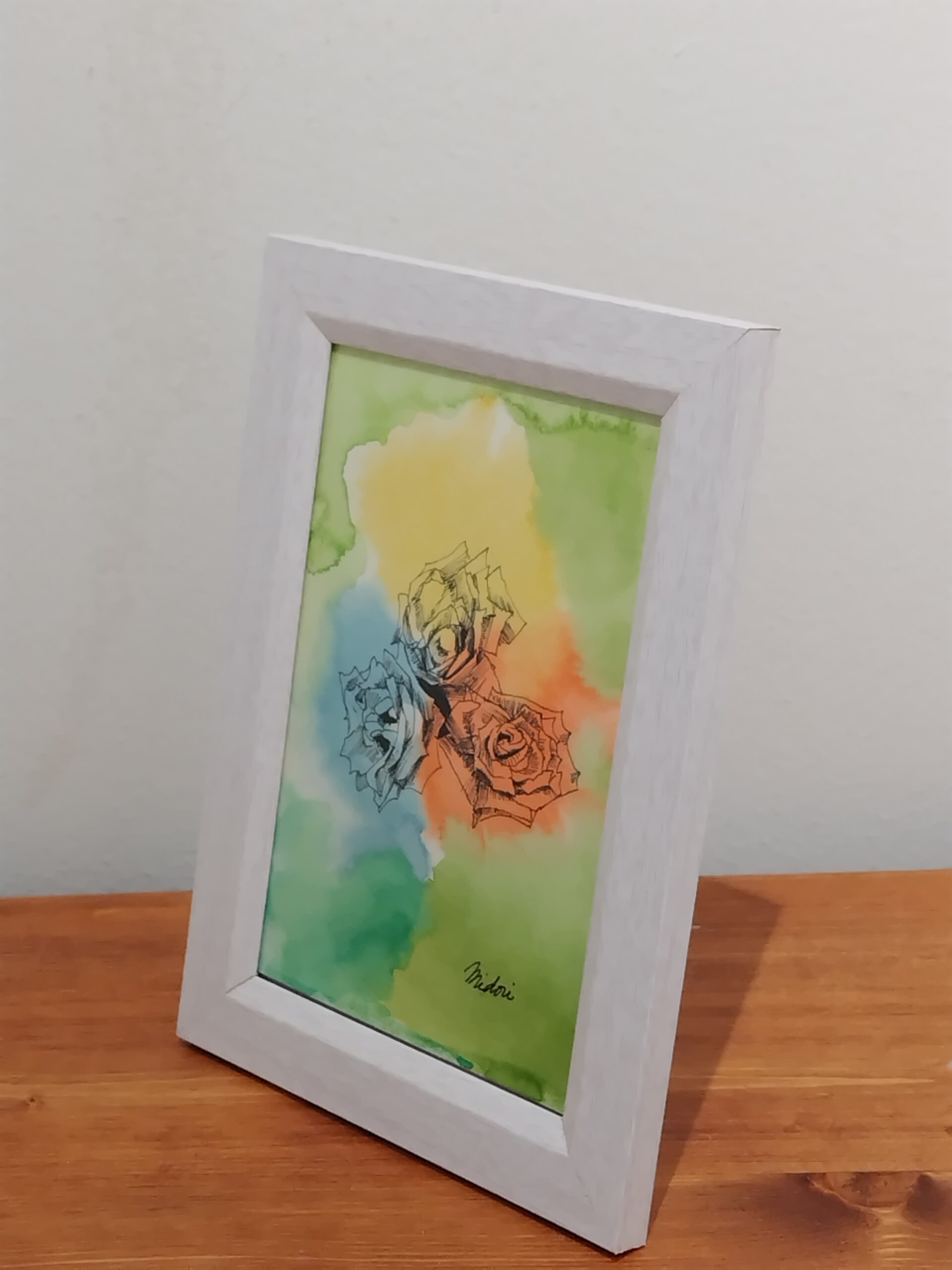 植物園の薄紫の3輪の薔薇を見て、三原色の薔薇が並んだらもっと美しいかなと思い、水彩紙に水彩を鮮やかにふんわり置き、その上に黒色のペンで精緻に三原色の薔薇を3輪描きました。これらの薔薇がお部屋を明るくすることを願っております。
