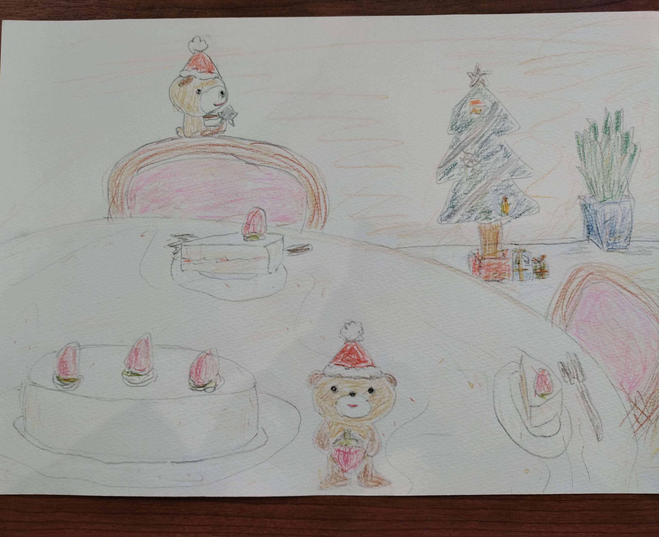 クリスマスケーキがあって、くまが遊んでいます。