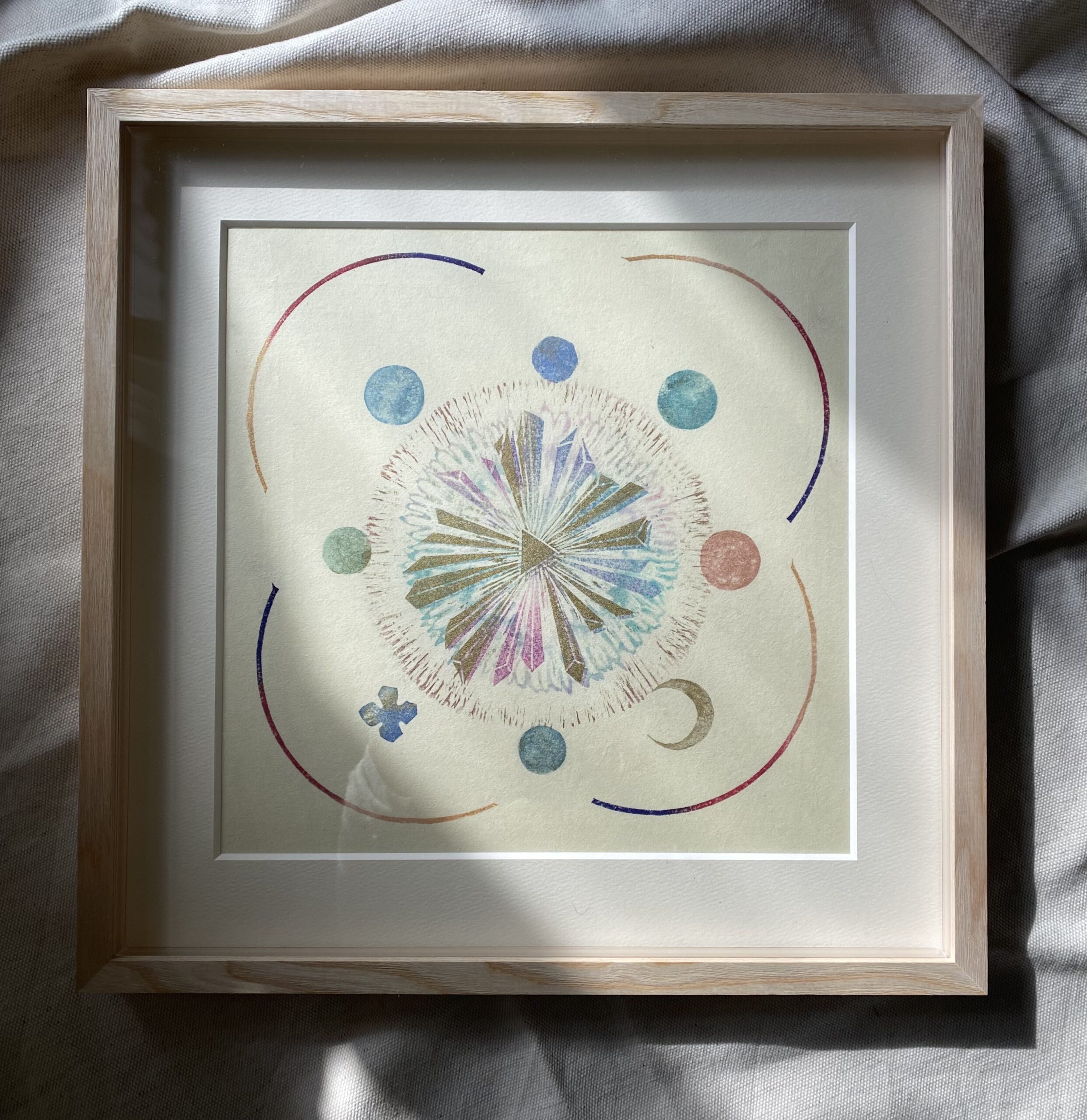 S4サイズに近いサイズで、額外寸が350mm×350mmの正方形の作品です。無垢のフレーム内にマット付き。宇宙が奏でる音の響きをイメージしたシリーズです。