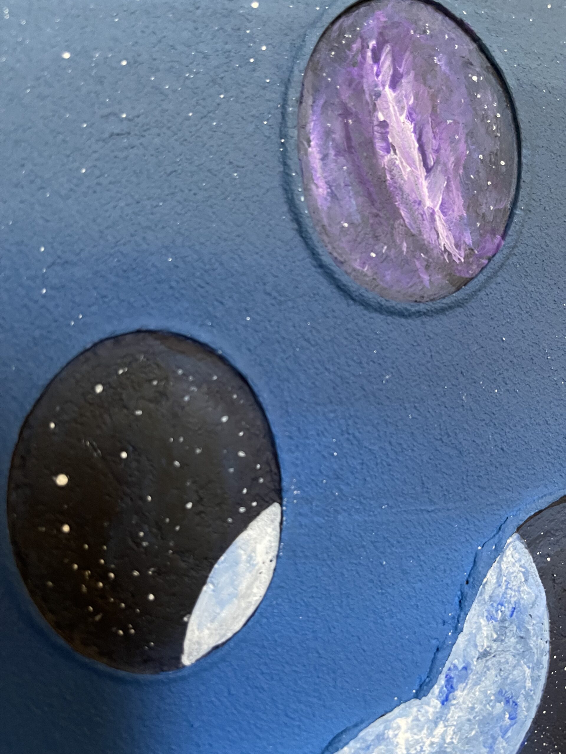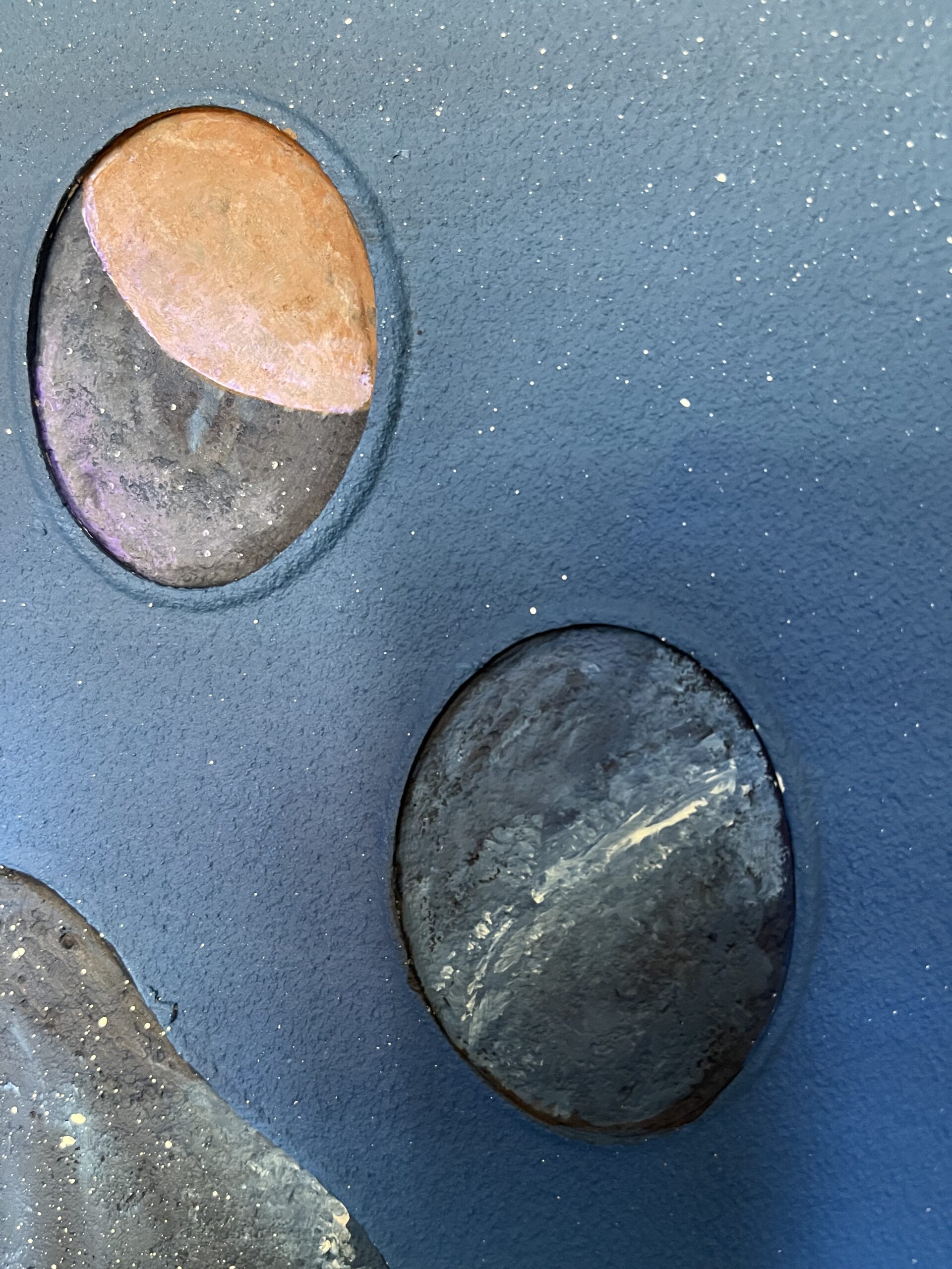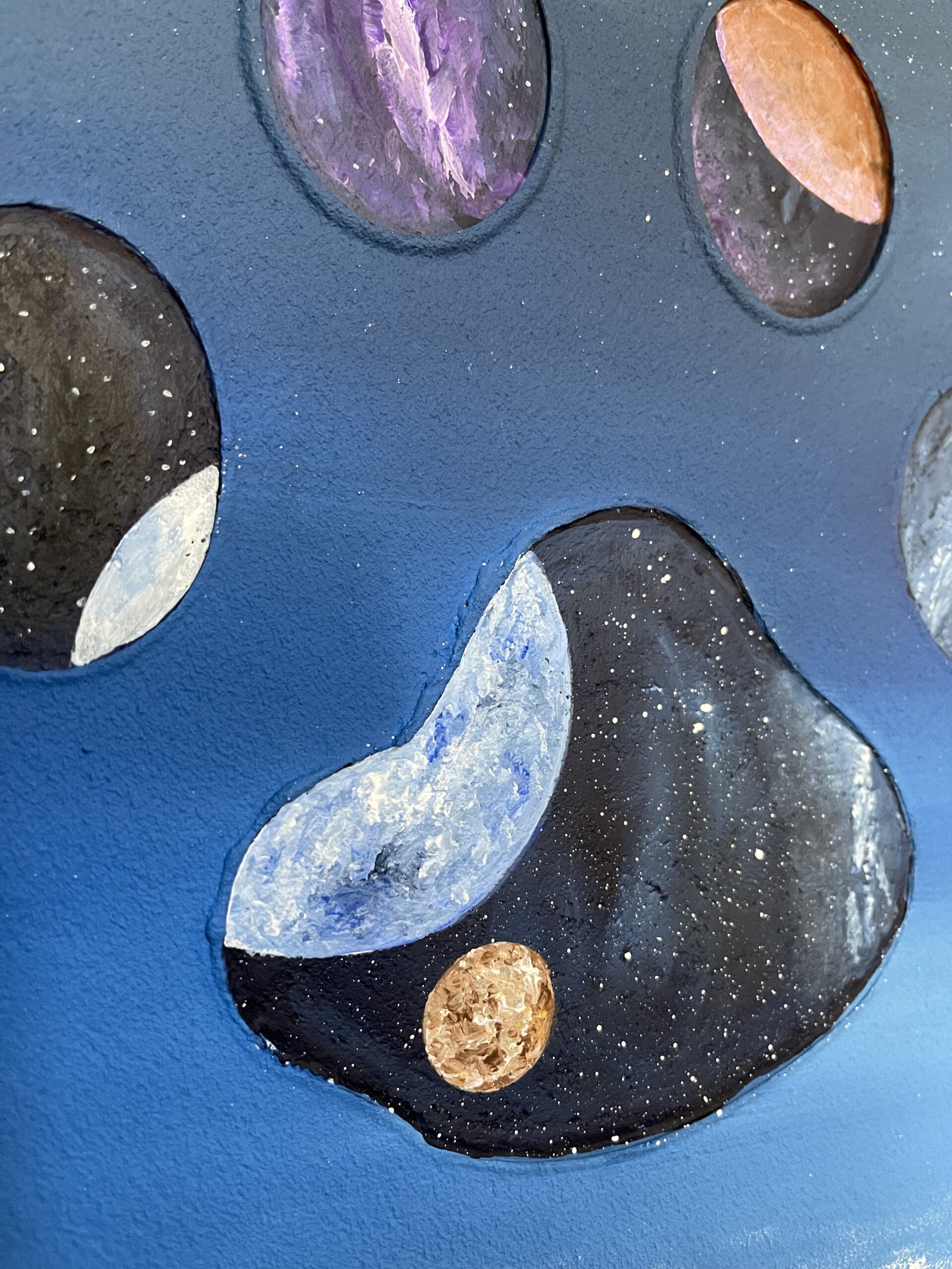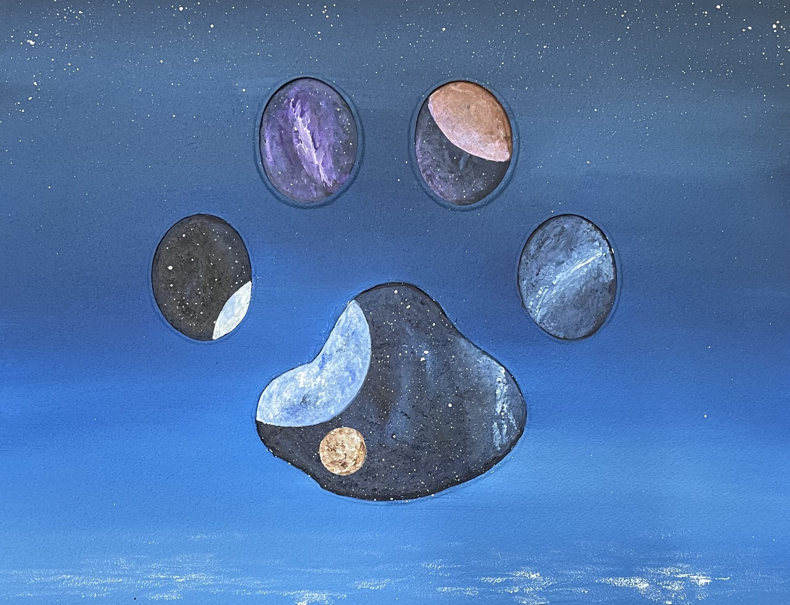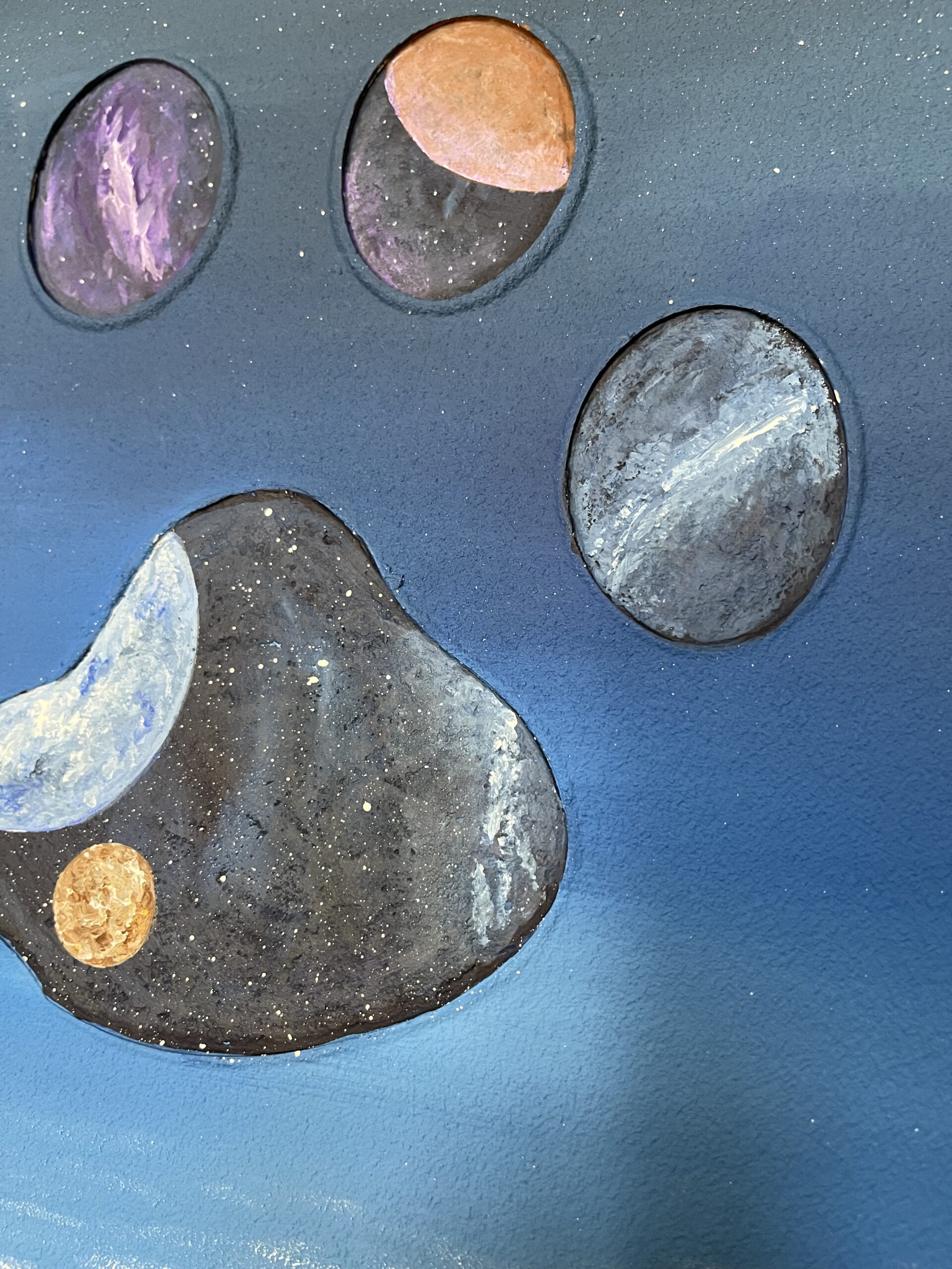 砂骨塗料をコテでベースを作り肉球の型取りをしてその後絵を描いたアート作品。