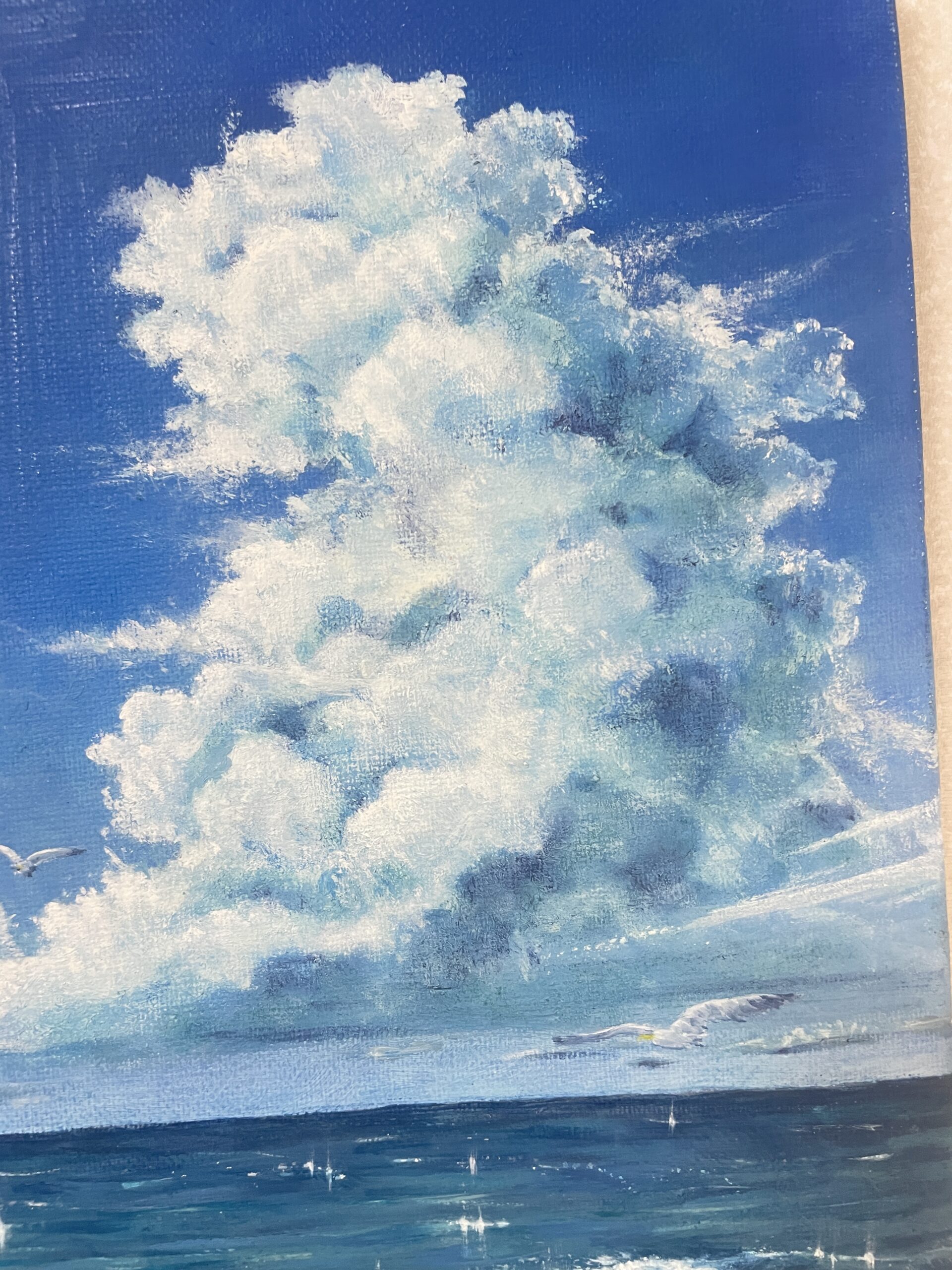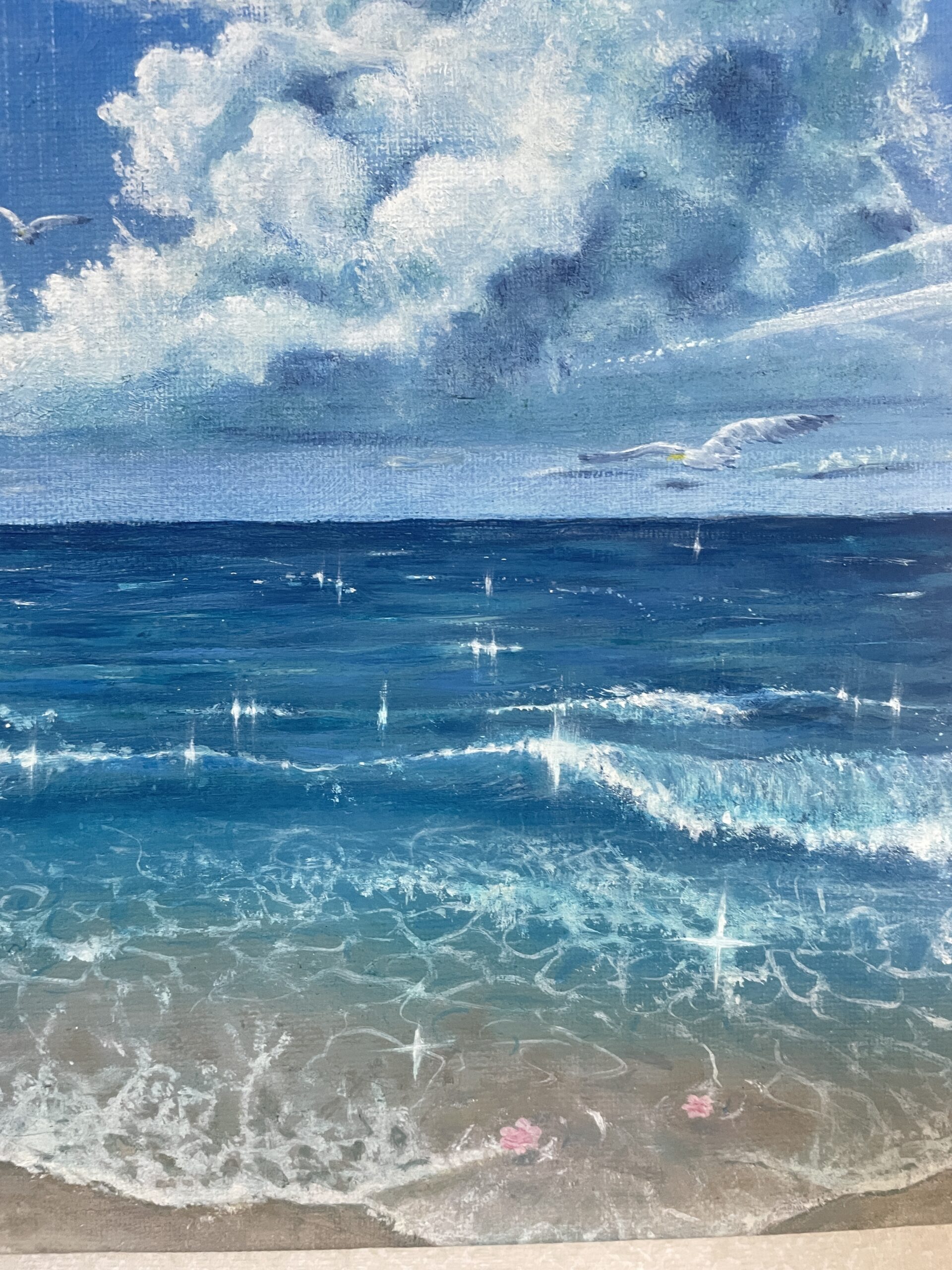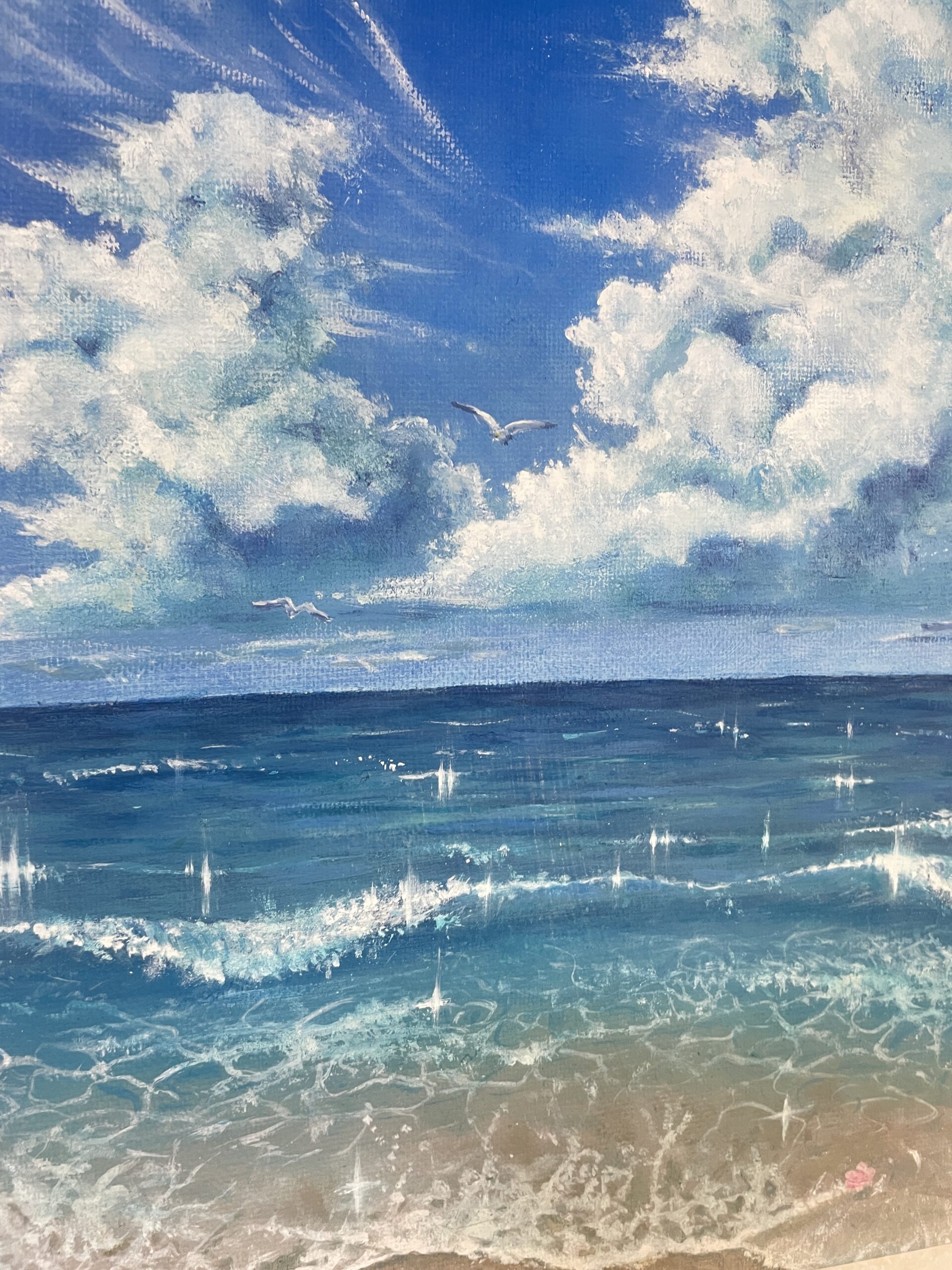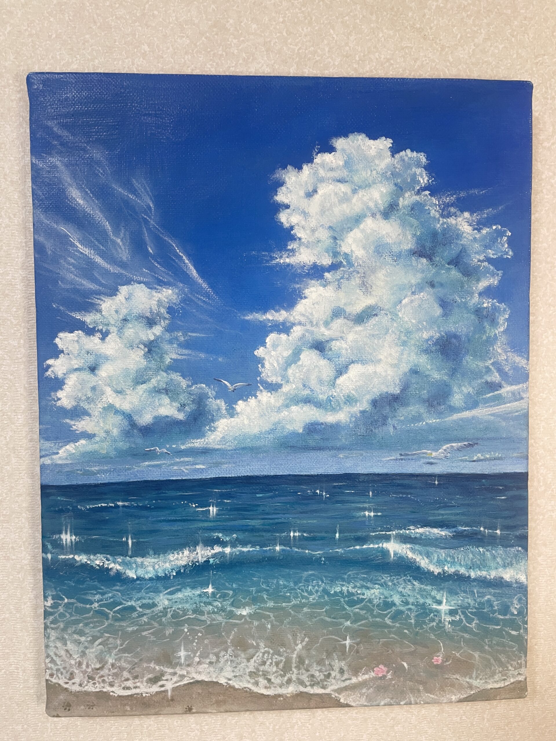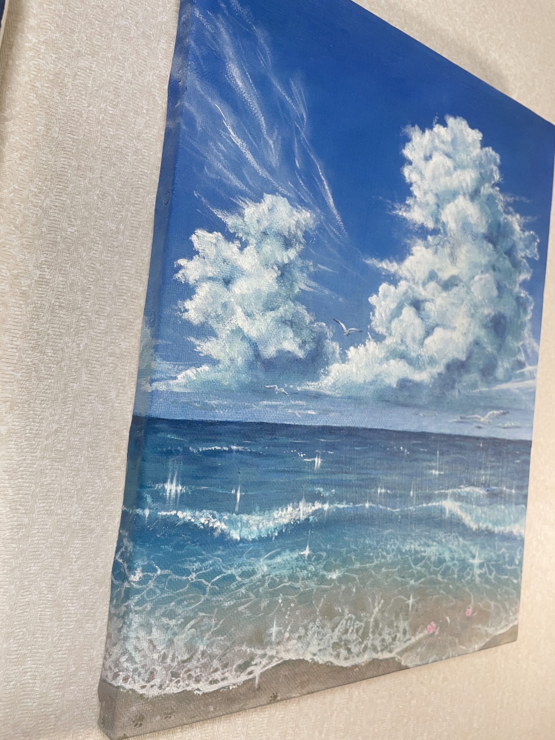 青が好きで、光を受けて輝く海や「夏らしい」と感じる景色を思い浮かべながら制作しました。
