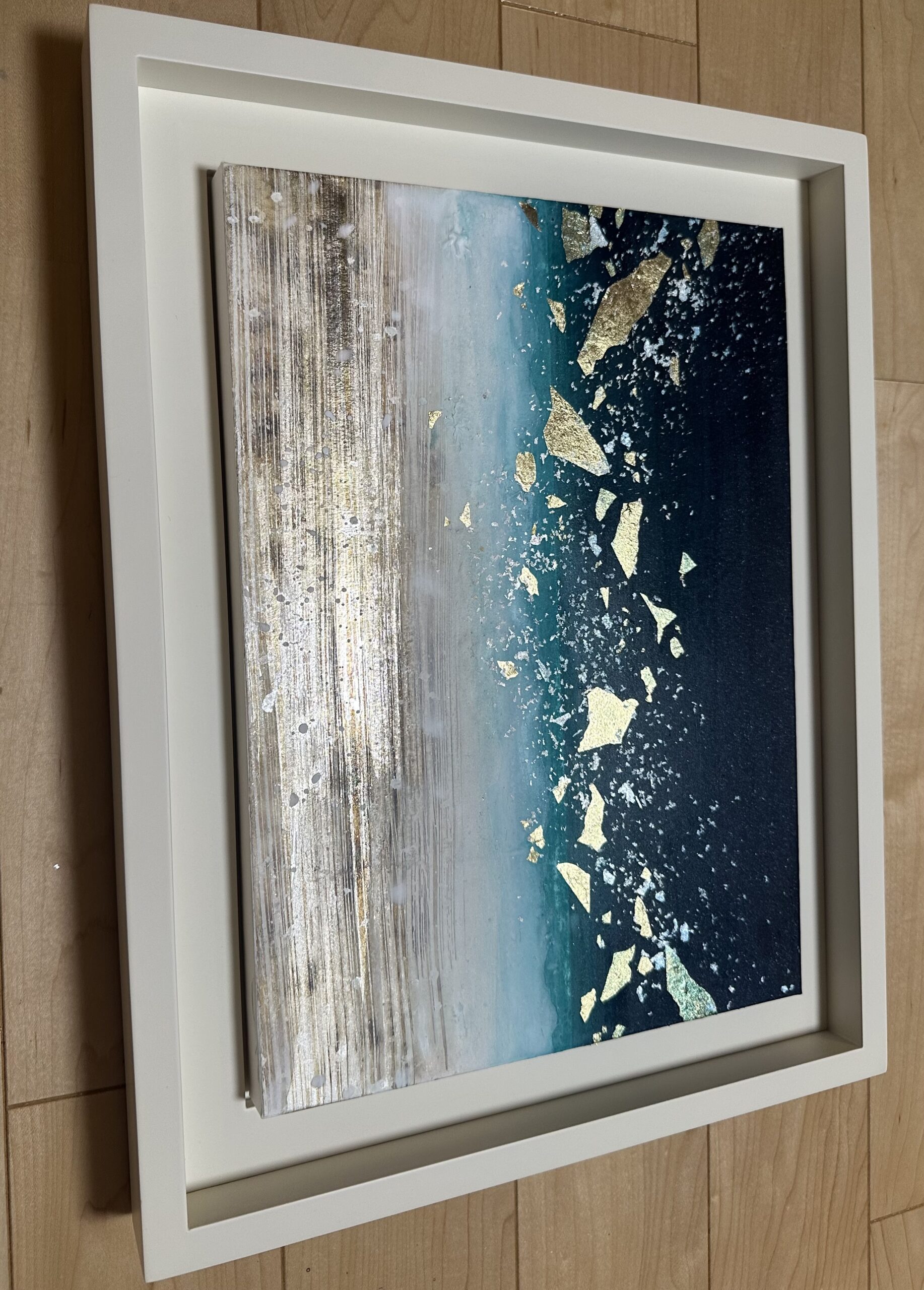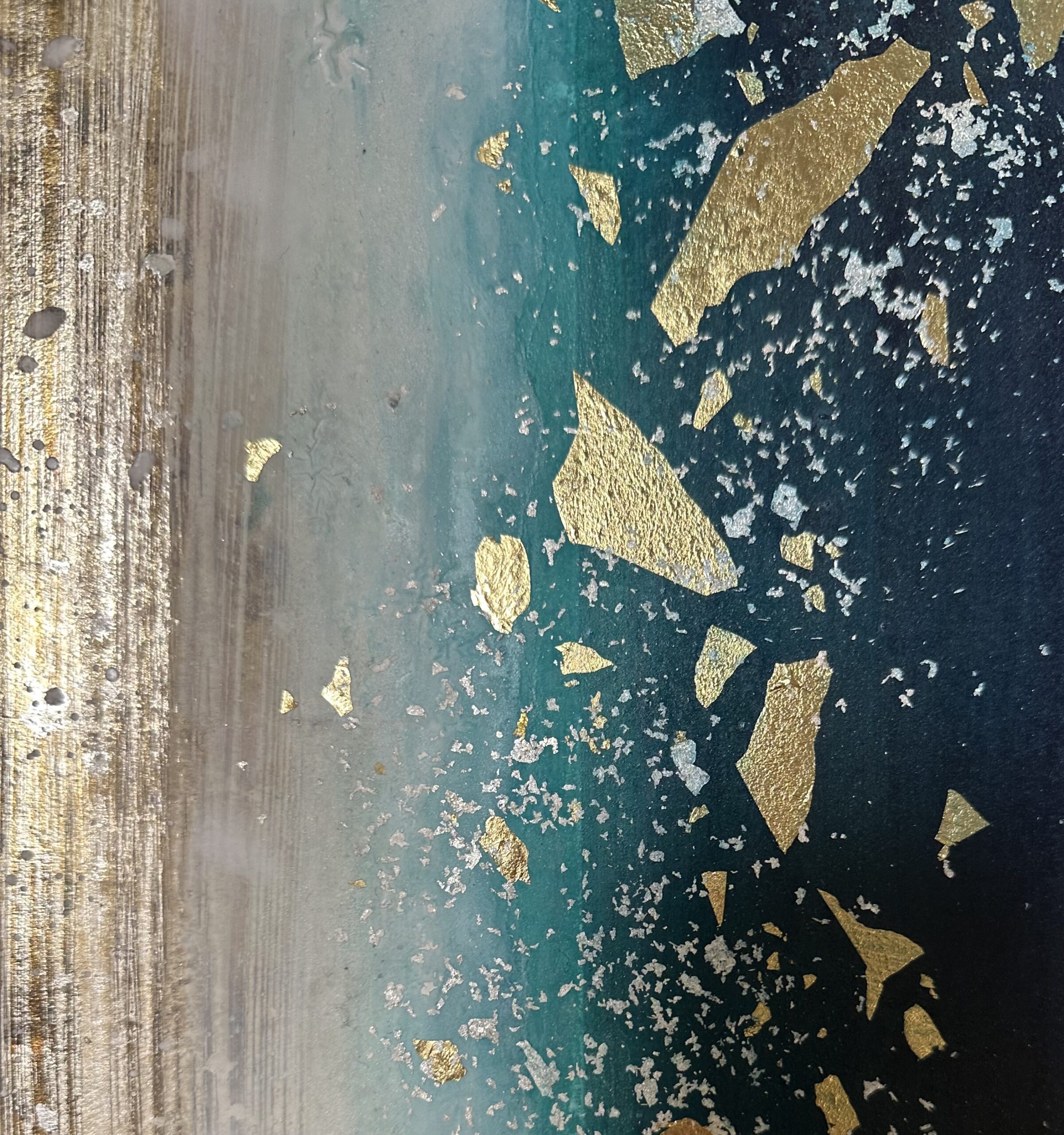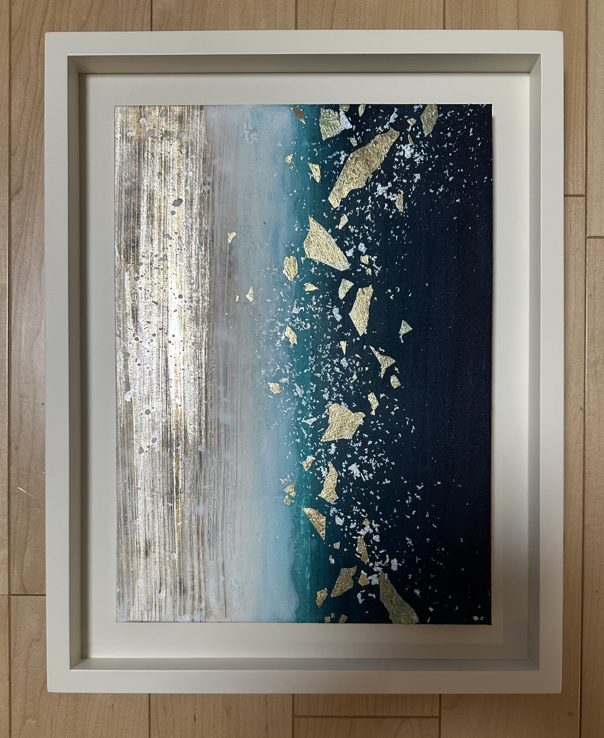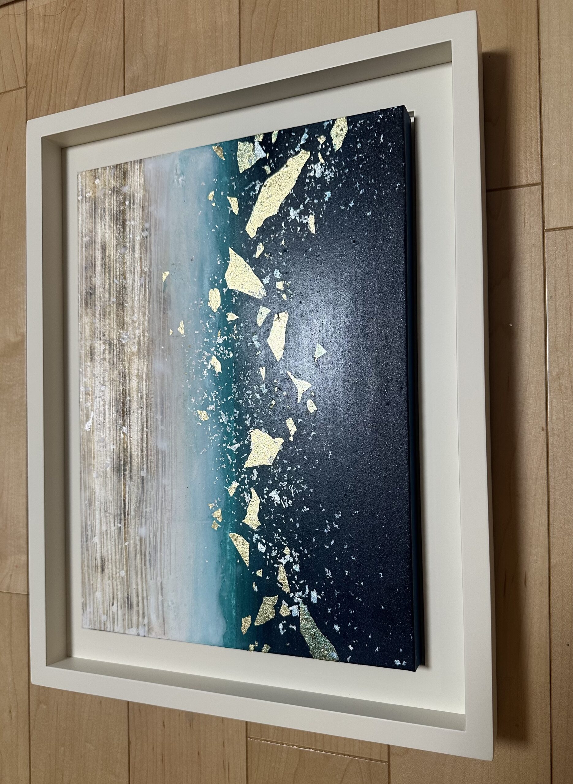 箔を使用した作品は、光のあたり方によって輝き方が変わります。日中の窓から入る自然光、夜の照明の光など、光の違いにより表情がかなり変わります。また、箔の変色を抑えるためのコーティングをしておりますが、時間経過とともに少しずつ色味が変化します。その変化もお楽しみいただけますと幸いです。