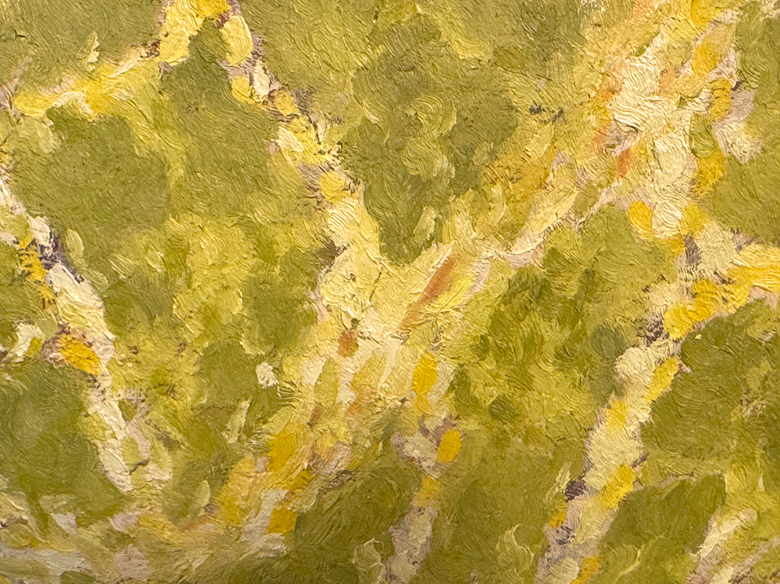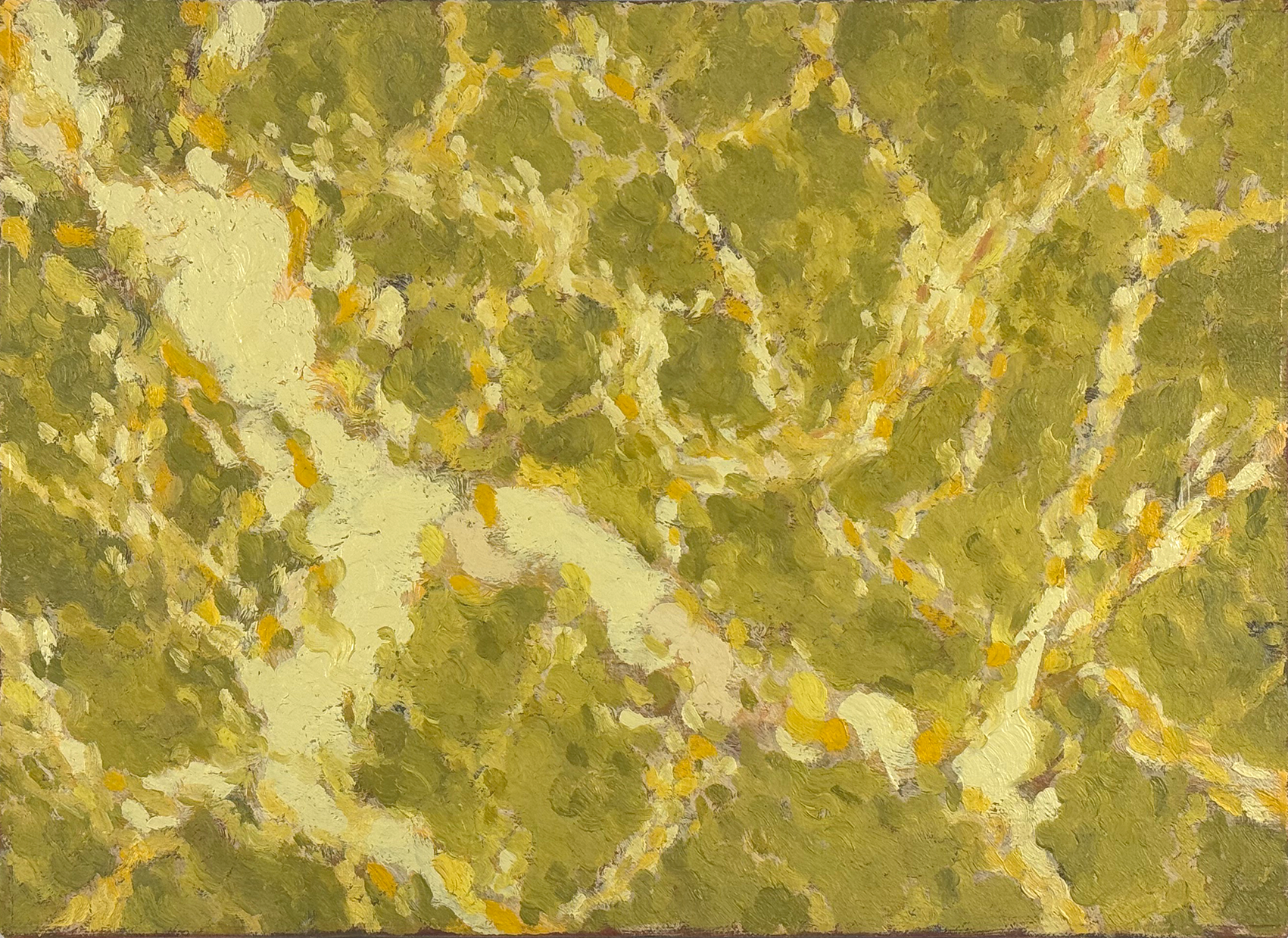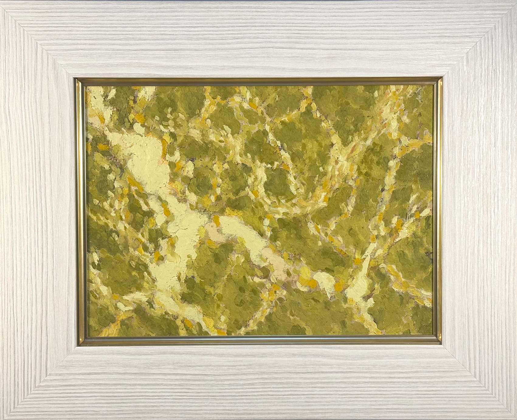 葉っぱの葉脈(ようみゃく)をマクロレンズで観察して、葉っぱの厚みの中を流れる感触を描きました。描きこんでいくうちに、太い葉脈が踊る人がひらりと去っていくところのように見えてきて、「往(ゆき)」と名付けました。