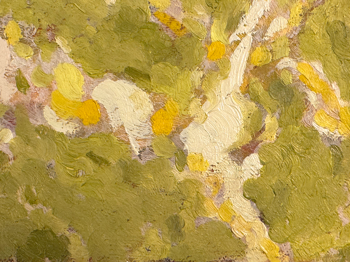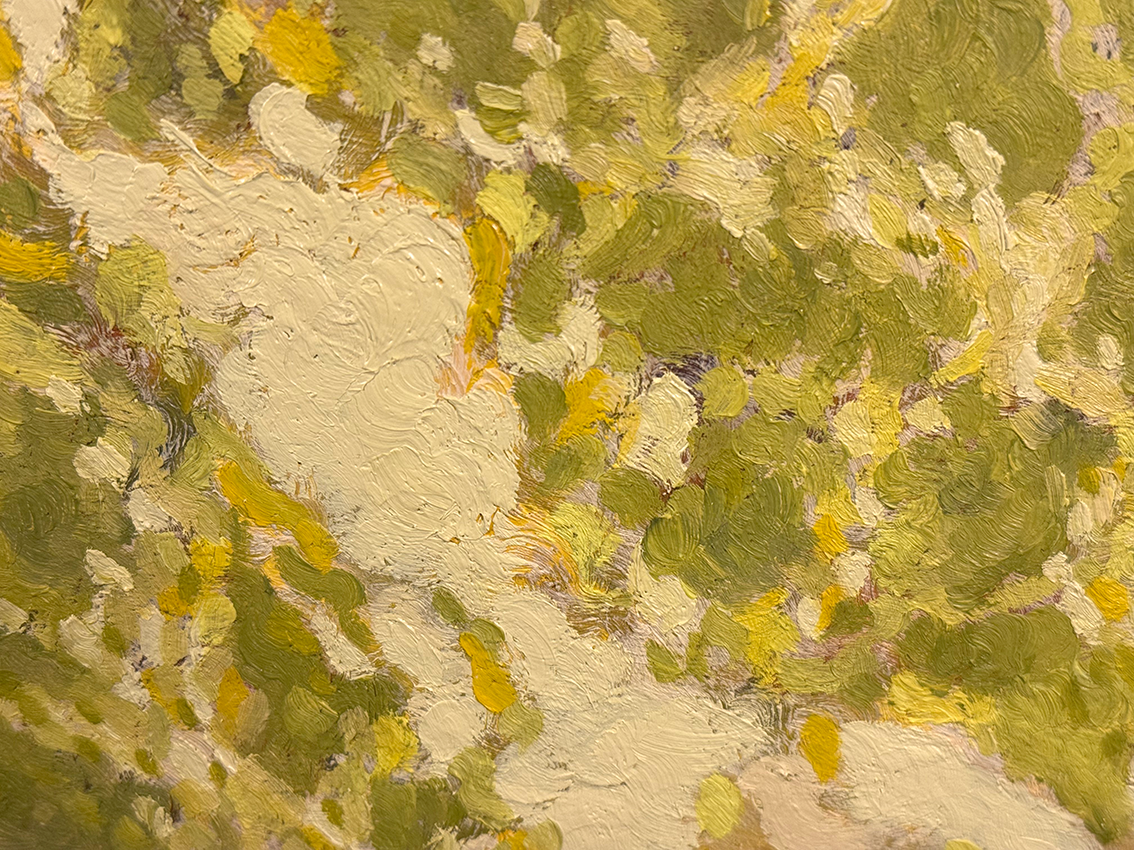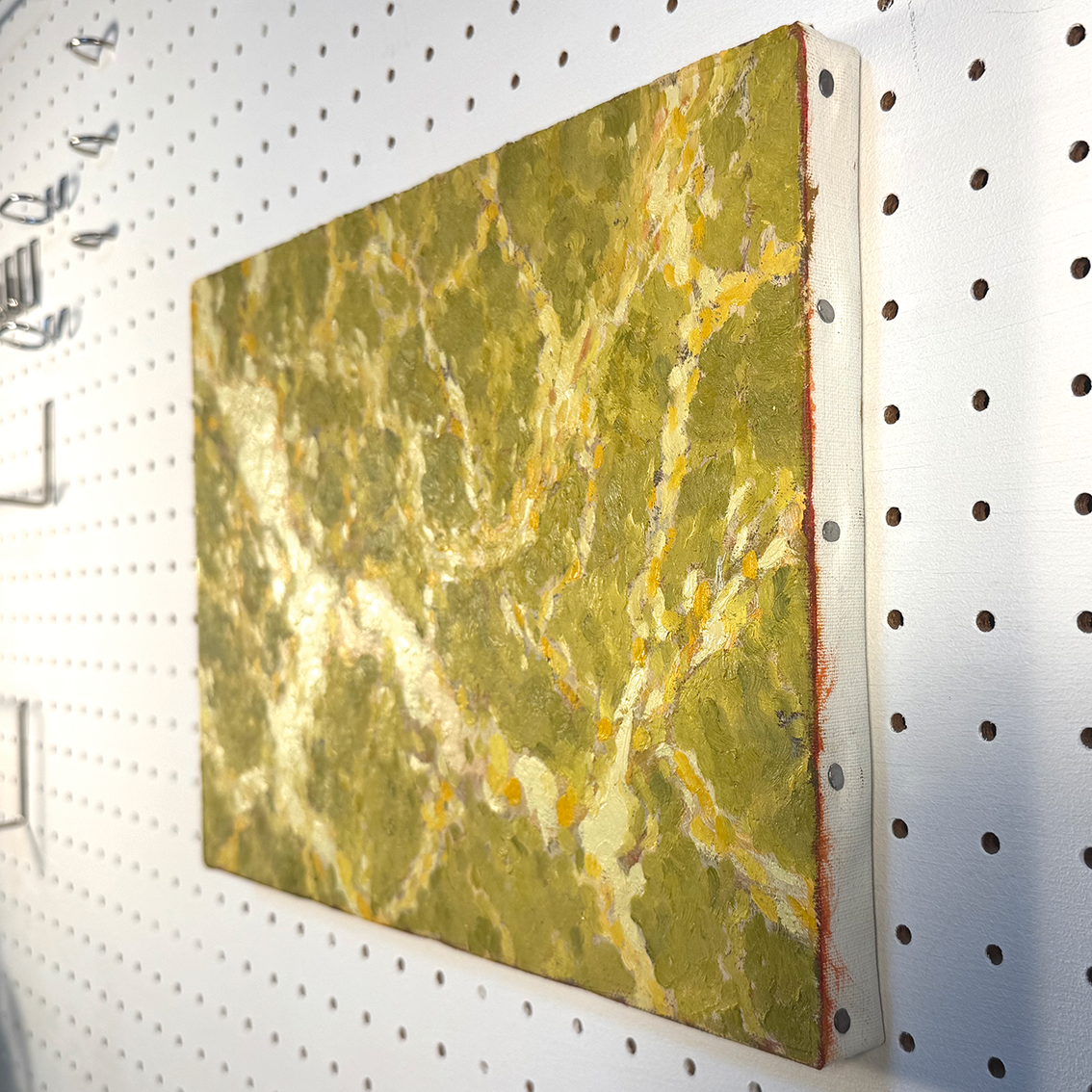 葉っぱの葉脈(ようみゃく)をマクロレンズで観察して、葉っぱの厚みの中を流れる感触を描きました。描きこんでいくうちに、太い葉脈が踊る人がひらりと去っていくところのように見えてきて、「往(ゆき)」と名付けました。
